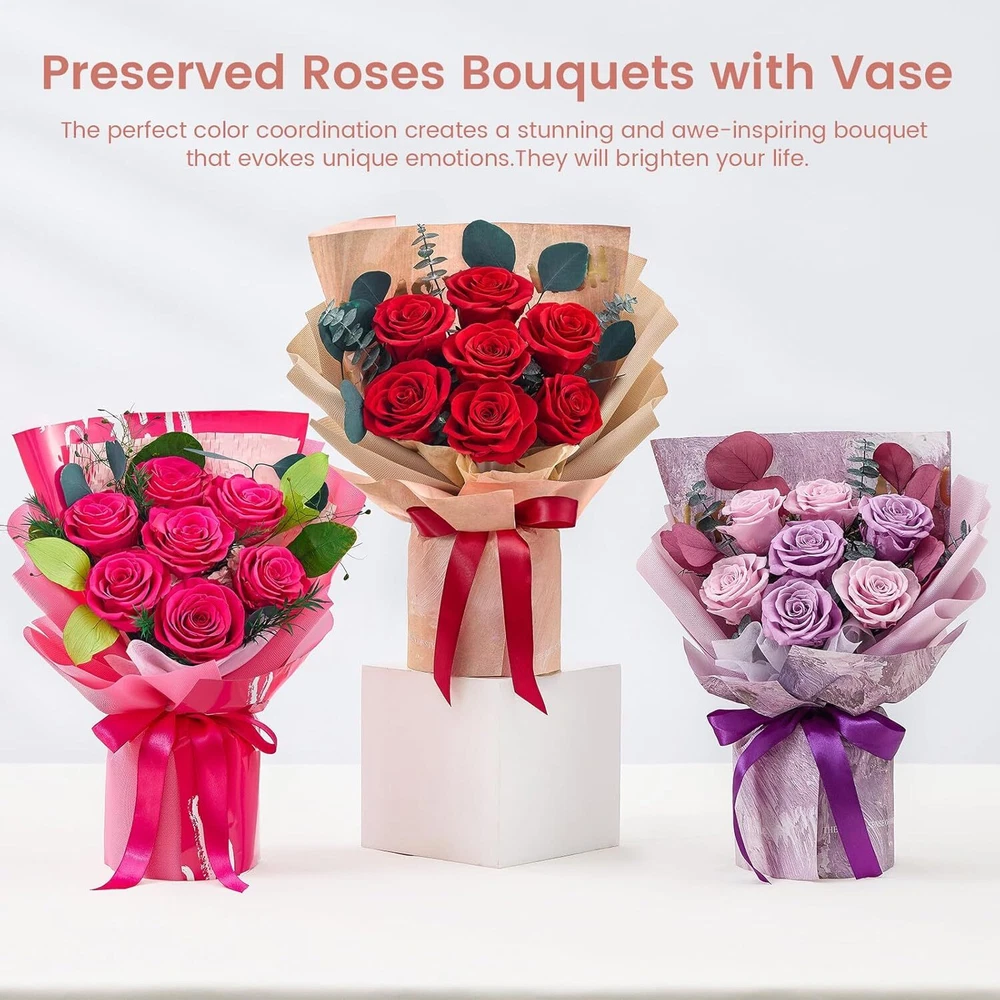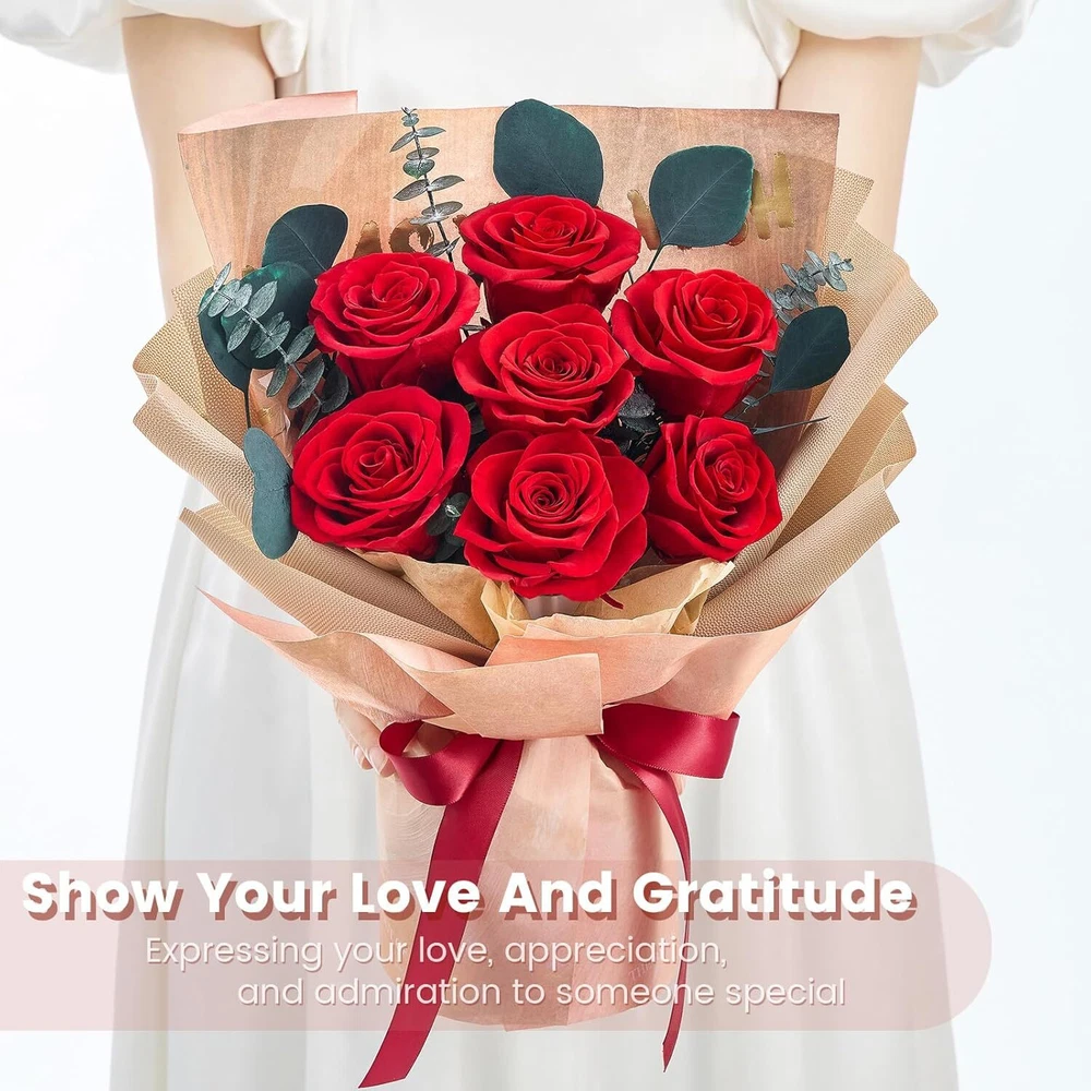 Roses Bouquet 7-Piece Forever Flowers Bouquet Flowers Fresh Bouquet Gift for Women Wife Valentines Day Mothers Day Christmas Anniversary Birthday Graduation (Red Roses) Product Details Product Dimensions: 8.5 x 5 x 13.5 inches Item Weight: 1.23 pounds Manufacturer: Mosstory Item model number: Redhs Batteries required: No 100% Real Roses: The 7 piece preserved roses bouquet have long lasting beauty that will sustain their shape and color for over a year. The flower preservation process has been perfected so the preserved roses will look as natural roses as fresh as the day they were picked. Pick a bouquet for her to show your feelings Handmade Bouquets: The beautiful forever bouquets are designed and handmade by skilled florists, which is elegant and charming. They are handcrafted from real Roses, hydrangea, and eucalyptus apple leaves,etc Romantic Gifts for Women: The flowers bouquet is a unique and romantic gift to impress others in any occasions, such as Valentines Day, Anniversary, Birthday, Mothers Day, Thanksgiving Day, Christmas Day, Weddings and Graduation Exquisite Packaging: Packaged in our carefully designed gift box, no need to repackage. The roses bouquets are secured in the box to ensure the bouquets are not damaged during transportation No Maintanenc:No water or sunlight needed for this rose bouquet. Our rose bouquets not only last for more than a year, but they don't require any work or maintenance from you, you just need to store them in a normal environment (avoid humidity and direct sunlight)