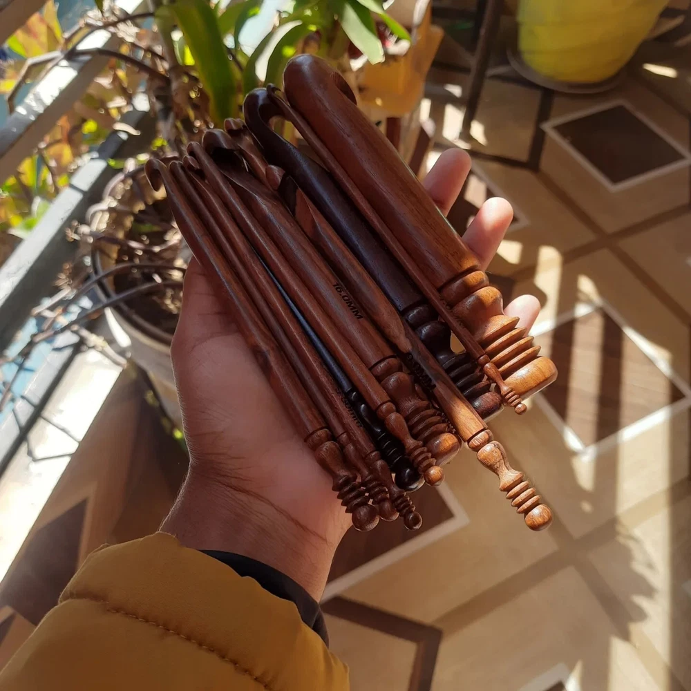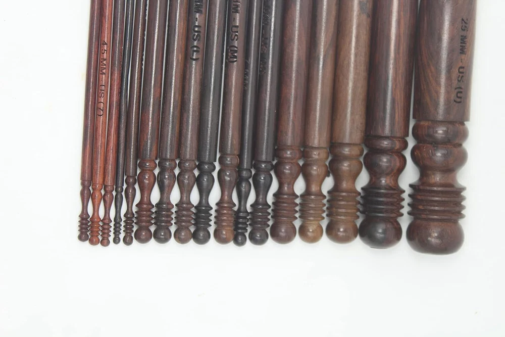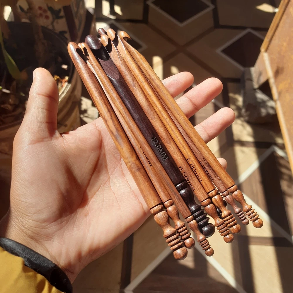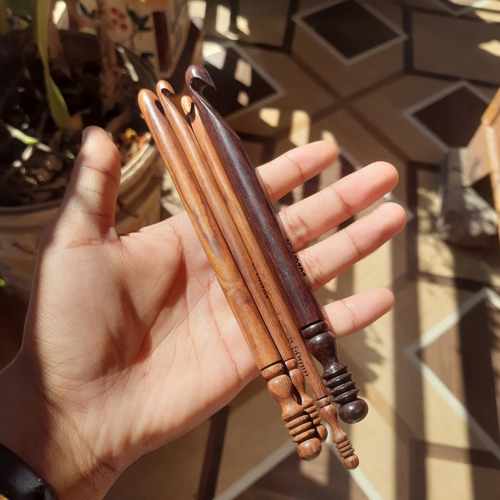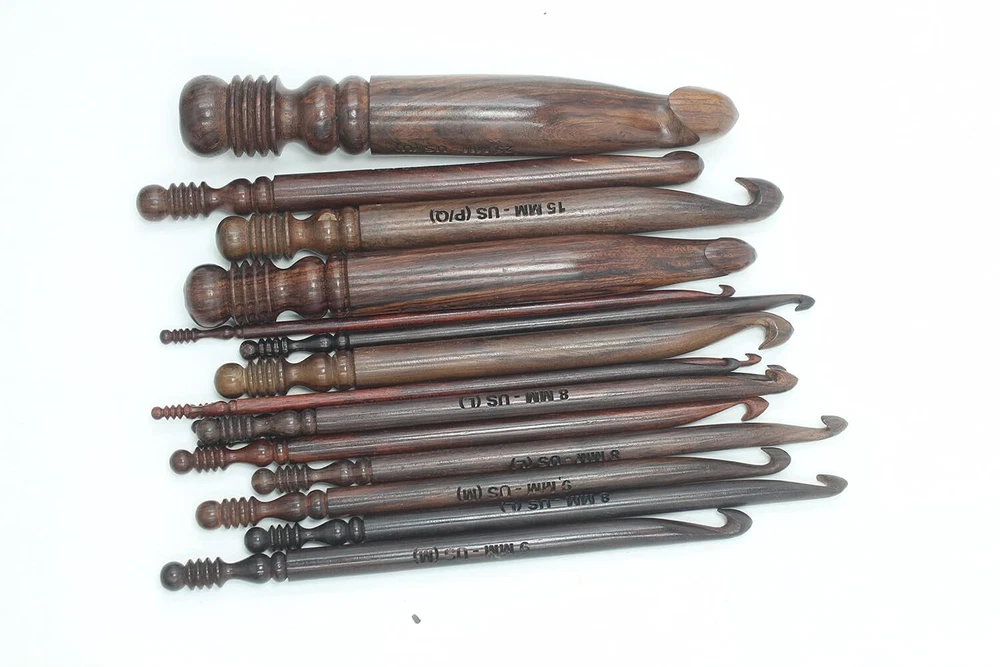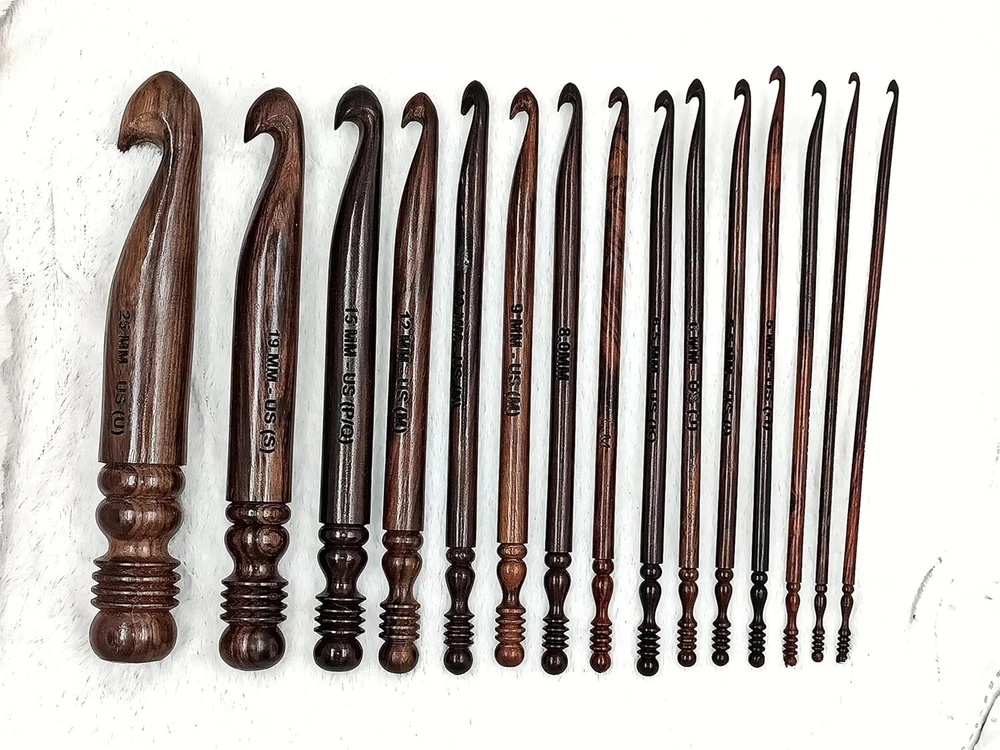 Enhance your crocheting experience with this set of 15 rosewood ergonomic crochet hooks. The soft grip handles provide comfort and reduce strain on your hands, allowing you to crochet for longer periods of time. These hooks are available in sizes ranging from 3.5 MM to 25 MM, ensuring you have the perfect size for any project. Crafted in India, these hooks are made from high-quality rosewood and are built to last. Whether you're a beginner or an experienced crocheter, this set is perfect for you. Ideal for a variety of crocheting projects, these hooks are a must-have for any needlecraft enthusiast.