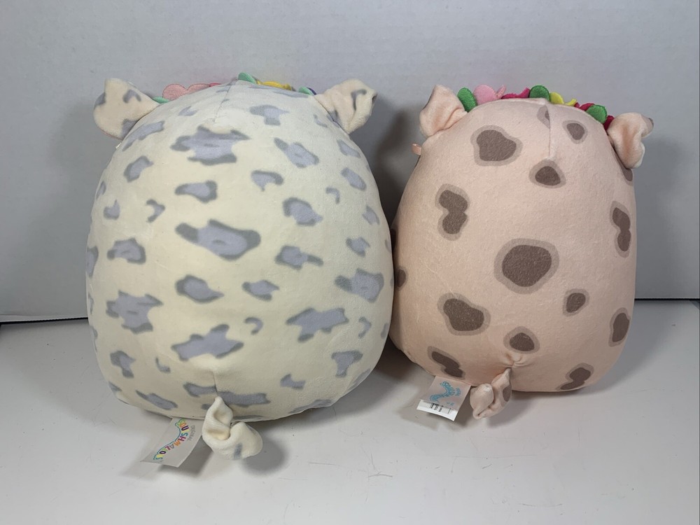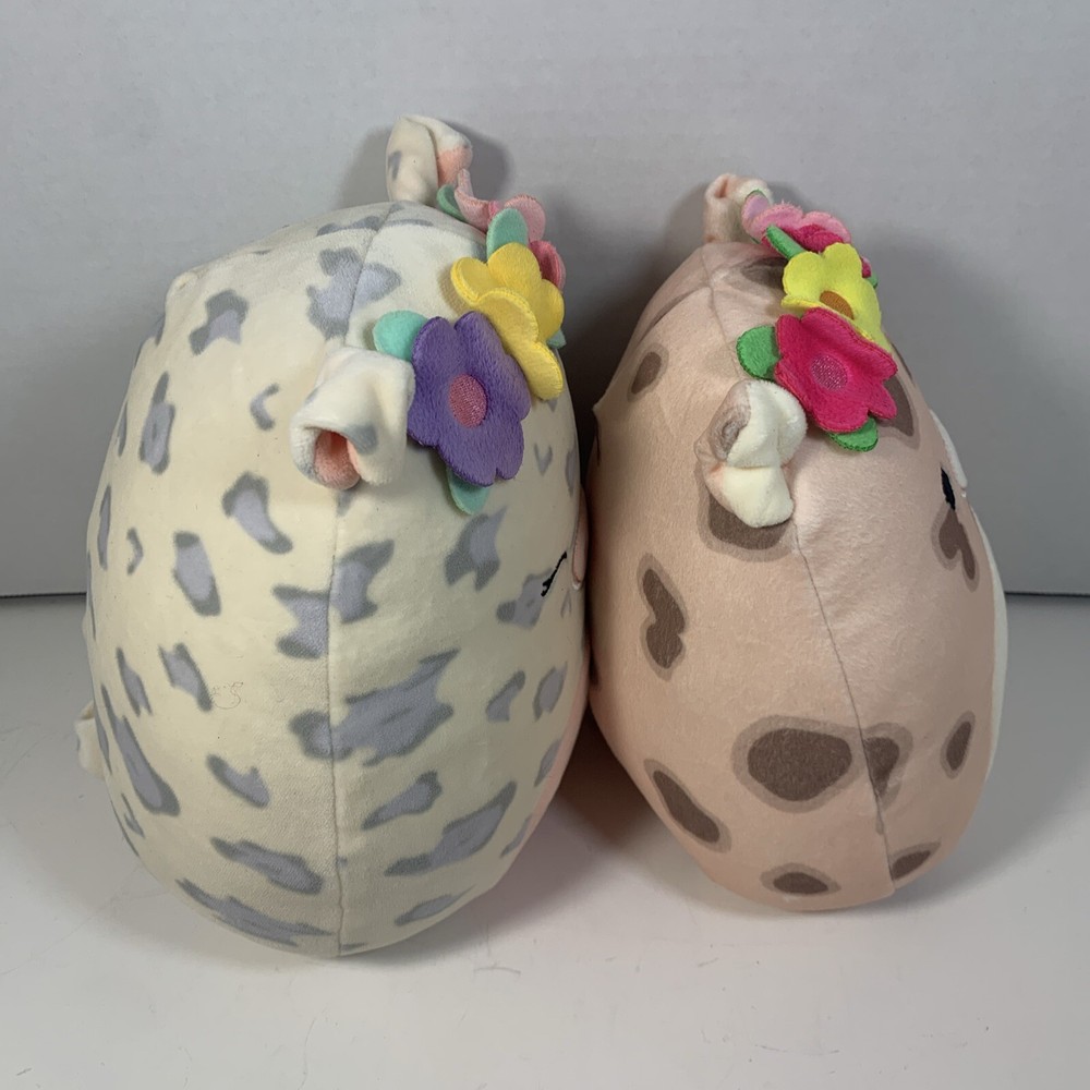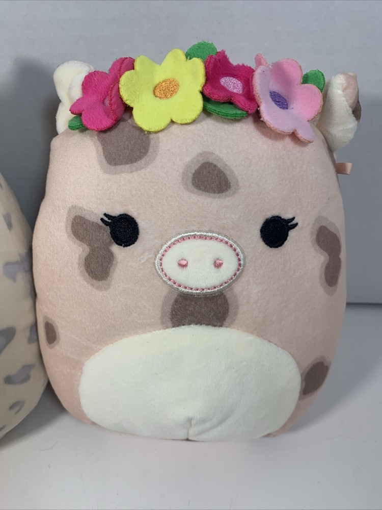 Rosie & Aquitaine Squishmallow Spotted Pigs w/flower crowns plush set, Kellytoy Rosie, 2023 approximate dimensions: 8" tall 8" wide 6" thick Aquitaine, 2021 approximate dimensions: 7.5" tall 7" wide 5" thick