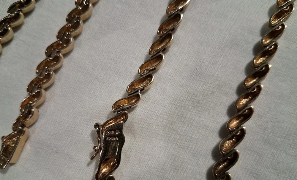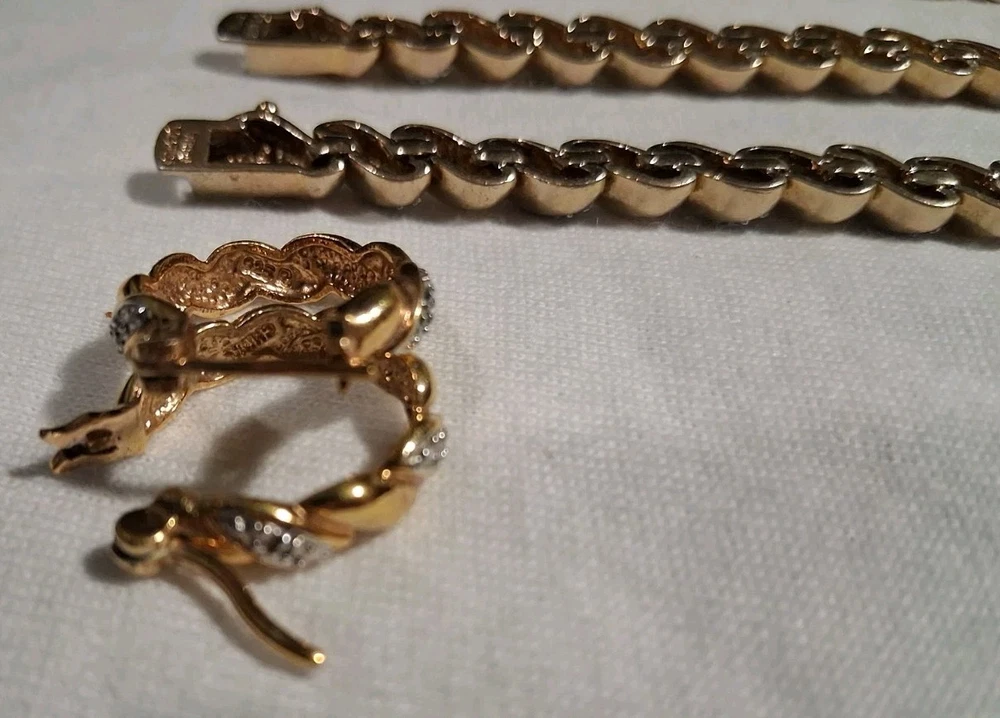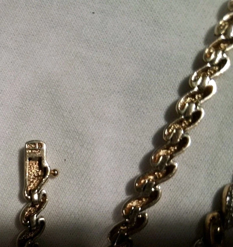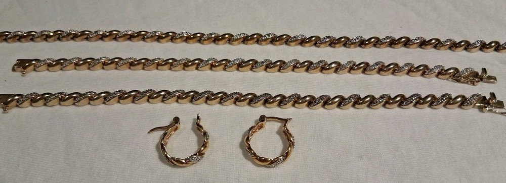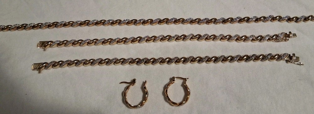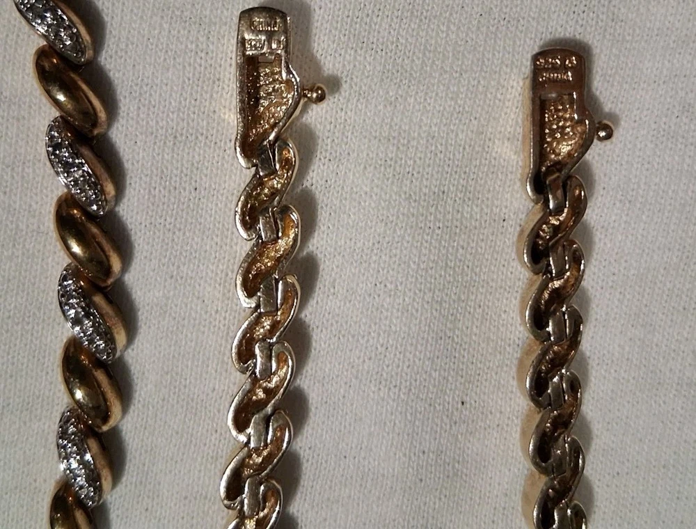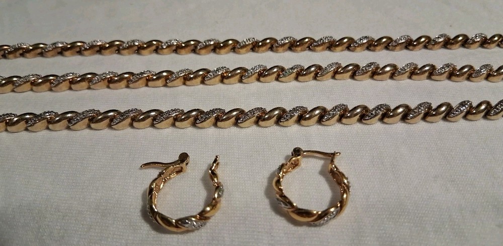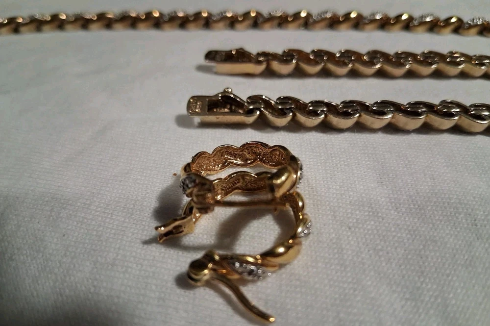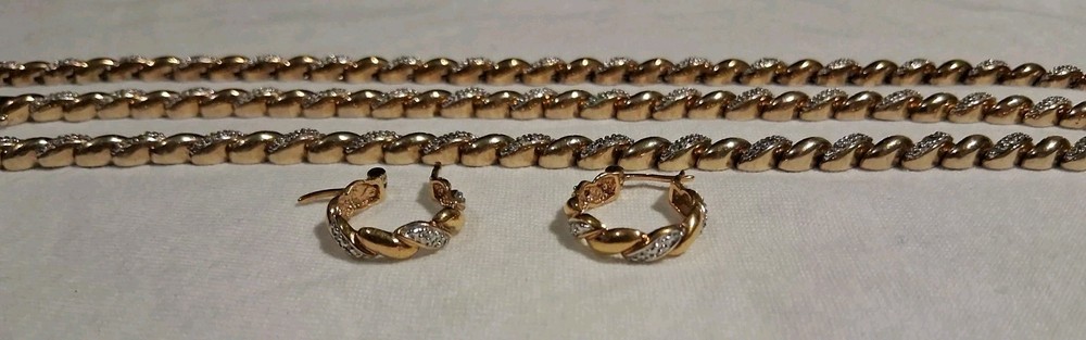 This Ross Simmons 925 Tennis Style Necklace, Bracelet, and Earrings set is a stunning vintage piece crafted with 18K yellow gold overlay over a 925 sterling silver Base. The set features diamond chips as the main stone. The jewelry set includes a Necklace that is 17.5 inches in length, (2) identical bracelets that are 7.5 inches in Length, Also Included is A Pair Of Matching Earrings. The Total Carat Weight of the Entire set is 29.5 Grams.
