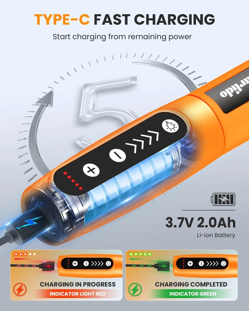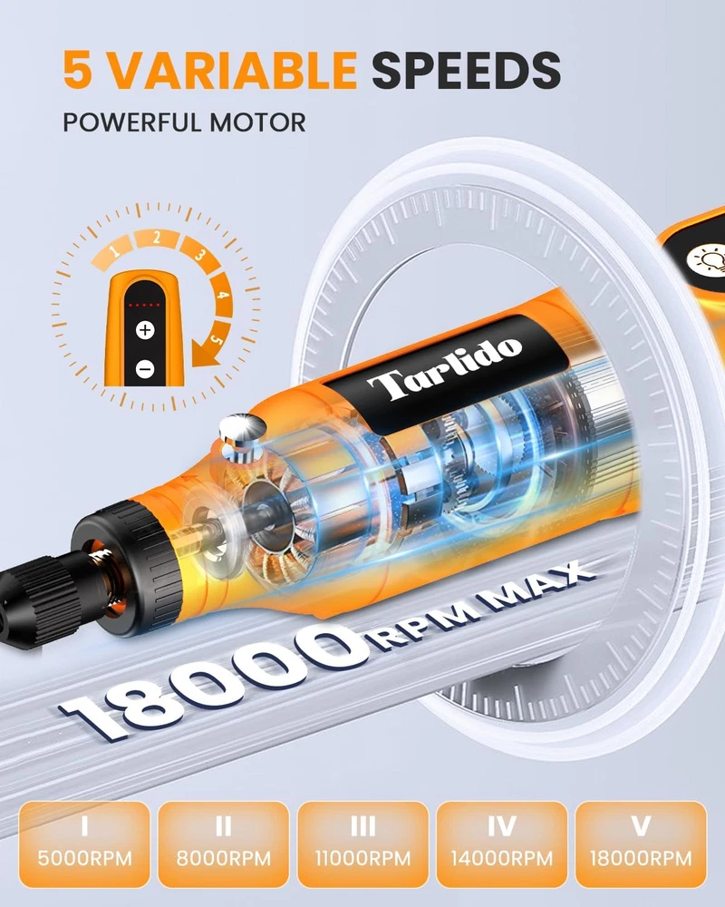 【5-Speed Variable】The 3.7V Tarlido rotary tool is cordless but still can generate strong and steady power. 5 variable speeds from 5,000 to 18,000 RPM, allowing for flexible adjustment of rotation speed. Also, it can remember the gear setting in 5 mins, so you don't have to constantly adjust the speed during short intervals. After 5 mins, it will go back to the default gear. Fulfill almost all your needs on DIY and home improvement project. 【High Speed Powerful Motor】This rotary engraving tool has a 18,000 RPM motor, the motor runs stably at high speed, and it is not easy to heat up for a long time. Pen-type push switch, pen press, sensitive contact switch, easy to operate. 【Ergonomic Design】This cordless rotary tool pen is like a writing pen, with a comfortable grip, small and flexible, and easy to carry. High-precision, precise pure copper collet design. Enable consumers to have a better experience during use. 【Wide Application】This engraving tool supports you to beautify and engrave on any material suppliers, such as glass, wood, egg, plastic, jewelry, ceramic, leather, rings and so on. 【Package Contents】It includes an rotary tool,sand bands* 10,sand drums * 1,transfer rod * 1,stainless steel cutting pieces * 1, aluminum oxide grinding head * 1,cone shaped diamond carving head * 1, woolen connecting rod * 1,1.0mm drill bit * 1,2.3mm drill bit * 1,1.0mm clamp head * 1,2.3mm clamp head * 1, sandpaper*10, tpye-C charging cable * 1. If you have any questions, do not hesitate to contact us, we will solve any problems for you within 24 hours. Product Description 1 Sanding 2 Cutting 3 Grinding 4 Drilling 5 Carving