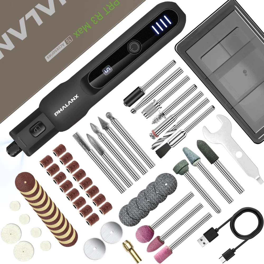 ๐๐จ๐ฐ๐๐ซ๐๐ฎ๐ฅ ๐๐จ๐ญ๐จ๐ซ & ๐๐จ๐ฐ ๐๐จ๐ฐ๐๐ซ ๐๐จ๐ง๐ฌ๐ฎ๐ฆ๐ฉ๐ญ๐ข๐จ๐ง: PHALANX rotary tool uses an enhanced strong motor, the output is more powerful than the traditional motor, with maximum speed as high as 20000RPM. While effectively controlling vibration and noise to provide stable output. The engraving tool is ideal for polishing and sanding pet nails, Light DIY Projects, and Wood Sanding. (Please fully charge the rotary tool cordless before the first use) ๐-๐๐ฉ๐๐๐ ๐๐๐ญ๐ญ๐ข๐ง๐ ๐ฌ & ๐๐๐ ๐๐ข๐ง๐ ๐๐จ๐ซ๐ค ๐๐ข๐ ๐ก๐ญ: PHALANX mini rotary tool has 5-speed variable speed adjustment from 5,000 to 20,000 RPM, can meet the gears and speeds required for different light load projects. The power rotary tool is equipped with 4 high-brightness LED work lights around the rotating drill bit, illuminating the entire work area in low-light environments, reducing backlight shadows, ensuring work accuracy. For example, polishing pet nails or resin objects. ๐๐ง๐ญ๐๐ฅ๐ฅ๐ข๐ ๐๐ง๐ญ ๐๐๐ฆ๐จ๐ซ๐ฒ & ๐๐จ๐ฆ๐ฉ๐๐๐ญ ๐๐ข๐ ๐ก๐ญ๐ฐ๐๐ข๐ ๐ก๐ญ: PHALANX cordless rotary tool will intelligent memory function for the current set gear within 5 minutes of shutdown. After 5 minutes, it will return to the default 3rd speed, no need to frequently adjust the tool speed when shutting down the machine to check the work. The anti-slip rubber layer on the surface of the mini grinding tool makes it comfortable to hold and you will not feel tired when working for a long time. ๐๐๐ซ๐ ๐ ๐๐๐ฉ๐๐๐ข๐ญ๐ฒ ๐๐๐ญ๐ญ๐๐ซ๐ฒ & ๐๐ฒ๐ฉ๐-๐ ๐ ๐๐ฌ๐ญ ๐๐ก๐๐ซ๐ ๐ข๐ง๐ : PHALANX rotary tool cordless has built-in a 2000mAh battery, ensure that the polishing tool runs longer. Mini power tools have built-in integrated power and gear display panel display clearly, so there is no need to worry about the battery suddenly running out. Type-C charging interface and charging cable, compatible with various USB output device power sources and can be easily charged anytime and anywhere. ๐๐ข๐๐ก ๐๐๐๐๐ฌ๐ฌ๐จ๐ซ๐ข๐๐ฌ & ๐๐ข๐ซ๐๐ฅ๐๐ฌ๐ฌ ๐๐๐ฌ๐ข๐ ๐ง: PHALANX rotary tool kit comes with 70 different practical accessories, it has strong compatibility, ideal for a variety of grinding, polishing, sanding, engraving and more light projects. Wood engraving tool wireless design meets the needs of outdoor work, saying goodbye to the entanglement of sockets and wires. Cordless rotary tools are an amazing tool for handmade crafts and DIY enthusiasts! Product Description The video showcases the product in use. The video guides you through product setup. The video compares multiple products. The video shows the product being unpacked. 1 3.7V Rotary Tool Kit 2 Aluminum Alloy Collet 3 5 Levels Adjustable Speed 4 Led Working Light Ringe 5 2000mAh Battery PHALANX ROTARY TOOL COMPARISON Add to Cart Add to Cart Add to Cart Add to Cart Customer Reviews 4.2 out of 5 stars 412 4.5 out of 5 stars 204 4.8 out of 5 stars 43 5.0 out of 5 stars 9 4.8 out of 5 stars 43 Price $25.99 $ 25 . 99 $37.99 $ 37 . 99 $47.99 $ 47 . 99 $23.99 $ 23 . 99 โ Duty Level Light Light+ Medium Light High Application - General Yes Yes Yes Yes, for Pet Nail Grooming Yes Application - Heavy Not Recommended Not Recommended Yes, Medium Duty Not Recommended Yes Cordless / Corded Cordless / 3.7V DC Cordless / 4V Max DC Cordless / 8V Max DC Cordless / 3.7V DC โ Battery Information 2.0Ah Li-Ion Battery 4.0Ah Li-Ion Battery 3.0Ah Li-Ion Battery 2.0Ah Li-Ion Battery โ Charger Type Type C Charging / 5V 1A Max Type C Charging / 5V 2A Max Type C Charging / 5V 2A Max Type C Charging / 5V 1A Max โ Speed /Range (rpm) 5 Speeds /5,000-20,000 rpm 9 Speeds /6,000-28,000 rpm 5 Speeds /5,000-30,000 rpm 5 Speeds /5,000-20,000 rpm โ Speed / Battery Indicator Yes (Digital Display / 4LED) Yes (Digital Display / 5LED) Yes (5LED/4LED) Yes (Digital Display / 4LED) โ LED Working Light Yes No No Yes โ Soft Grip Yes๏ผFull Rubber Coated Yes๏ผClose Fit Design Yes Yes๏ผFull Rubber Coated โ Accessories Quantity 70 Pcs 80 Pcs 106 Pcs 40 Pcs 420 Pcs Storage Blister Case+ Color Box Compact Plastic Case Sturdy BMC Box Nylon Bag (EVA Lining) Sturdy Plastic Box
