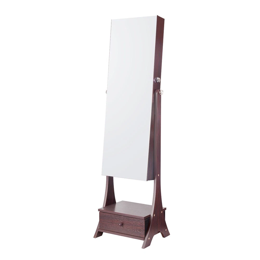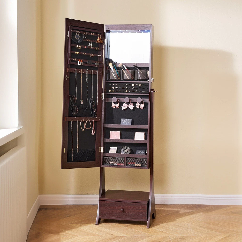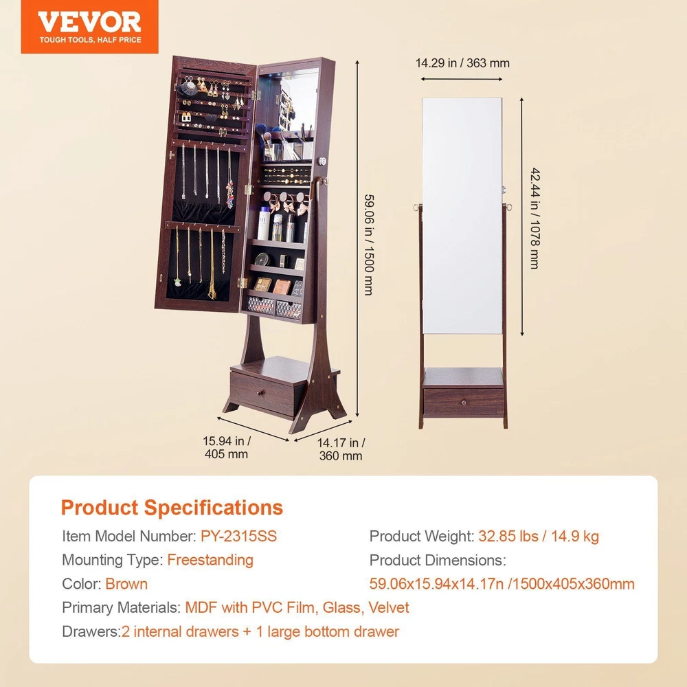VEVOR Standing Mirror Jewelry Cabinet: Effortless Jewelry Organization This standing mirror with storage combines a jewelry organizer, full-length mirror, makeup mirror, and rear storage shelf, providing a clean and spacious area for all your needs. The standing jewelry mirror features a high-quality velvet lining, ensuring your necklaces remain scratch-free and tangle-free. The keyless design prevents lost keys while keeping your valuables secure from playful children. The storage mirror features an LED light at the top, allowing you to easily wear jewelry in the dark. The rotating earring holder ensures quick access, while the bracelet rack saves space. The recessed door handle makes it easy to open, and the door's magnetic strength is ideal for long-term use. This beautiful and durable jewelry mirror organizer enhances the aesthetic of your room while maximizing space. It's the ideal gift for your wife, mother, or girlfriend—perfect for any occasion. The full length mirror with storage is easy to use and install. The built-in storage box provides extra storage space, meeting your storage needs.