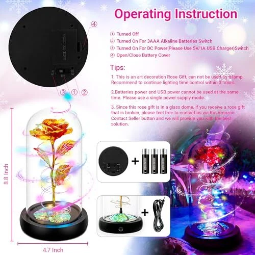 Return Policy Fast Delivery Trusted seller Rotating Birthday Gifts for Women,Christmas Rose Gifts for Women,Light Up Rose in Glass Dome,Spinning Colorful Red Rose Flower Gifts Rose Gifts for Mom Her Christmas,Thanksgiving,Anniversary Product Description Unique Rotating Birthday Gifts For Women:Rotating Colorful rose flower Christmas rose gifts for women who has everything,Rotating Flower in a glass dome are sure to charm anyone's hearts.Light Up Rose flowers Swirling with colorful lights,sure to become the go to unique and thoughtful Mom gifts for womens birthday gifts for women.Colorful Artificial Preserved Flowers rose gift are able to last forever,representing your everlasting love Valentines gifts to her Christmas Gifts For Mom Remind Her Of Your Love:Christmas gifts for mom women her,wife.A surprise mothers gifts when every womens wife Moms open.Any women will love such a unique and thoughtful mom present of her dreams with the flowers.Make Mom gifts even more special and give thinking of you gifts for women an unforgettable Sweet surprise.With Rotating flowers thoughtful gifts,d to making her the luckiest women in the Christmas Day Spinning Rose Women Gifts For Her:Perfect appreciation gifts for her,funny congratulation gifts for women.The Rotating colorful red rose is wrapped around a constantly changing the color LED Strip light,Powered by 3 AAA power(not included) or USB powered.LED rose Gift will spin up while opening,create romantic gifts for her this Christmas,rotating gifts for women who have everything.Spinning Light up rose is symbol Love gifts of appreciation,best wishes,love,passionate and romantics Best Friend fashionista gifts,Birthday Gifts For Women:Christmas gifts for mom.Colorful Red Rose Color change follow different angles and light.The color of rose flower in a glass dome will change follow different angles and light.Gold,pink,Colorful and other different color changes give her a romantic gift and warm gifts For women her wife mom during Christmas.Rotating mothers roses for Mom. Warmth And Romantic Women Gifts Idea for Holiday:Holiday gifts for women,teenage girls gifts ideas.The spinning rose gift will came with a beautiful package and best wishes card,so that could give directly without spend time on package.Great romantic rose flower gift,Christmas gifts for mom,Valentines gifts for her,birthday gifts for women,anniversary gift for women,Valentines rose and wedding gift for lovers.Best love gifts for her Spinning Rose Flower Gifts For Mom:Romantic Valentines Gifts For Women.Romantic,fun,Creative Christmas Rose Gift Ideas,thank you gifts for women.Rotating Rose gift is a Romantic and Thoughtful gift for womens,mother's Day,Mothers Birthday,Wedding,Engagement,Anniversary,Housewarming,which will give her a surprise,make her happy and create romantics gifts.Creates a bright and romantic gifts for her,wedding,Party,etc.I love you gifts for her with spin rose gift Glass Dome Size:8.8 Inch X 4.7 Inch;Package Include:1 Spin Rose Flower In A Glass Dome,1 X USB Cable,1 X Gift Box Shipping Returns Payment Shipping Shipping is FREE to all addresses other than APO/PO boxes in the lower 48 states. All our stock ships from US-based warehouses. Shipped via USPS or UPS (depending on location and package weight) Unless stated otherwise, all orders will ship within 24-72 hours of your payment being processed. Check our feedback to see the great reviews of FAST shipping we offer. Returns Seller does not accept returns Payment We currently accept payment via eBay managed payments only. Once payment is cleared, we will dispatch your shipment within 1-3 business days. Please refer to the "Shipping" tab for more information regarding shipping speed to your destination.