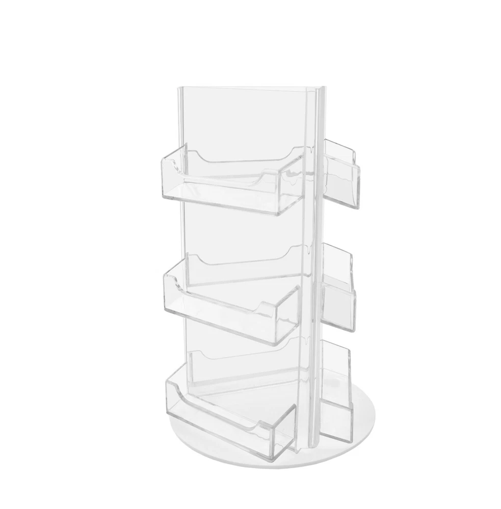 Business Card Holder 9 Pocket Rotating Countertop Display Spinner This nine pocket rotating business card holder provides an attractive desktop display for business cards or gift cards that complements any decor. Made of durable clear acrylic, the generous space between the card pockets provides full visibility of all nine sets of business cards access for card removal. Conveniently placed on desks, retail counters, tables or anywhere you want to leave your cards for the taking. Many retailers position an acrylic holder near the register, so customers can easily sign up for company cards or buy gift certificates. Advertising like this is one of the best ways to improve brand recognition and increase repeat purchases. This clear acrylic display stand is perfect for entrepreneurs who need to promote their business on numerous tables or counters to display your information in a clear and easily accessible manner, these are great for placement in restaurants, hotel reception areas, weddings, schools and other various venues such as Trade Shows, Flea Markets or Expos. In addition to business information, the clear acrylic holder can also be used to display other small media. Store credit cards or gift cards are often placed in the holder near the register or checkout stand to increase clientele and expand the customer base. Other times, simple gift certificates, and doctors appointment cards are placed in the pockets. Product Features : Perfect display solution for business cards and gift cards Space-saving design displays nine sets of cards in one convenient holder Freestanding and portable; display on desks, retail counters, or tables Angled, rotating design offers optimal view of cards Overall Dimensions: 4.5"w x 10"h with 6"W Base Pocket Dimensions: 3 11/16"w x 3/4"d Pocket Capacity Approx 50 Business Cards Premium High Quality Acrylic Return Policy 30 Day Return Policy: By purchasing our product you are agreeing to our return policy, so please read! Perfect returns (NO used merchandise) on stock items are accepted within 30 days of delivery. Any visual appearance that the product is used will result in 00 refund. All returns are subject to a 20% inspection, re-boxing and restocking fee. All returns must be repacked and returned in their original packaging for protection. (MUST return on pallet if received on Pallet) Packages being returned should be insured by you for your protection No credits are issued on shipping costs. Absolutely no returns accepted on custom order displays, including orders with custom text, imprinting or graphics