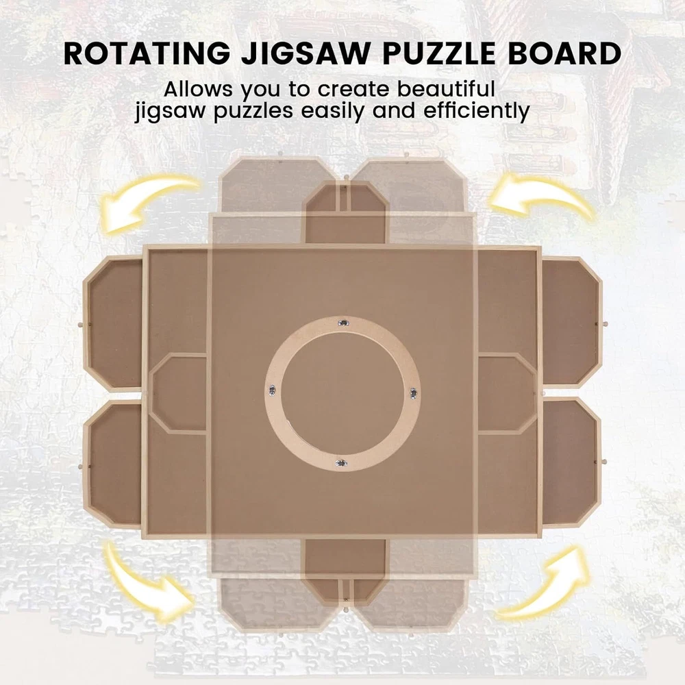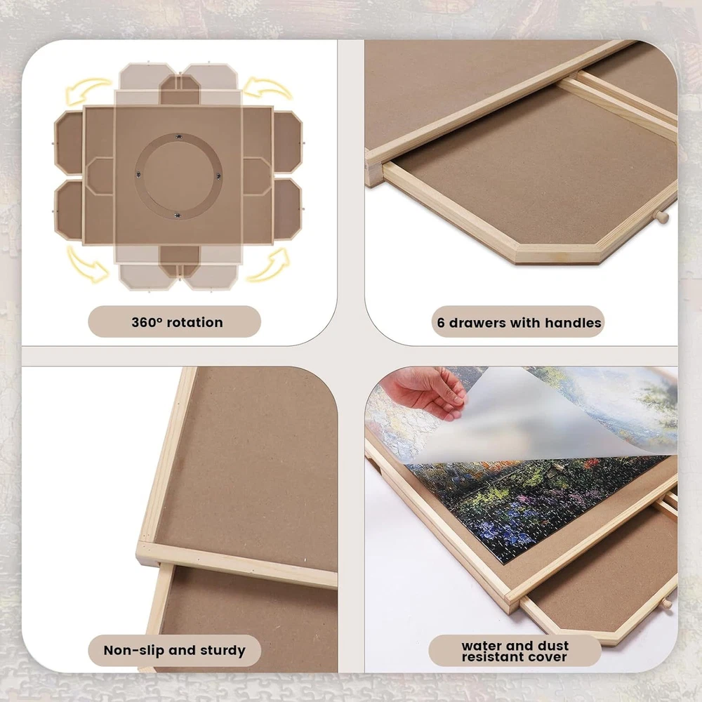 Rotating Jigsaw Puzzle Board with 6 Drawers and Cover, 35 "x 26" Wooden Puzzle Table for Puzzle Storage and Sorting, Portable Puzzle Enlightenment Board for Adults and Kids - 1500 Piece Product Details ROTATING PUZZLE BOARD WITH 6 DRAWERS: Our puzzle board with 360° rotation greatly improves the convenience of puzzles, allowing you to create beautiful puzzles easily and efficiently. The puzzle board with 6 drawers is designed for assembly and storage and can store up to 1500 pieces. Store your progress when you want to take a break and close the translucent lid to protect from dust, water and pets. DURABLES AND SMOOTH JUGGLE TRAY: 1500 pieces puzzle table uses top quality materials to make a smooth and sturdy surface to work with, allowing the puzzle pieces to slide into place easily and securely. Ensure that your puzzle board will not warp or collapse after a long time of use. PREMIUM QUALITY 35 "x 26" JUGGLE TABLE: The puzzle boards are made of high quality sustainable hardwoods, which are more load bearing and durables than plastic puzzle boards, making it a no-brainer and a worthwhile investment.The 35 "x 26" smooth work surface is large enough to hold most of the 1,500 pieces. 6 DRAWERS AND 1 LID: The 6 drawers are large enough for you to sort the puzzles by color, theme or border. Each drawer has been specially designed with a handle to ensure that all drawers are easy to open when in use, safely preventing puzzles from getting lost. The translucent included lid can contain your masterpiece from dust, water and pet damage. IDEAL GIFTS FOR PUZZLE LOVERS: Our puzzle table makes a birthday or holiday gifts for teens, seniors, or anyone who enjoys puzzles that enhance the overall puzzle solving experience while putting together your favorite pieces. Place the puzzle board on any surface (countertop, coffee table, beach blanket or floor) and have fun.