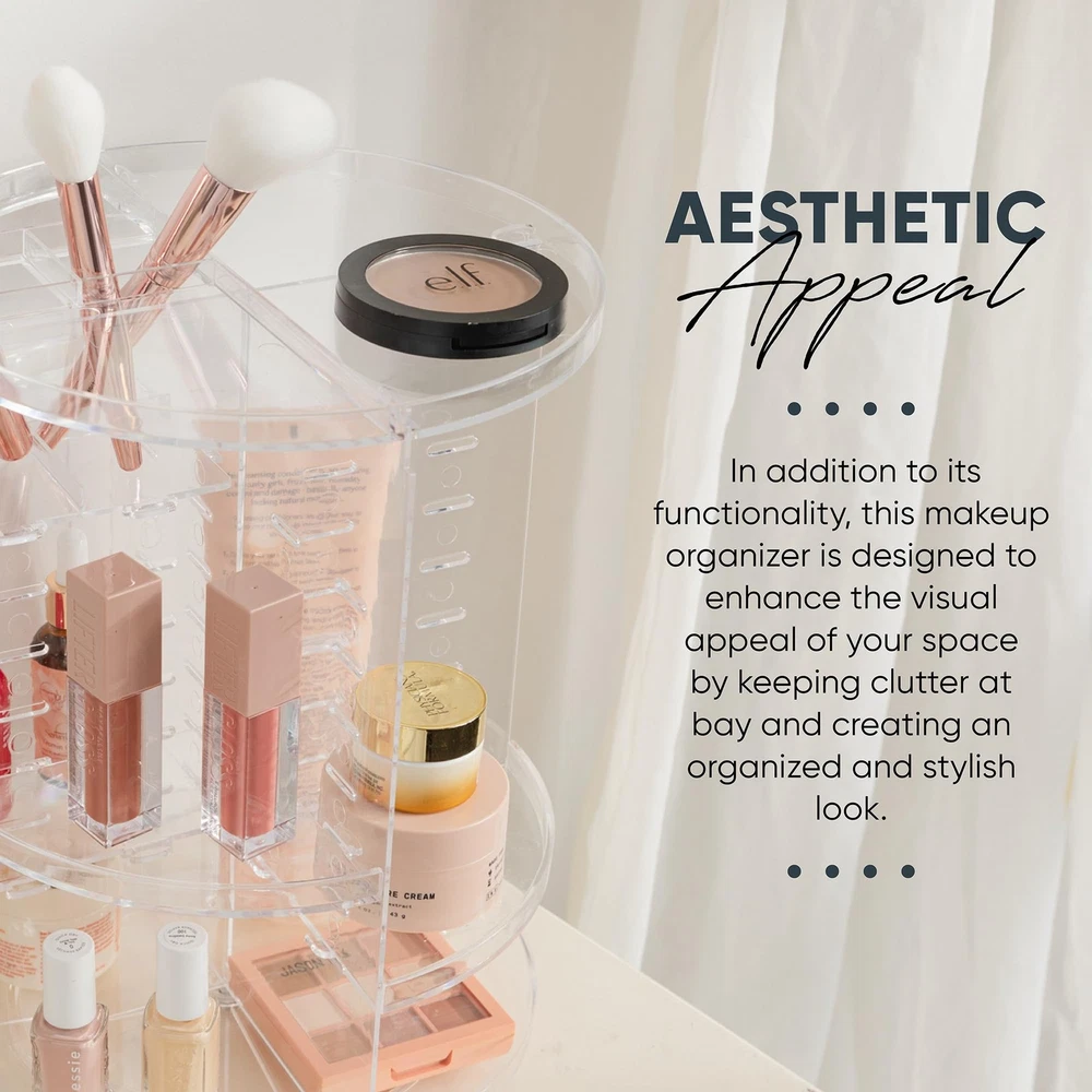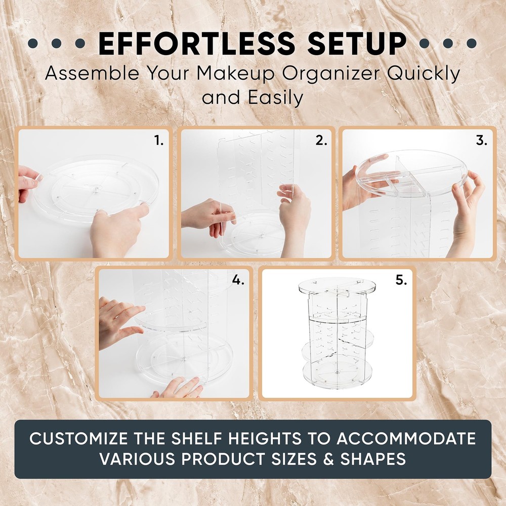 The innovative 360-Degree Rotating Makeup Organizer, a must-have addition to your beauty routine that effortlessly combines functionality, style, and organization. Say goodbye to the daily struggle of digging through cluttered drawers or hunting for your favorite cosmetics – this organizer revolutionizes the way you store and access your beauty essentials. With its sturdy construction and sleek design, our makeup organizer offers a spacious, clutter-free solution for all your makeup and skincare products. The 360-degree rotating base allows you to access every item with ease, while adjustable shelves accommodate products of various sizes, from lipsticks and brushes to skincare bottles and palettes. The organizer's minimalist aesthetic adds a touch of elegance to your vanity or bathroom, complementing any decor style. Assembly is a breeze, and you can have it set up in minutes to enjoy an organized beauty space. Say hello to efficiency and convenience, and experience the joy of having all your beauty products neatly at your fingertips. Upgrade your beauty routine with our 360-Degree Rotating Makeup Organizer today. LARGE STORAGE CAPACITY - This makeup spinning organizer offers generous storage space, allowing you to neatly organize a wide range of cosmetics and beauty products. EASY ASSEMBLY AND CUSTOMIZATION - The product is easy to assemble, and it offers the flexibility to customize the shelf heights to accommodate various product sizes and shapes. 360-DEGREE ROTATION - The lazy Susan-style bottom of the organizer allows for smooth 360-degree rotation, making it effortless to access your makeup and beauty items quickly. STURDY AND DURABLE - Designed for durability, this revolving makeup organizer is constructed to withstand the weight of various cosmetic products, providing a stable and reliable storage solution. SPACE-SAVING AND AESTHETIC APPEAL - In addition to its functionality, this makeup organizer is designed to enhance the visual appeal of your space by keeping clutter at bay and creating an organized and stylish look.