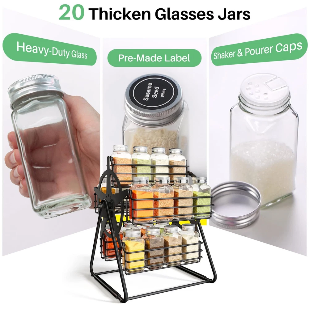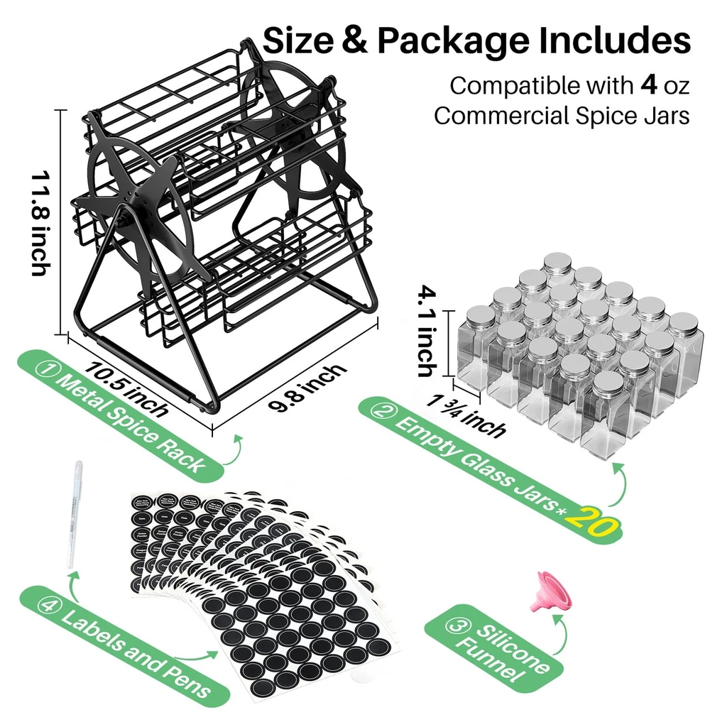 Rotating Spice Rack Organizer with 20 Empty Thicken Glasses Jars and Labels for Kitchen Countertop, Spinning Like Ferris-Wheel, Metal (M) New Design Ferris-Wheel Style for Your Kitchen: The rotating spice rack adds a playful, modern look to countertops, making your kitchen feel cozy and unique. Comes with 20 Empty Thicken Glasses Jars & Tons of DIY Labels: The jars are a nice heavy-duty glass, and they hold a lot - much more than most standard spice jars, so you should be able to transfer the contents from your commercial jars pretty easily. Especially with the included funnel. Tons of stickers are included with just about any spice or herb name you can imagine, as well as blanks for you to make your own custom label with the marker pen included. Smooth Spinning That Feels Like a Fun: Turn the spinning spice rack with a gentle push and enjoy the fun of finding your 20 spice jars. Bottles Stay Upright: The rotating spice rack organizer has tall edges and a gravity-centered design, keeping bottles vertical, even when spinning. Safer than a wobbly round rotating spice rack. Easy Assemble:Institutions were very easy to follow. Easy to put together. It tooks 5 minutes assemble and it was ready to start putting spices in. Enjoy the new concept of rotating the spice rack.