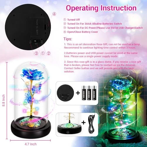 30 Days Return Policy Fast Delivery Trusted seller Rotating Valentines Day Gifts for Her,Birthday Gifts for Women,Valentines Rose Flower,Light Up Rose in Glass Dome,Spinning Colorful Blue Artificial Flowers Gifts for Mom,Wife,Anniversary Product Description Unique Rotating Valentines Day Gifts For Women:Rotating Colorful Blue rose flower Valentines Day rose gifts for women who has everything,Rotating Flower in a glass dome are sure to charm anyone's hearts.Light Up Rose flowers Swirling with colorful lights,sure to become the go to unique and thoughtful Mom gifts for womens birthday gifts for women. Colorful Artificial Preserved Flowers rose gift are able to last forever, representing your everlasting love Valentines Day gifts to her Valentines Day Flowers Gifts Remind Her Of Your Love: Valentines Day gifts for mom women her,wife.A surprise Valentines Day gifts when every womens wife moms open.Any women will love such a unique and thoughtful Valentines present of her dreams with the flowers.Make Mom gifts even more special and give thinking of you gifts for women an unforgettable Valentines Day surprise.With Rotating flowers thoughtful gifts,d to making her the luckiest women in the Valentines Day Valentines Day Spinning Rose Women Gifts For Her:Perfect Valentines Day gifts for her,funny Valentines Day gifts for women.The Rotating Rainbow Rose is wrapped around a constantly changing the color LED Strip light,Powered by 3 AAA power(not included) or USB powered.LED rose Gift will spin up while opening,create romantic gifts for her this Valentines Day,rotating gifts for women who have everything.Valentines rose is symbol Love gifts of appreciation,best wishes,love,passionate and romantics Best Friend Valentines Day gifts,Birthday Gifts For Women:Valentines Day gifts for her,mother’s day gifts for mom. Rainbow Rose Color change follow different angles and light.The color of rose flower in a glass dome will change follow different angles and light.Gold, pink,Colorful and other different color changes give her a romantic gift and warm gifts For women her wife mom during Valentines Day.Rotating valentines roses for valentine's day Warmth And Romantic Valentines Day Gifts Idea for Holiday:Holiday gifts for women,Valentines Day gifts ideas.The spinning rose gift will came with a beautiful package and best wishes card,so that could give directly without spend time on package Valentines Day.Great romantic rose flower gift,Valentines Day gifts for mom,Valentines day gifts for girlfriend,birthday gifts for women,anniversary gift for wife,Valentines rose and wedding gift for lovers. Best valentines day gifts for her Spin Valentines Day Rose Flower Gifts For Mom:Valentines Day Gifts For Women.Romantic, fun,Creative Valentines Day Rose Gift Ideas,thank you gifts for women.Rotating Rose gift is a Romantic and Thoughtful gift for womens,Valentines Day,Mothers Birthday,Wedding, Engagement,Anniversary,Housewarming,which will give her a surprise,make her happy and create romantics gifts.Creates a bright and romantic Valentines Day gifts for her,wedding, Party, etc.I love you gifts for her with spin rose gift Glass Dome Size:8.8 Inch X 4.7 Inch;Package Include:1 X Spin Rose Flower In A Glass Dome,1 X USB Cable,1 X Gift Box Shipping Returns Payment Shipping Shipping is FREE to all addresses other than APO/PO boxes in the lower 48 states. All our stock ships from US-based warehouses. Shipped via USPS or UPS (depending on location and package weight) Unless stated otherwise, all orders will ship within 24-72 hours of your payment being processed. Check our feedback to see the great reviews of FAST shipping we offer. Returns As our valued customer, we will do our best to make sure the product you receive arrives to you on time and as expected. If you are not satisfied with your purchase, please contact us within 30 days of receiving your order to process a return. Payment We currently accept payment via eBay managed payments only. Once payment is cleared, we will dispatch your shipment within 1-3 business days. Please refer to the "Shipping" tab for more information regarding shipping speed to your destination.