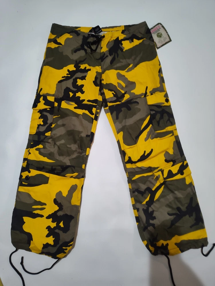 Elevate your streetwear game with these yellow Camo Cargo Pants from Rothco. These pants are perfect for travel, casual wear, and workwear. Made from durable cotton canvas material, these straight legged pants feature a flat front and a low-rise waist with a drawstring closure. With a total of 8 pockets, including 4 cargo pockets and 2 back pockets, these pants provide ample storage space for your essentials. The pants also come in a size small, with a 30-inch inseam and a waist size of 33"-35" drawstring. The camouflage pattern and accents, such as the pockets and zipper closure, make these pants a great addition to any urban or army-themed outfit. They were originally bought from Zumies.