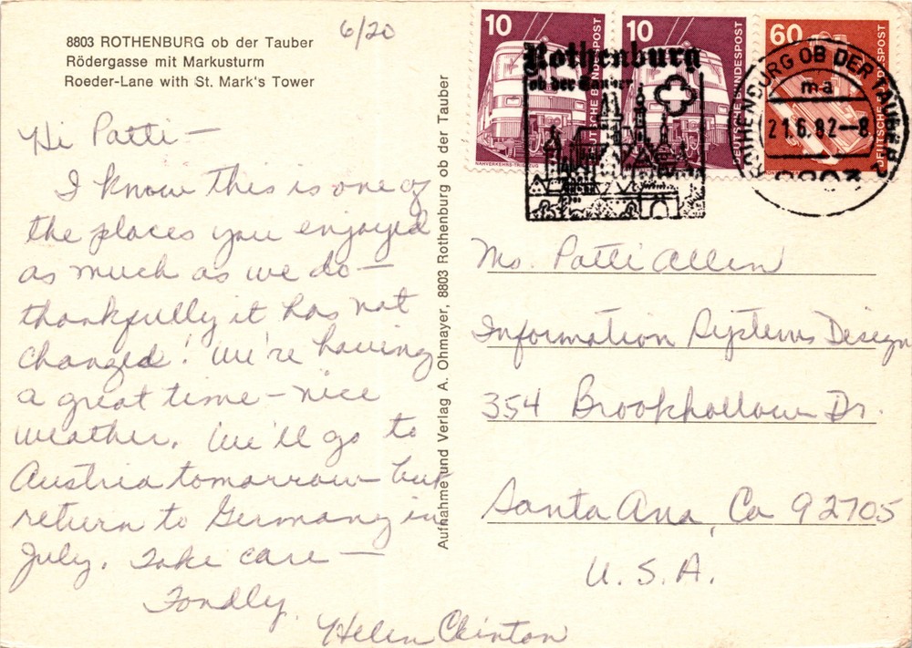 MAKE AN OFFER. THE MORE YOU BUY THE BETTER DEAL I WILL ACCEPT The postcard is from Rothenburg ob der Tauber, a picturesque town in Germany known for its well-preserved medieval old town. The image on the postcard shows Rödergasse, a charming lane in Rothenburg with St. Mark's Tower in the background. St.