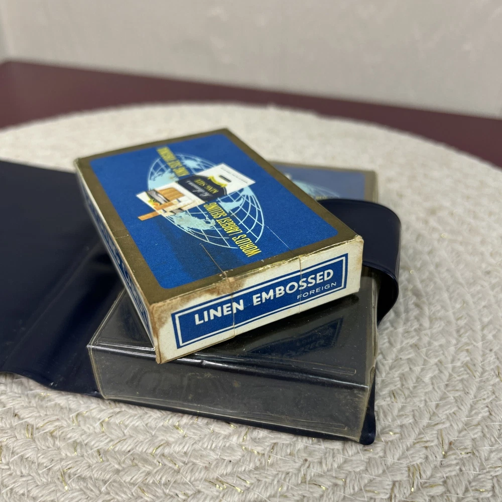 This is a double pack of playing cards that are on linen. They are embossed . The two pack is in a plastic carrying case. It has a snap closure. The boxes of the cards have seen where and obvious usage. The cards on the inside are in good condition . Unknown as to where these are made, but the outside of the box does say “ for eign”.