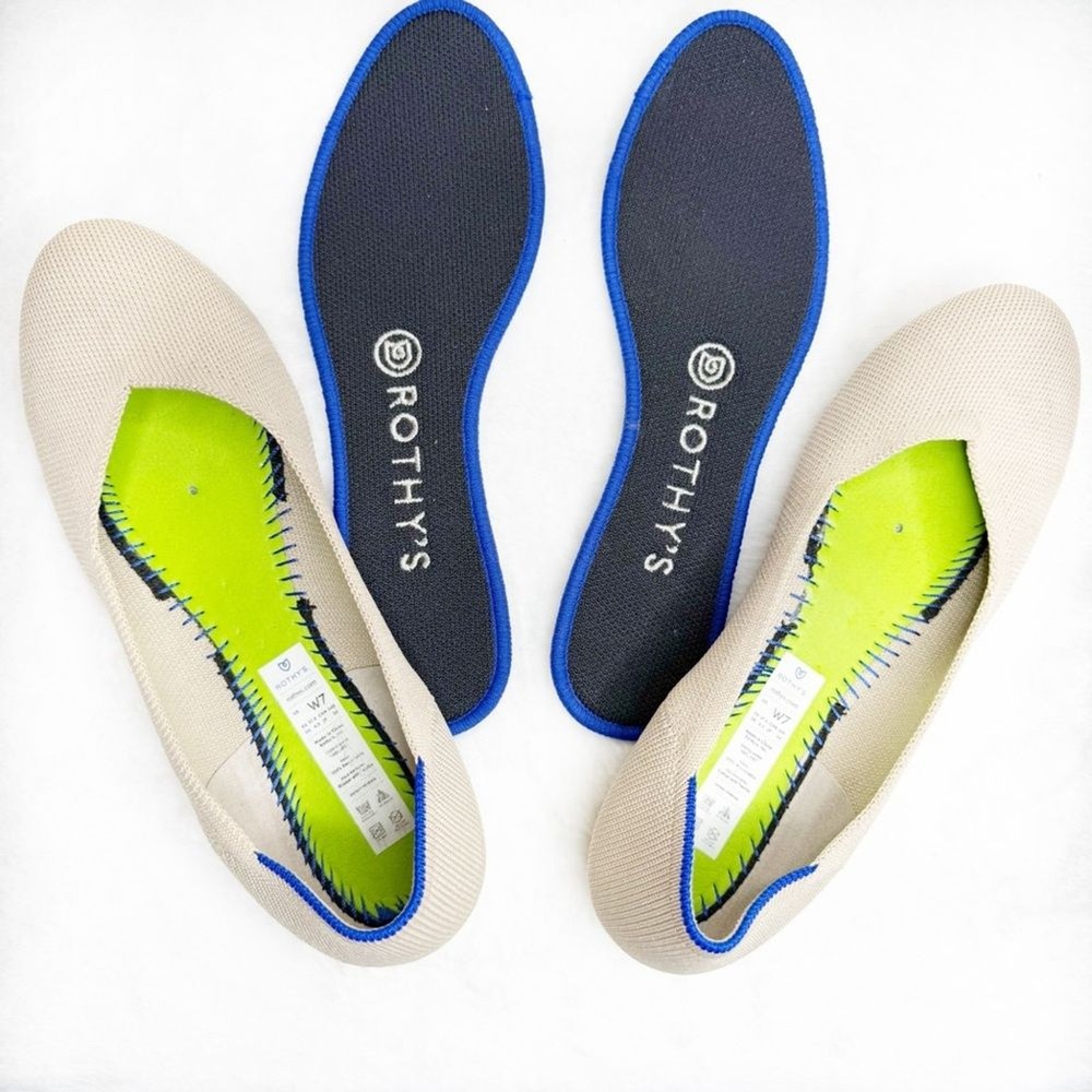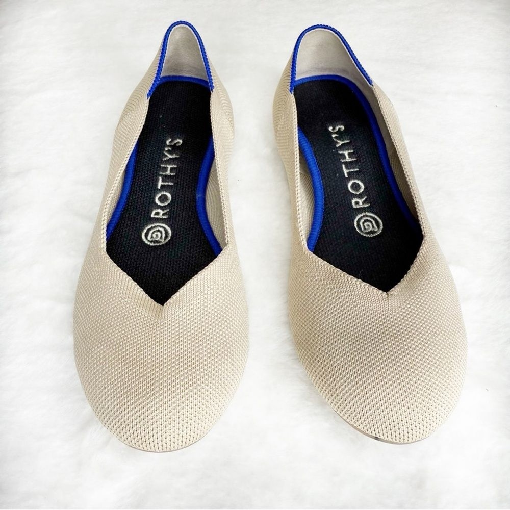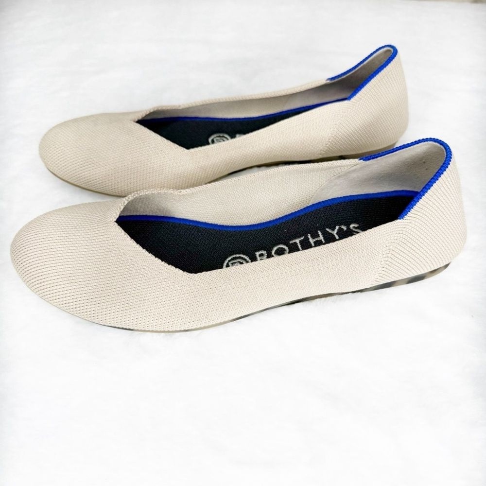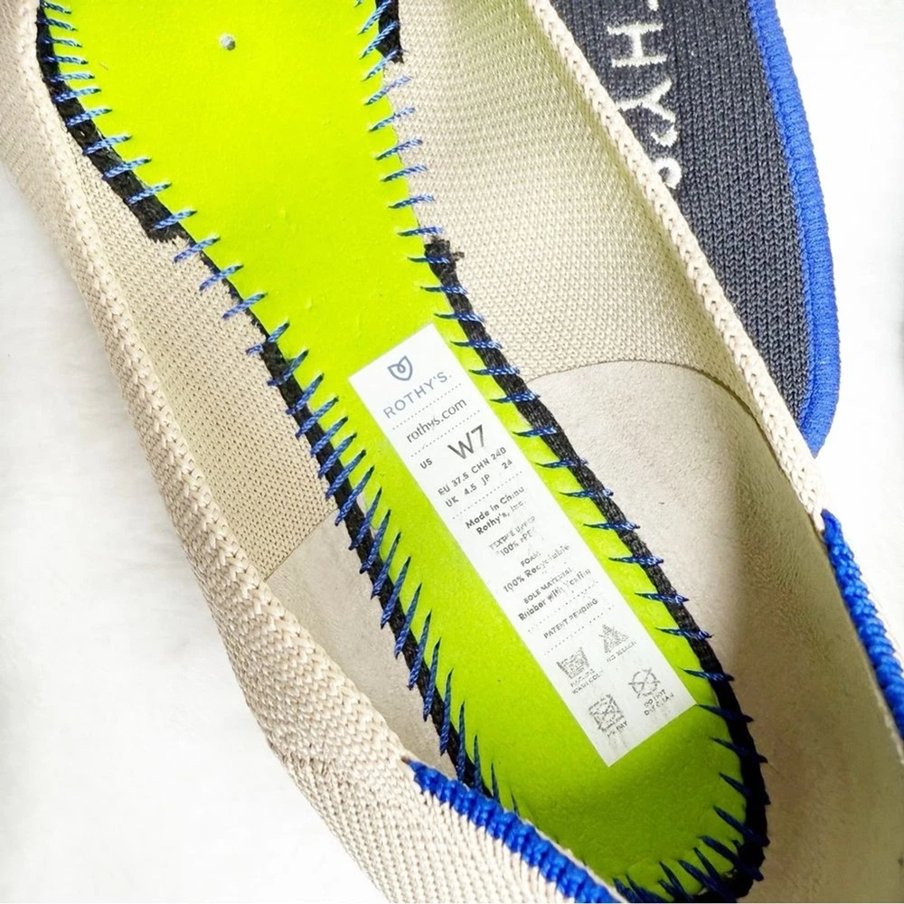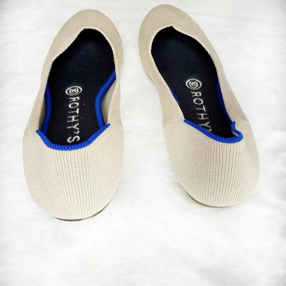 These cream flats from Rothy's feature a striking royal blue trim that adds a pop of color to their sleek design. Made from a soft, textured fabric, they offer a comfortable slip-on style with a rounded toe. Perfect for versatile wear, these flats combine elegance with everyday practicality.