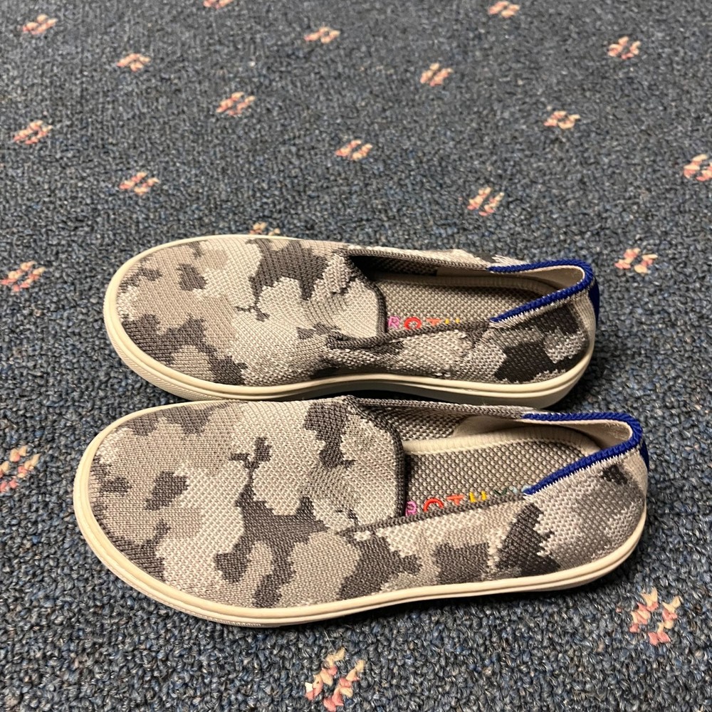 The Rothy's Kids Slip-On Sneaker Loafer in Gray Camo is a stylish and comfortable option for active kids. With a slip-on design, round toe shape, and flat heel, these sneakers are perfect for casual wear and walking activities. Made from knit fabric with a rubber outsole, they offer breathability and comfort. The colorful camouflage pattern adds a fun touch to the standard shoe width, making them a versatile choice for summer, fall, and spring seasons. Ideal for both boys and girls, these sneakers are a practical and fashionable option for young individuals.