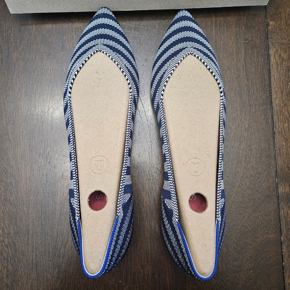 Rothy’s The Point Riviera Stripe Ballet Flat Women 9 Navy White NIB Sustainable Description Rothy’s “The Point” ballet flats in the Riviera Stripe pattern, featuring a navy blue and white diagonal stripe design with a sleek pointed-toe silhouette. Crafted from knit fibers made using 100% recycled plastic water bottles, offering lightweight flexibility and all-day comfort. Designed for easy slip-on wear with durable outsoles. These flats are machine washable—wash cold and air dry to refresh. New in box, never worn. Measurements are included in the photos. Fit note: Rothy’s typically recommends sizing up in The Point style due to the narrower toe box. Condition New in box, never worn Keywords Sustainable Footwear, Eco Friendly, Workwear Chic, Office Ready, Travel Friendly, Everyday Essential, Capsule Wardrobe, Timeless Flats, Comfortable Shoes, Minimalist Style, Polished Look, Smart Casual, Neutral Stripe, Sustainable Fashion, Circular Fashion