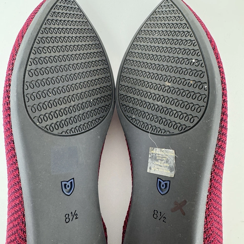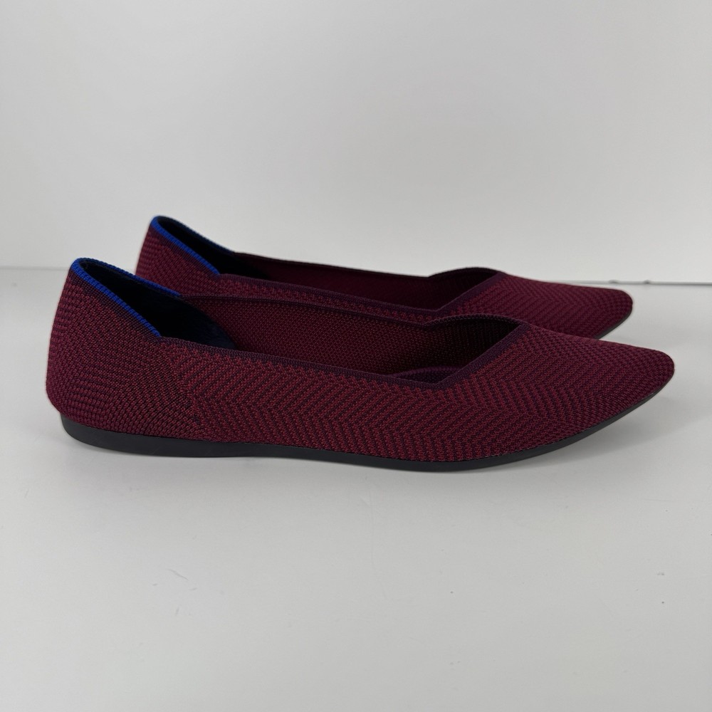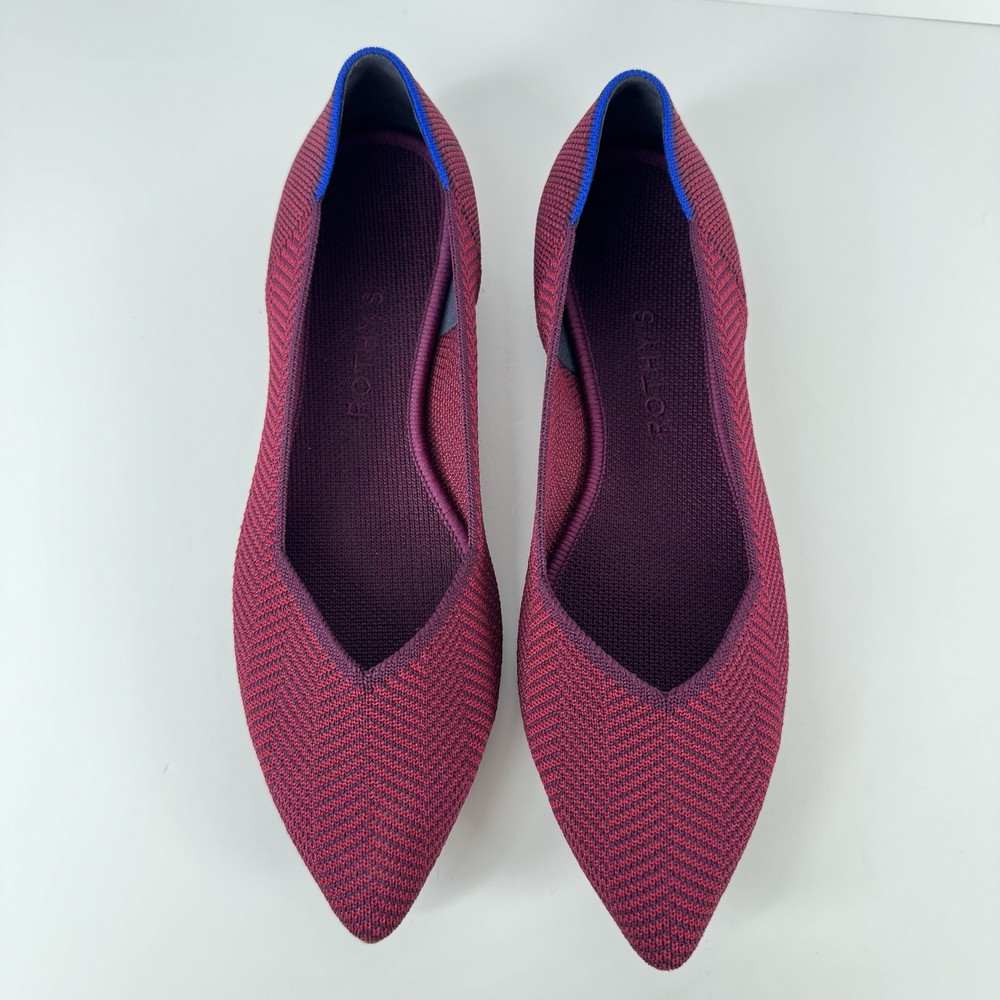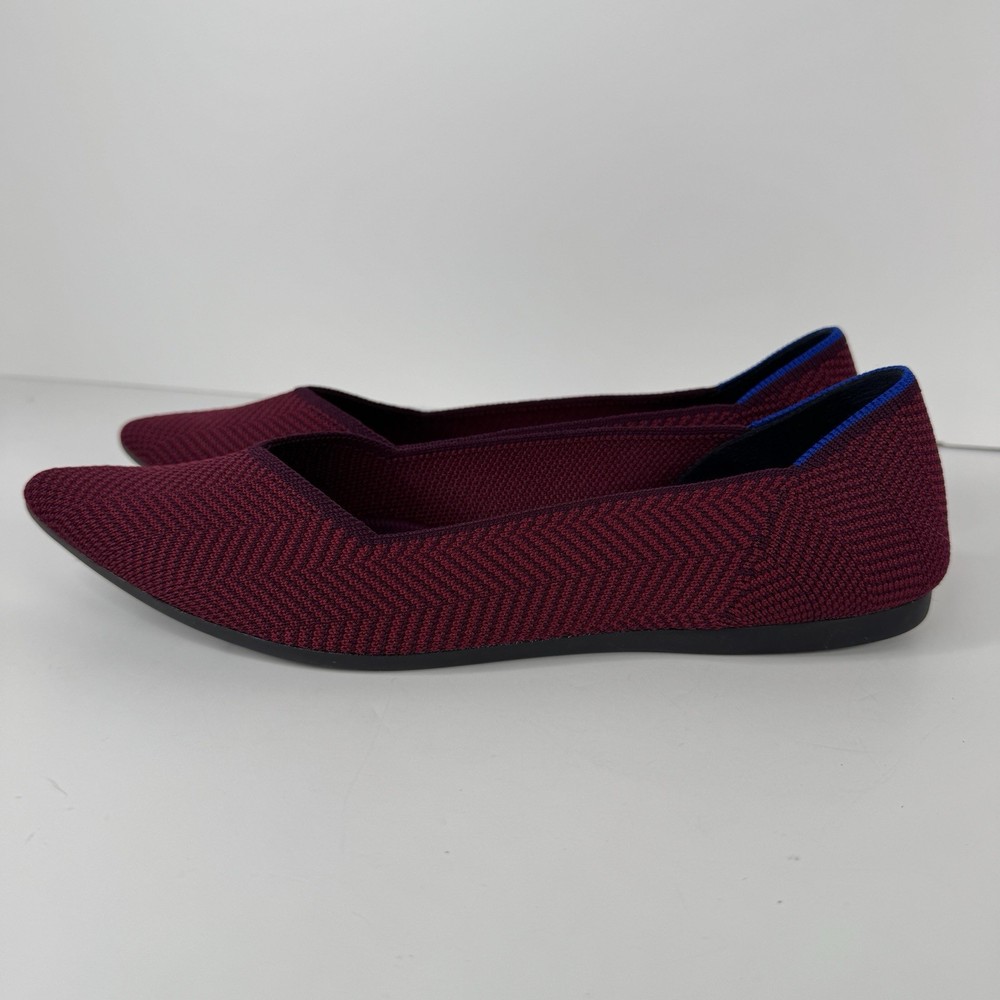 The Rothy's US Size 8.5 Point Cabernet Burgundy Herringbone Knit Ballet Flat is a stylish and comfortable slip-on flat shoe perfect for casual occasions. Made with knit fabric and featuring a pointed toe design, these ballet flats are both fashionable and easy to wear. The removable insoles provide added comfort, while the rubber outsole offers durability. Condition is used