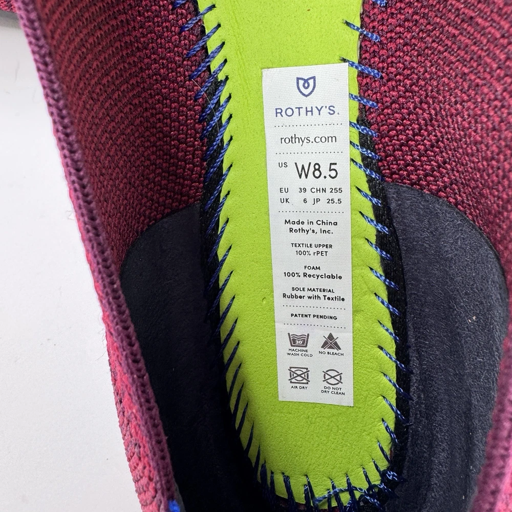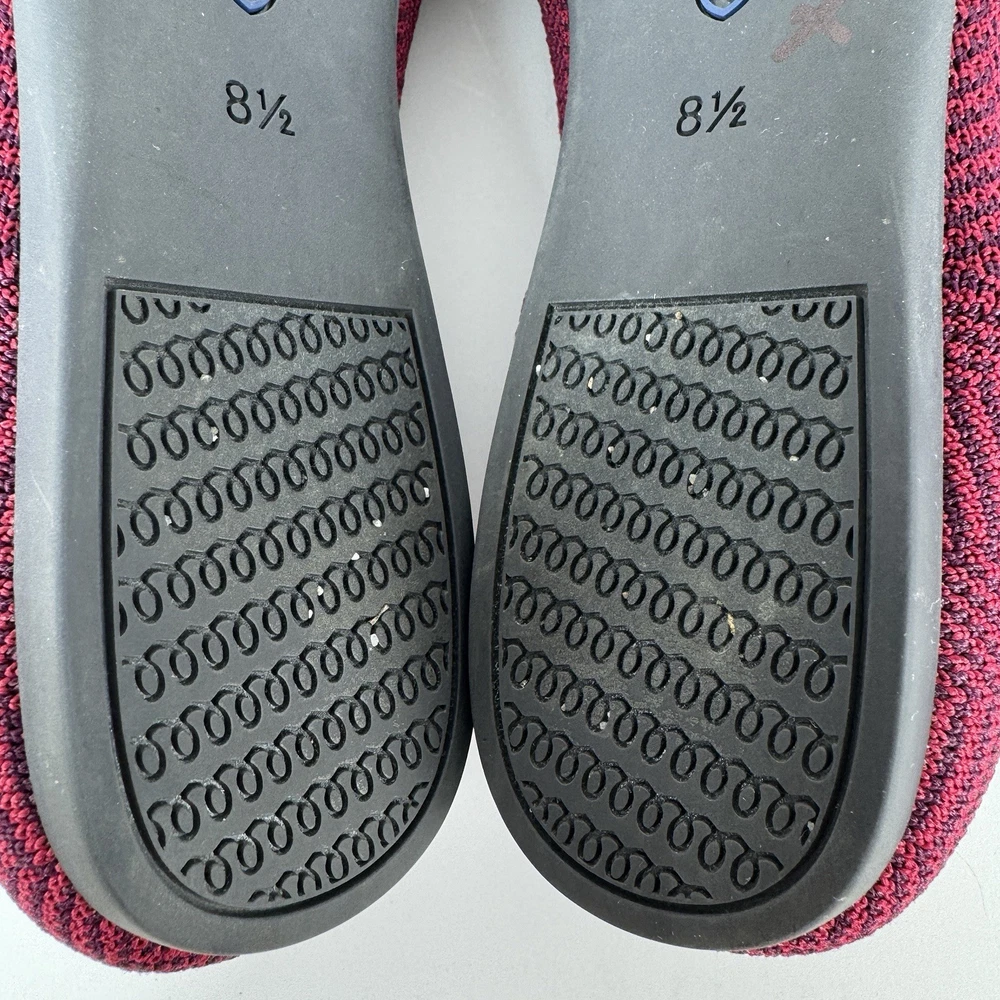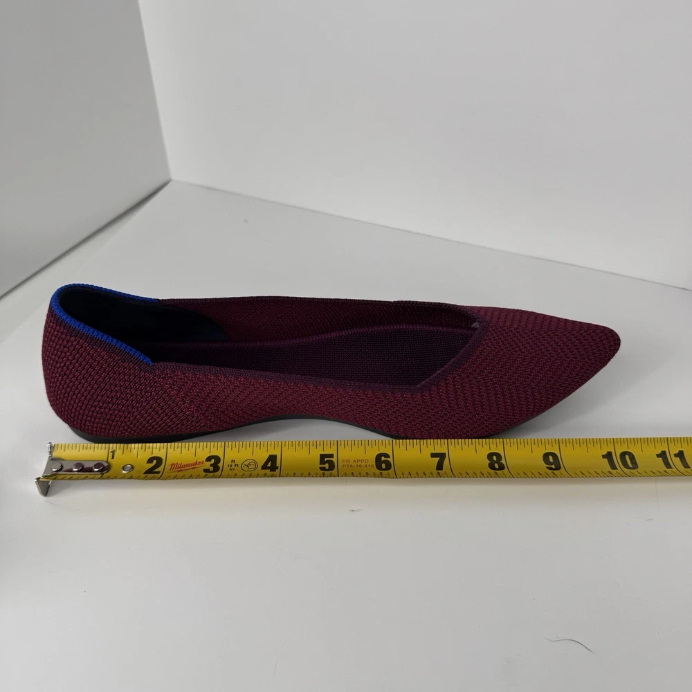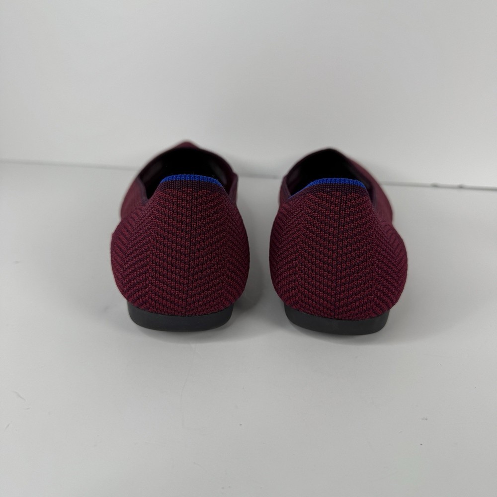 The Rothy's US Size 8.5 Point Cabernet Burgundy Herringbone Knit Ballet Flat is a stylish and comfortable slip-on flat shoe perfect for casual occasions. Made with knit fabric and featuring a pointed toe design, these ballet flats are both fashionable and easy to wear. The removable insoles provide added comfort, while the rubber outsole offers durability. Condition is used