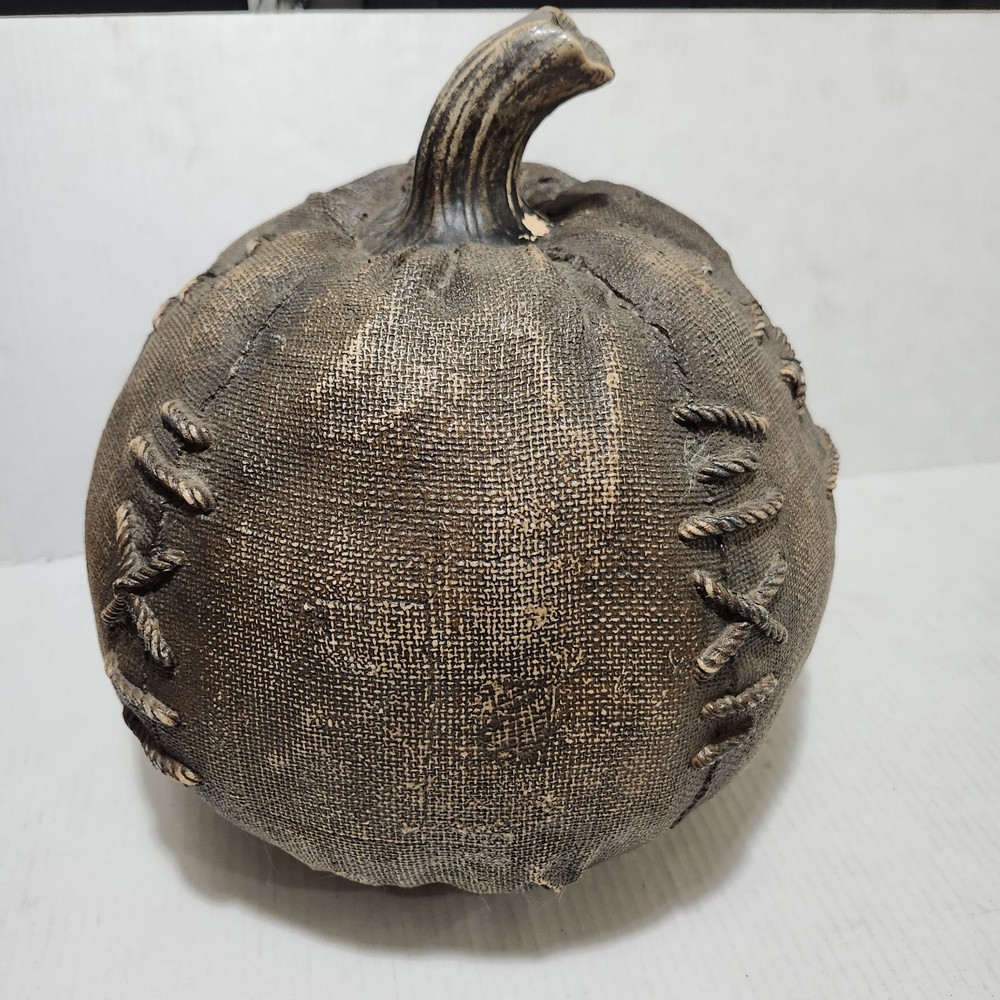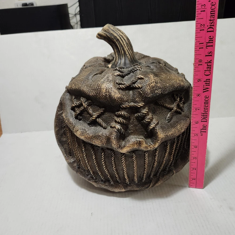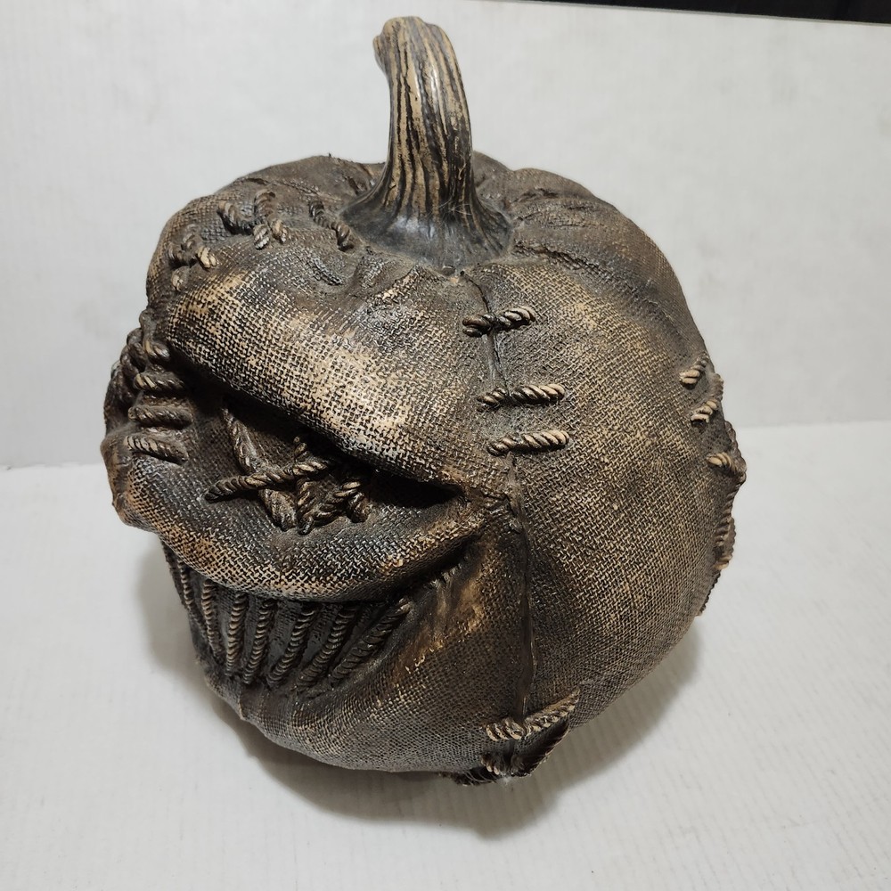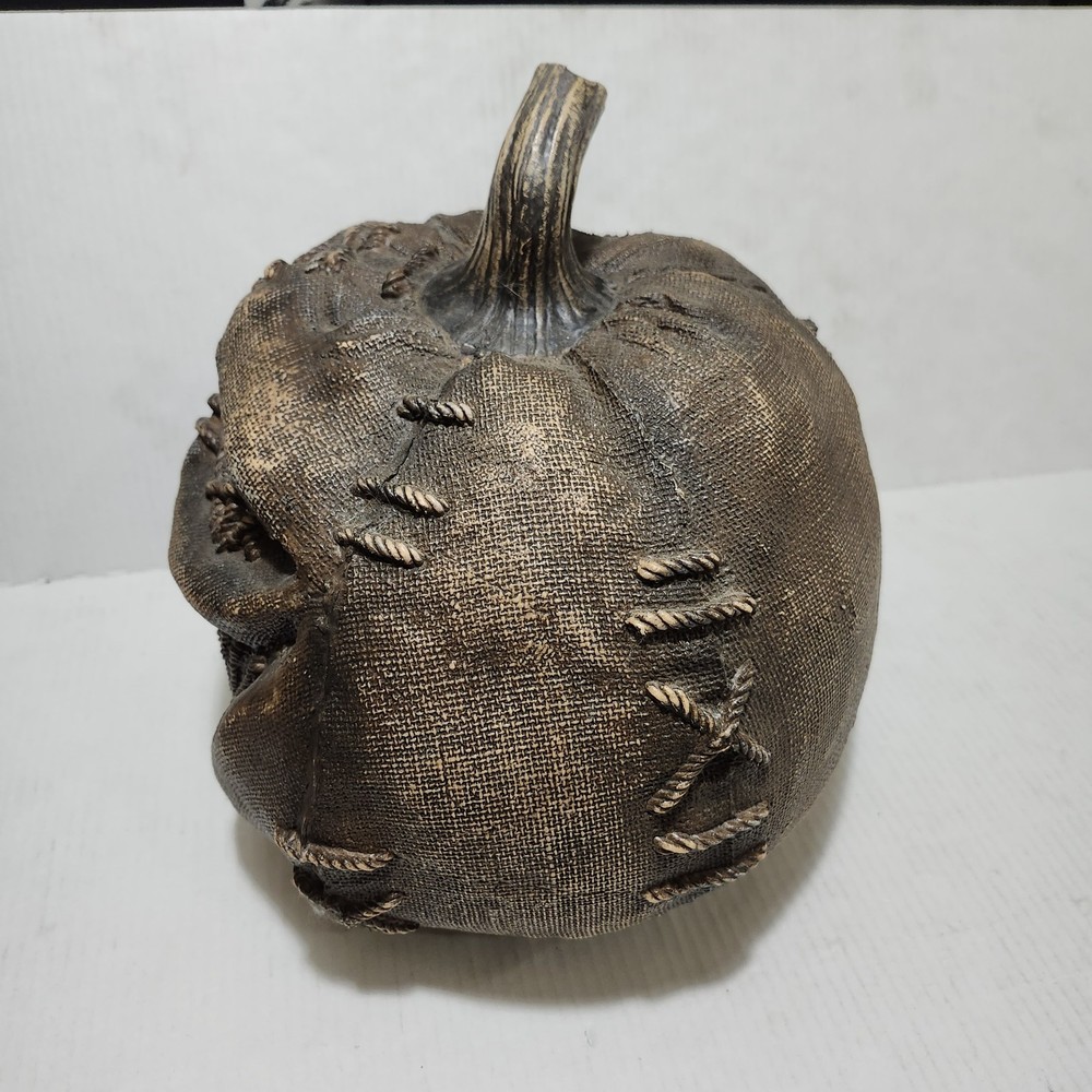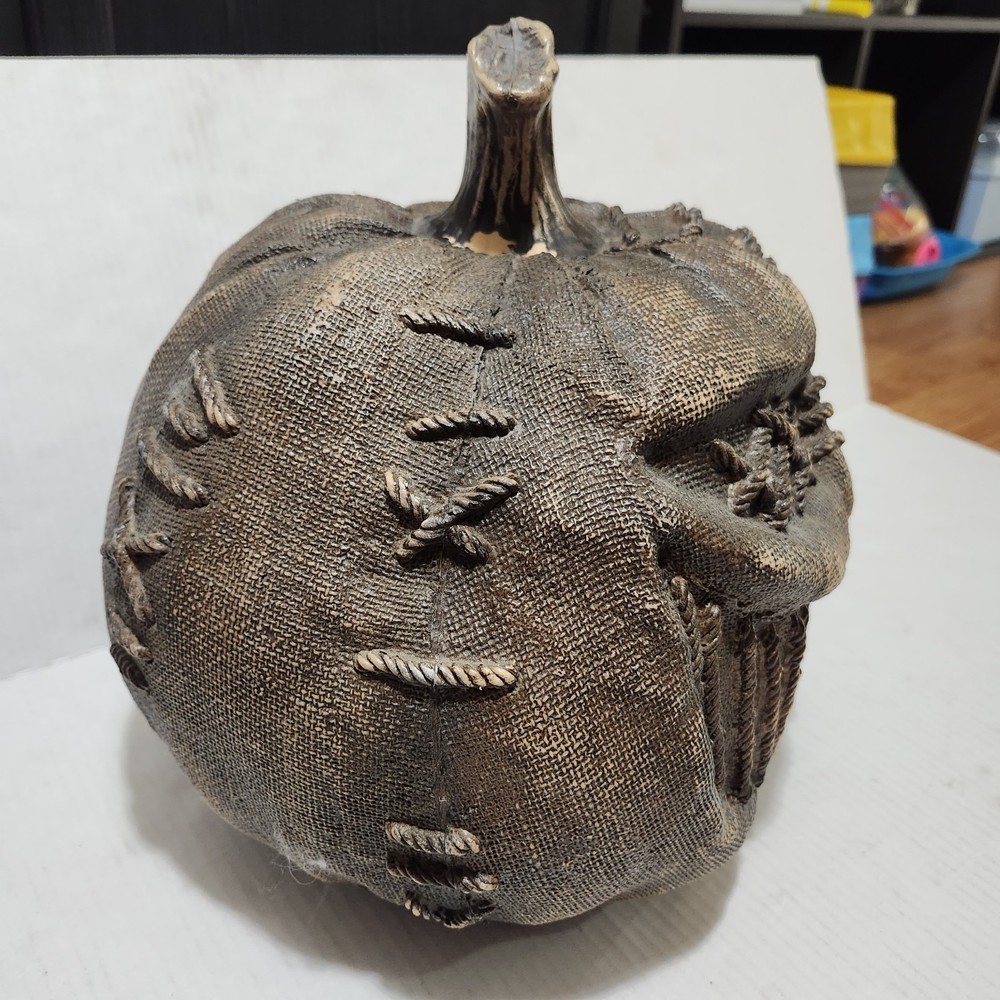 Pre-owned. There is some damage and wear to the top of the pumpkin at the stem.