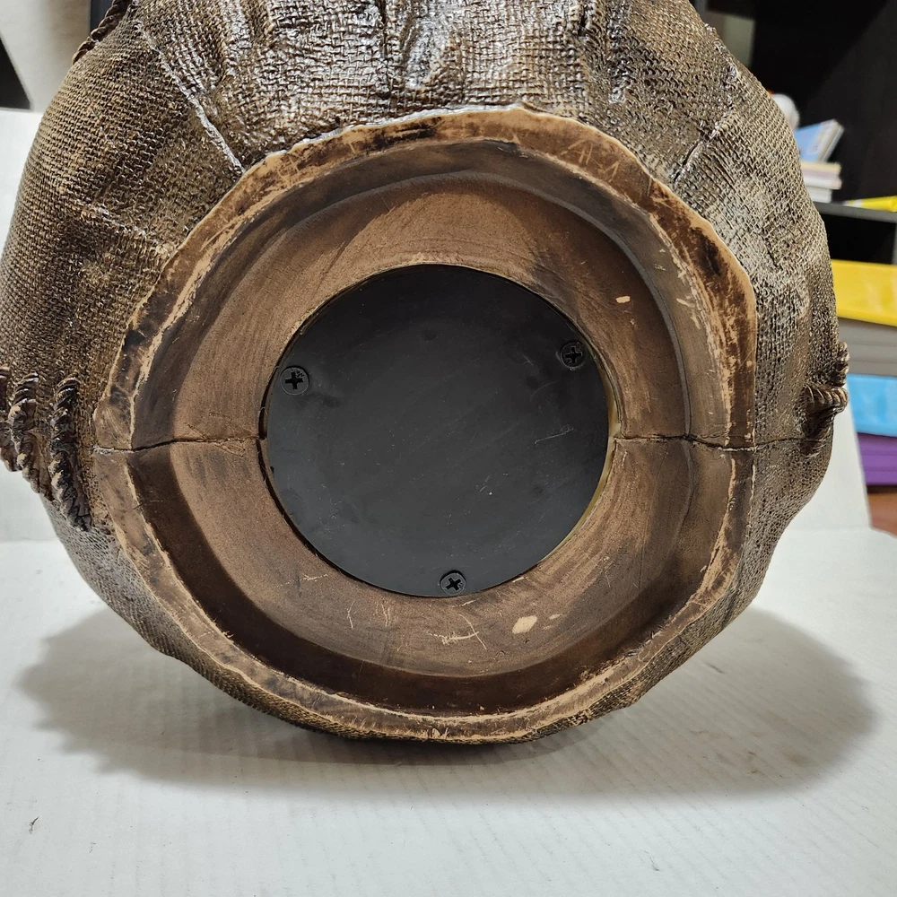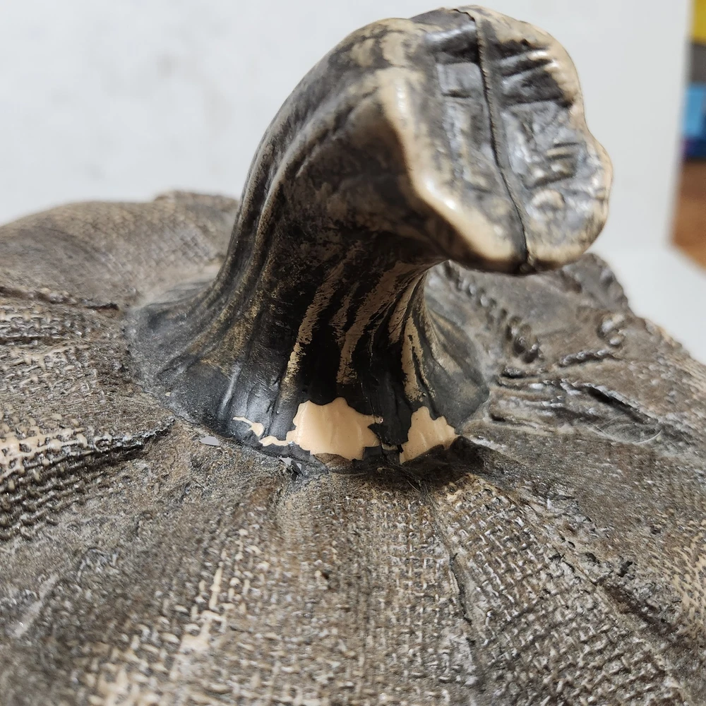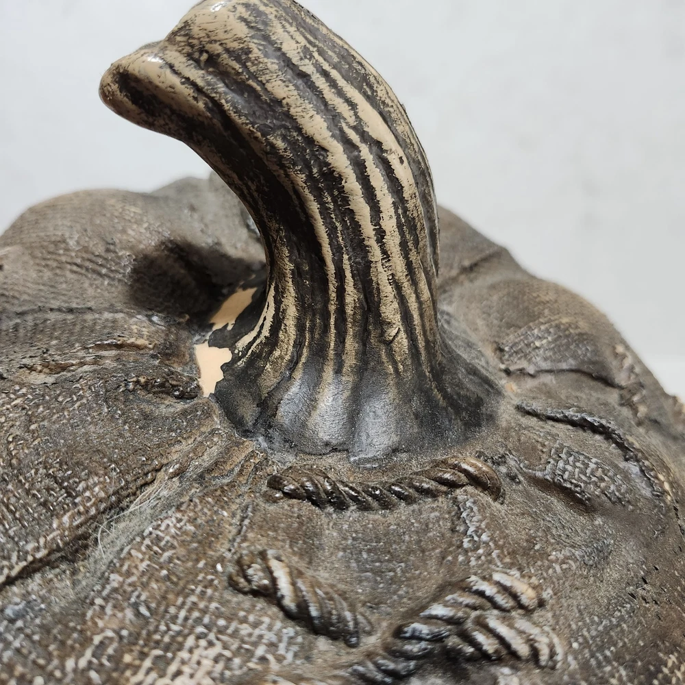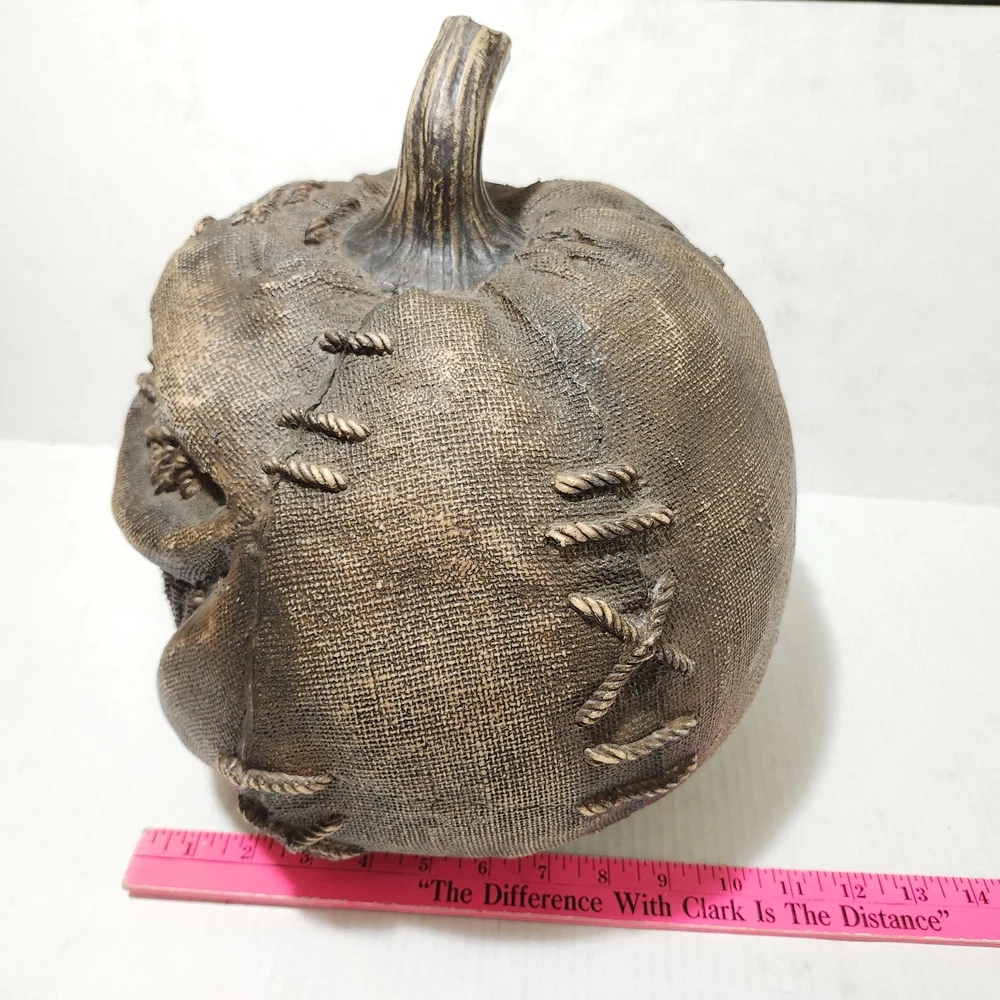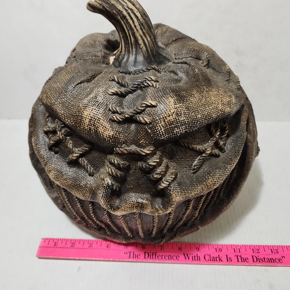 Pre-owned. There is some damage and wear to the top of the pumpkin at the stem.