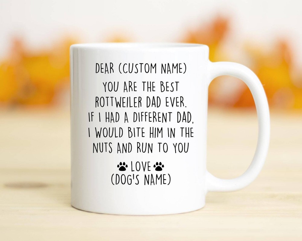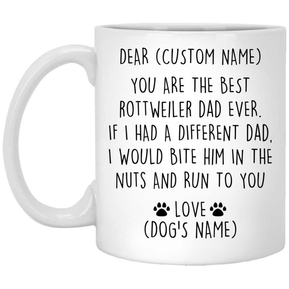Rottweiler Dad Birthday Gift Rottie Dad Christmas Gift Rott Dad Valentine Gift Rottie Dad Appreciation Rottie Dad Mug Rottie Dad Gift Product Details.. This high quality 11oz. ceramic white mug has a premium hard coat that provides crisp and vibrant color reproduction sure to last for years. Perfect for all hot & cold beverages. The highest quality printing possible is used. It will never fade no matter how many times you wash it. Material: 100% Ceramic. Print both sides. Dishwasher and Microwave Safe. High Gloss + Premium White Finish. Printed in the U.S.A. Personalized & Custom. We support personalized and custom mug to add custom, when placing an order, you can add notes to the "order note" in shipping address section. Also you can contact us directly via message. Shipping Info. Ready to ship in 1 to 2 business days, All products are made-to-order and proudly printed in the United States. Shipped by USPS and DHL, You will receive your order in 5-7 days. Replace & Refund. All products are defective during shipping broken, chipped will be replaced free of charge. You are not satisfied with the product, we will refund 100% money to you. If any other issues arise, please do not hesitate to message, we would be more than happy to assist you.