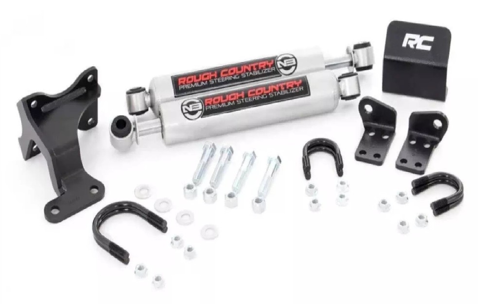 https://ebaystores.s3.us-east-2.amazonaws.com/trendsauto/Rough-Country/ROUGHCOUNTRY-8734930-1.jpg Rough Country Black Premium N3 Dual Steering Stabilizer for Jeep Wrangler JK PART NUMBER: 8734930 BRAND: Rough Country DESCRIPTION N3 Dual Steering Stabilizer Reduce bump steer and improve ride quality with Rough Country's N3 steering stabilizers for Jeeps, trucks, and SUVs. These nitrogen-charged units help tame the steering wheel by reducing bump steer while driving. The easy-to-install upgrade goes on quickly for an instant improvement to your handling and ride quality. Transform your ride to legendary status with an assist from the Rough Country N3 steering stabilizers designed to fit your application. Gain greater steering control and increased vibration dampening with Rough Country's Dual Stabilizer for Jeep JK. Steering stabilizers are designed to restrain bump steering and front end vibration, giving added life to tires, ball joints, and other steering components and is highly recommended for vehicles running aftermarket tires. Rough Country's Dual Steering Stabilizer kit is easy to install, with a 100% bolt-on installation process that can be installed in a home garage with common tools. No need to jack up the vehicle, just bolt into place and instantly enjoy increased vibration dampening and greater control. Easy bolt-on installation with included hardware using standard tools Improves control and handling Reduces bump steer Reduces tie rod and ball joint wear and tear Chrome hardened 18mm piston rod Overview: Steering Stabilizer Design: Dual inline Ride Height: Lifted Raised Amount (in.): 2.000 in. - 8.000 in. Replacement Steering Stabilizer for Kit: No Stock Mounting: No Installation Kit Required: No Mounting Brackets Included: Yes Boot Included: No Quantity: Sold as a kit Notes: Will not fit aftermarket axles with a 3 in. diameter tube VEHICLE COMPATIBILITY 2007-2017 Jeep Wrangler 2018-2018 Jeep Wrangler JK