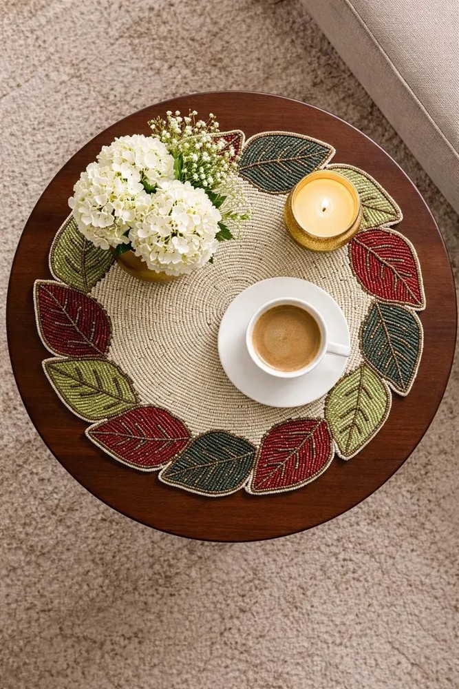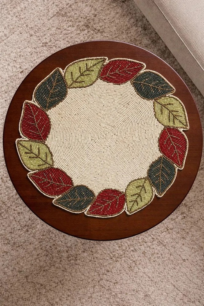 Bring warmth and seasonal charm to your table with this elegant glass bead placemat, beautifully handcrafted with a stunning fall leaf wreath design. This round handmade placemat features rich red, green, and earthy tones—perfect for fall placemats, weddings, and cozy dining setups. Designed with intricate beadwork, it adds a luxurious touch to your boho table decor and enhances any dining experience. Whether you're hosting a festive dinner or styling your home, this premium placemat blends artistry with functionality. Size: 14 Inch