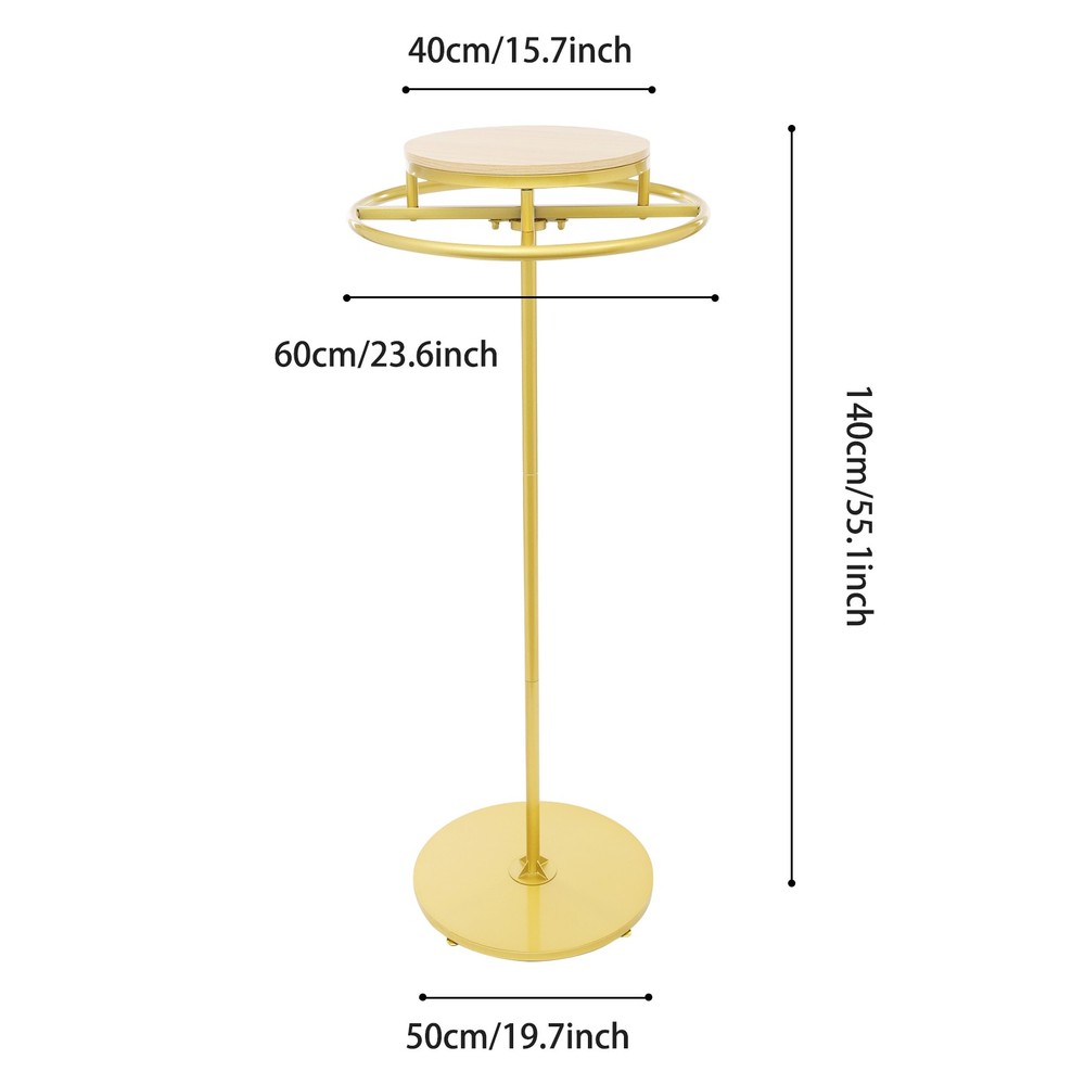 Color: Gold, Log Color Shape: Round Style: Modern Material: Iron, Wood Process: High-temperature Baking Paint Mount Type: Free Standing Assembly Required: Yes 360° Rotatable: Yes Base Diameter: 50cm/19.7in Product Height: 140cm/55.1in Wood Board Diameter: 40cm/15.7in Wood Board Thicknesses: 16mm/0.63in Rack Diameter: 60cm/23.6in Package Size: 62.5*62*14cm/24.61*24.41*5.51in Gross Weight: 7.5kg/16.53 lbs Net Weight: 7.13kg/15.72 lbs Package Included 1* Clothes Display Rack 4* Foot Pads 1* English Installation Diagram All Accessories for Installation Round Clothing Rack, Clothes Display Rack, Rotatable Garment Rack Gold Description Are you still struggling with disorganized clothing arrangements? Our premium clothing display rack is here to solve your problem. Crafted from premium materials and designed with exquisite craftsmanship, it offers both sturdiness and durability. It can provide enough storage space for your various clothes. With its generous appearance, it can embellish your clothing store. In short, it will be a display and storage assistant, creating high sales for you. Key Features High-class Material: This product is made of wood and iron with a high-temperature baking paint process, which is impact-resistant, rust-proof, and not easy to deform, ensuring long-term use. Wide Display Space : The 23.6-inch diameter round rack and open structure provide plenty of space for you to hang more coats, dresses, and other apparel (not included) to make the room more neat and organized. Ideal Height: The 55.1-inch height design allows you to hang longer gowns and dresses, effectively preventing clothes from dragging on the floor, while reducing wrinkles and keeping clothes in good shape. 360° Rotation: This design allows you to easily access your clothes without struggling to find them, saving time and energy. Thoughtful Design: The top wooden board can be used for placing signs, shoes, handbags, and other items, maximizing the use of space and adding more convenience to your clothing store. Easy to Clean: Thanks to its smooth surface and simple construction, you can easily clean it with a damp rag (not included)! Fashionable Appearance: The product adopts elegant color matching and smooth line design, which shows the fashionable and generous temperament, and easily integrates into the environment of all kinds of clothing stores and enhances the taste of the stores. Simple Installation: This product is simple in structure, equipped with complete accessories and an English installation diagram, and easy to install. You can finish the installation by yourself. Buy with Confidence: We stand behind all our guests and look forward to assisting you with your purchase. It is our pleasure to answer your confusion and questions. The end of the story between us is not "we sell and you buy". Details Stable B ase: The large round base (diameter: 19.7in) increases the contact area and provides stable support. In addition, 4 adjustable foot pads can adapt to uneven floors and ensure stable placement of this product without easily wobbling or sliding. Rounded Edges: Rounded and smooth edges effectively prevent your clothes from being scratched, taking good care of every garment. Application It can used to hang various clothing and scarves. It is suitable for clothing stores, boutiques, children's clothing stores, bra stores, retail stores, homes, dorms, etc. It can not only hang women's, men's, and children's clothes, but also towels, scarves, and other items such as bags, and umbrellas. Specifications Color: Gold, Log Color Shape: Round Style: Modern Material: Iron, Wood Process: High-temperature Baking Paint Mount Type: Free Standing Assembly Required: Yes 360° Rotatable: Yes Base Diameter: 50cm/19.7in Product Height: 140cm/55.1in Wood Board Diameter: 40cm/15.7in Wood Board Thicknesses: 16mm/0.63in Rack Diameter: 60cm/23.6in Package Size: 62.5*62*14cm/24.61*24.41*5.51in Gross Weight: 7.5kg/16.53 lbs Net Weight: 7.13kg/15.72 lbs Package Included 1* Clothes Display Rack 4* Foot Pads 1* English Installation Diagram All Accessories for Installation Notes Please check the product size before ordering to make sure it fits your needs. Please note that this product only includes a rack without clothes. Please allow the slight color difference caused by the shooting light and 1-3cm error due to manual measurement, and make sure you do not mind before you order. Payment Delivery details Terms of sales About us Contact us Payment We accept ebay payment 。 Fees such as import duties, taxes are not included in the item price or shipping costs. These charges are the buyer's responsibility. Delivery details Shipping: 2-9 working days to: USA Terms of sales We maintain high standards of excellence and strive for hundred percent customer satisfaction. Feedback is very important to us. We hope that you contact us immediately before you give neutral or negative feedback, so that we can address your concerns. It is impossible to address issues if we do not know about them! About us Your satis faction is our ultimate goal. We work hard to earn your trust and future business. Our certified technicians have tested each item before shipping. The unit comes with 1 year limited warranty on all manufacturing defects. a) If you receive a defective item, you may return it or ask for a discount. Please contact us within 14 days after you receive the package. b) What you returned must be intact and in its original packaging as re? u. Customer is responsible for shipping costs of the returned item. c) We will cover the cost of shipping back t with the shipping rate indicated in the registration page. We will send you a new unit or refund the full payment you paid. Thank you. Contact us Business Hour Business Hour: Monday To Friday: 8:30 AM to 5:00 PM (Beijing China time) Due to time zones, our reply to your questions may not be immediately. But within above working time, we will reply your email within 24 hours. If it's non-wo