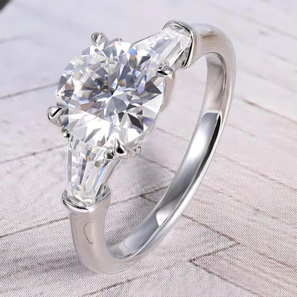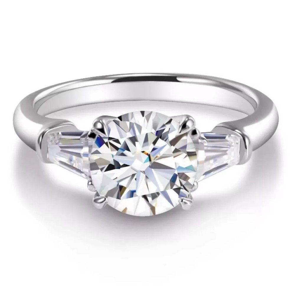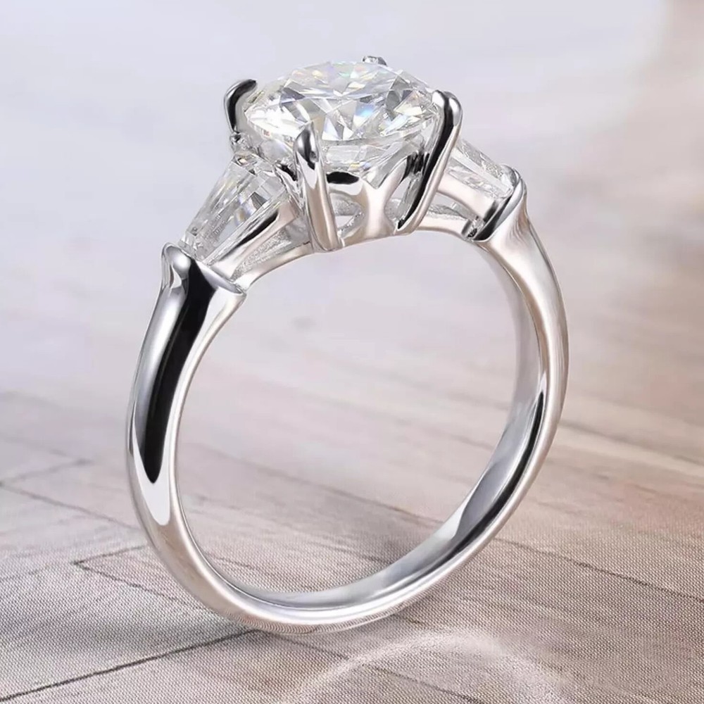 Round Cut Natural Moissanite Three Stone Engagement Ring 14K White Gold Plated