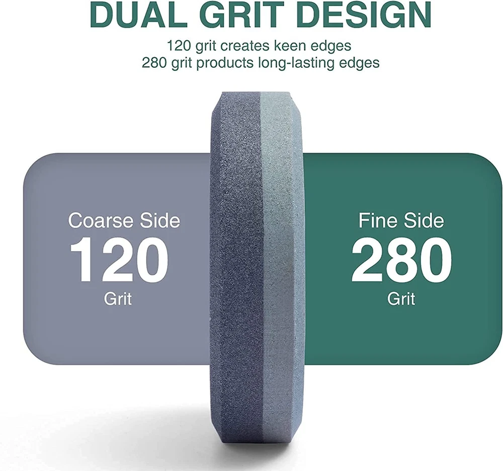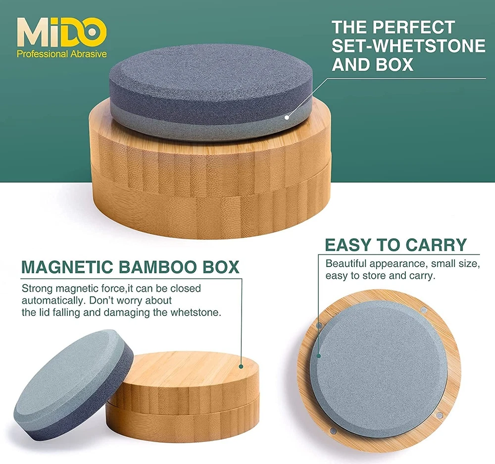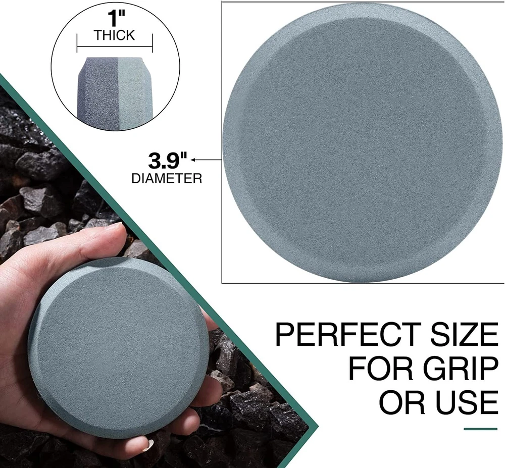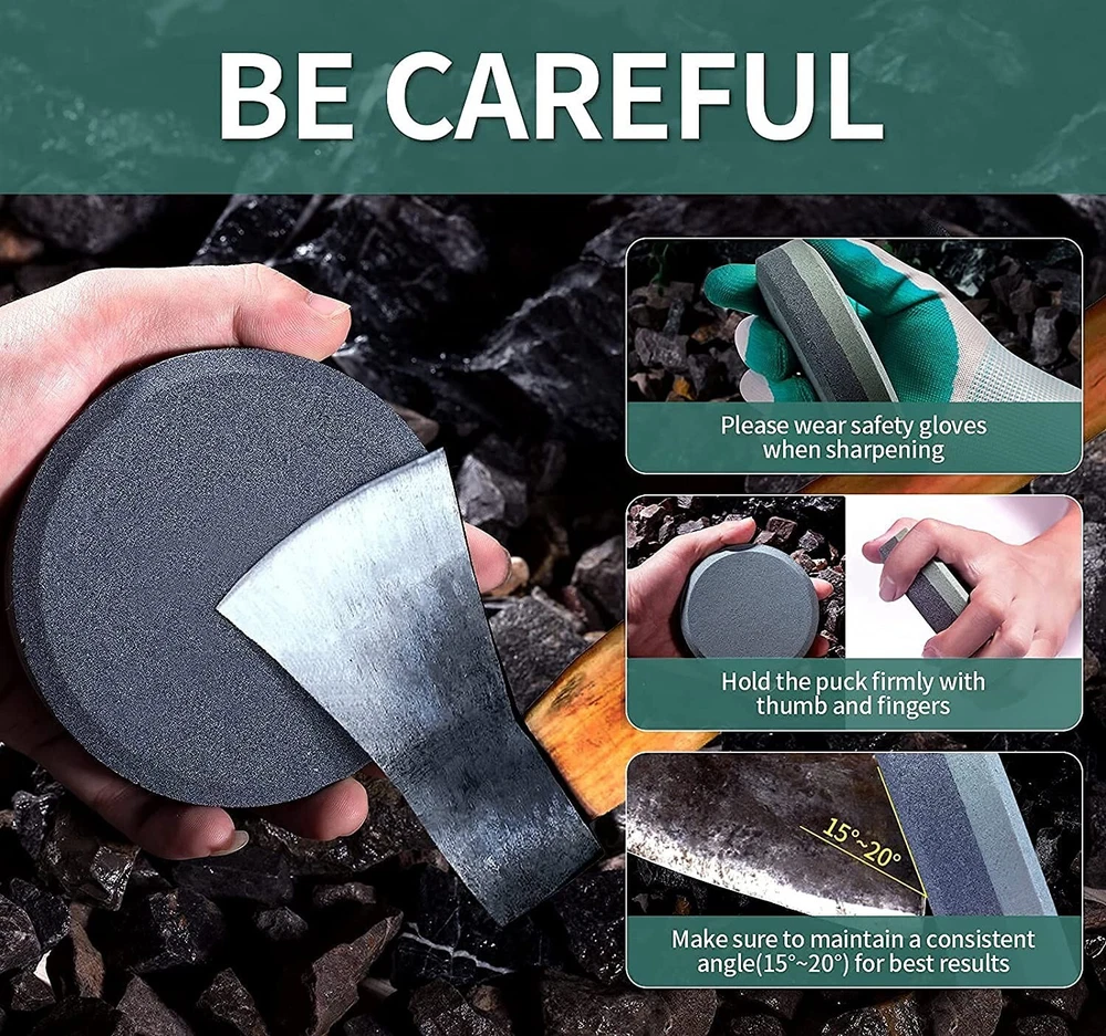 Round Dual Grit Sharpening Stone Axe Blade Edge Sharpener Lansky Puck Hand Tool Material Carborundum, Stone Color 120/280 Grit Product Dimensions 5.11"L x 5.11"W x 1.77"H Grit Type Coarse, Fine High Quality: Axe sharpening puck is made from high quality silicon carbide material, Which has perfect grinding effect with fast speed. And, this material has good corrosion resistance and good grinding effect,portable and durable. Large Size:Large axe sharpening stone, diameter 3.9 inches, easy-to-grip, contoured shape provides for safe. Its size is convenient for you to have a firm grasp when using it. Multi-Purpose Stone: This axe sharpening kit is ideal for repairing and consolidating lawn mower blades, machetes, axes, spades, kitchen knives, hatchet sharpener, throwing ax sharpener stone, knife sharpener, camping sharpening stone, machetes, axe blades, shovels, spades and more. Dual-Side Design:Double-sided grit 120/280 puck sharpener with circular design, Suitable for repairing outdoor tools and relatively dull knives. 120 grit (black) can quickly sharpen blunt edges and repair gaps, and 280 grit (green) can improve the smoothness and sharpness of the knife surface. Bamboo Box:The unique synthetic process makes the bamboo box not easy to crack. The closing part is equipped with powerful magnets. Therefore, the box can be closed lightly and not easy to open. Such exquisite workmanship allows the bamboo box to store other items or as home decorations. The closing part is equipped with 4 powerful magnets. ALIGN the magnets, SO the box can be closed lightly and not easy to open. Diameter 3.9 inch, easy-to-grip. The elegant Bamboo box can be used not only for the whetstone, but also for the small items you like. NOTE:Keep the whetstone DRY when you put it back in box. NO EXPENSIVE OIL NEEDED Axe/Tools sharpener needs only Water, so no need for expensive oil. The slurry that forms on top of the water stone is what is doing the work. So while you are sharpening your axe/tools, don’t wipe the water off, also before you start using a water stone, make sure you soak it into the water. EASY TO USE Lock the tool in a vice or hold it firmly in your hand. Move the whetstone in a circular motion along the entire cut edge. It is best to grind with an angle of 15°~20°. SHARPENER TOOL Whether it is an axe, hatchets, machetes shovels, lawnmower blades, knives, etc., every homeowner, camper, and woodworker needs an effective tool sharpener like a sharp pebble axe dual grit sharpener