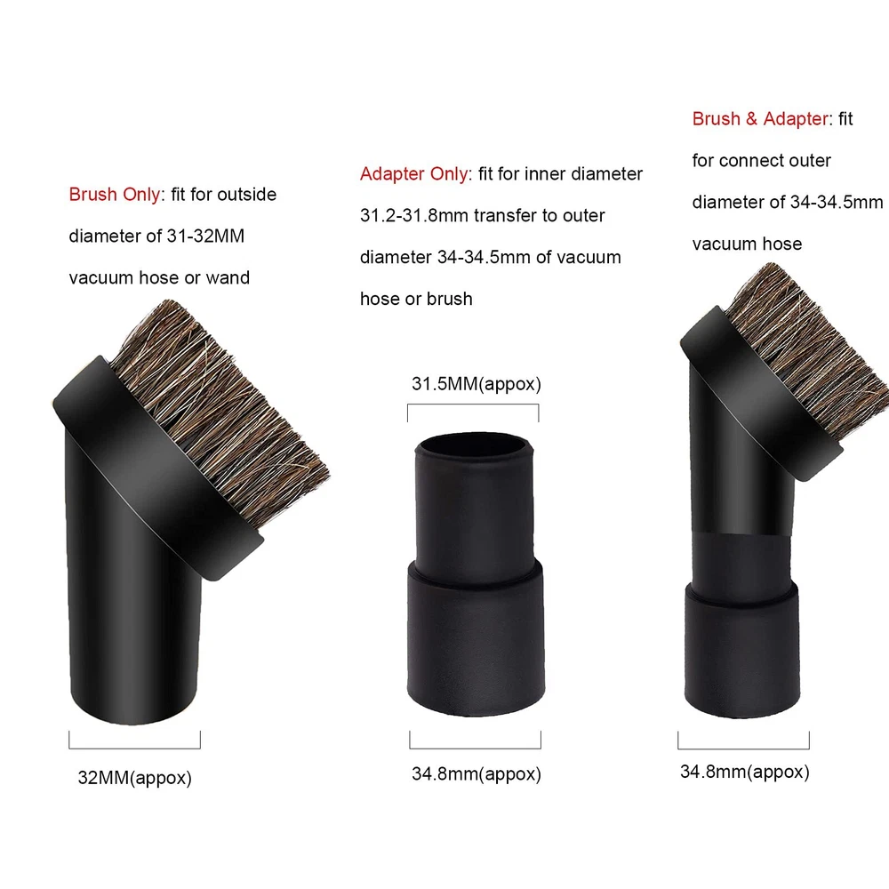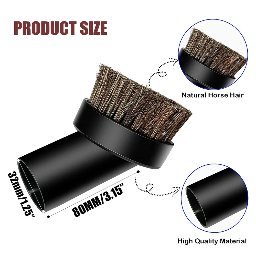 Horse Hair Vacuum Brush Size: Standard 1.25" (32mm) inner diameter size horse hair brush, so outside diameter of the vacuum wand or hose connect to it should be smaller than 1-1/4inch(32mm) which is 31mm or 30.5mm. Adapter Size: Big head inner diameter is 1-3/8 inch, small head inner head is 1-1/4 inch hose adapter, so outside diameter of the vacuum wand or hose connect to it should be smaller than 34.8mm which is 34-34.5mm. The adapter provides the possibility for other types of vacuum Clean hard-to-reach areas: Extract dirt, pet hair, freshen up your car, curtains, fine furniture, celings or door frames. Replace your lost or old brush attachment, or add cleaning tool Material: Made with tough ABS materil and natural horsehair bristles What You Get: 1 x 1.25" Horse Hair Vacuum Attachment Brush, 1 x Adapter(1-3/8" to 1-1/4"), our worry-free 30 days money back, and friendly .