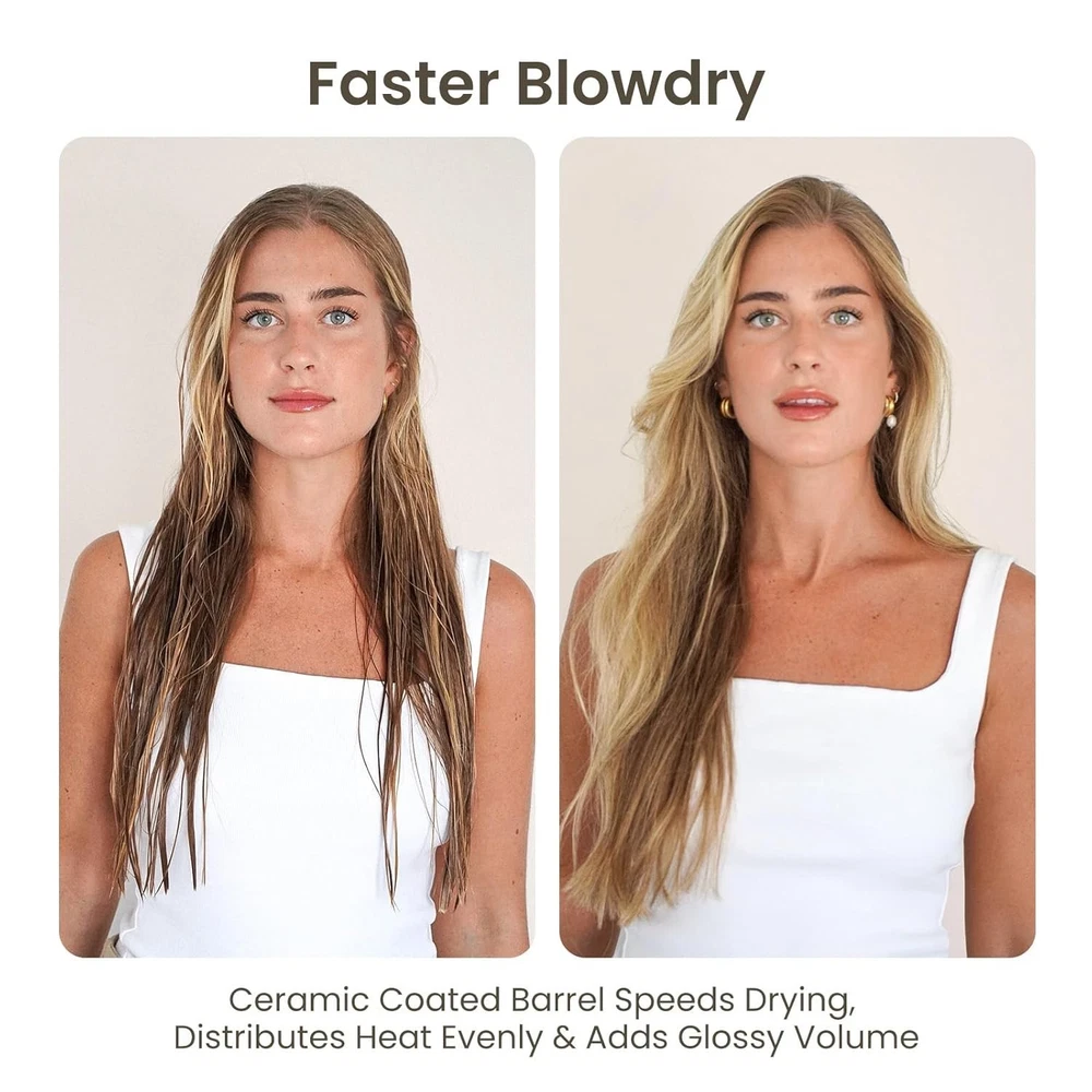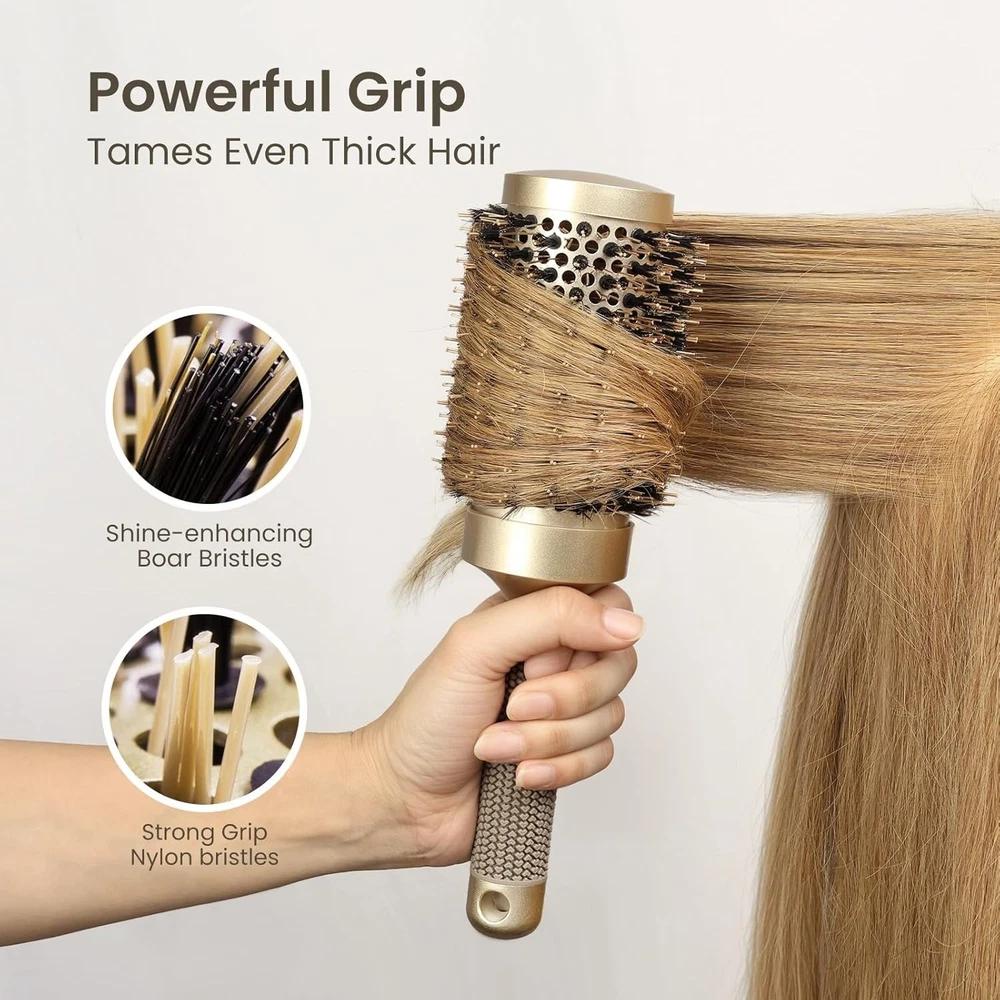 Round Hair Brush, Nano Thermal Ceramic & Ionic Tech, Inch Barrel with Boar Bristles for Enhanced Texture, Golden, Hair Drying, Styling, Curling and Shine + 4 Free Clips Inch Large Round Brush for Long Hair:With an overall diameter of inches (including bristles) and inch is barrel diameter, this large round brush is ideal for women with long hair around chest. It’s perfect for creating a voluminous blowout and soft, smooth hair Faster Hair Blow Drying: round hair brush features a vented ceramic-coated barrel, which ensures superior airflow and even heat distribution. Ceramic coating prevents excessive heat transfer from your blow dryer, cutting hair drying time in half while reducing heat damage and breakage Nano thermal ceramic ionic technology: Our round brush will add endless shine and blaze on your hair every time you use. Enhance the looks of your hair, improve texture and reduce brittle hair and split ends! It helps reduce frizz and add shine. Cuticles are sealed, producing a smooth, soft texture from roots to ends. It creates loose curls and waves in medium to long hair and helps straighten and add volume to shorter and medium styles With boar bristle: Human scalp produces oil called sebum which acts as a protector for hair. The boar bristles help to spread this sebum around to lubricate each of your hair strands which reduces frizz. For Smooth Finishing and Quick Drying. Enhances Shine with Boar Bristles Ergonomic handle design, comfortable and non slip: No more slippery handles, no more hand fatigue. Our round barrel thermal hair brush is equipped with an ergonomic and humanized palm shape handle. Its anti-slip rubber design ensures easy and no-hassle use