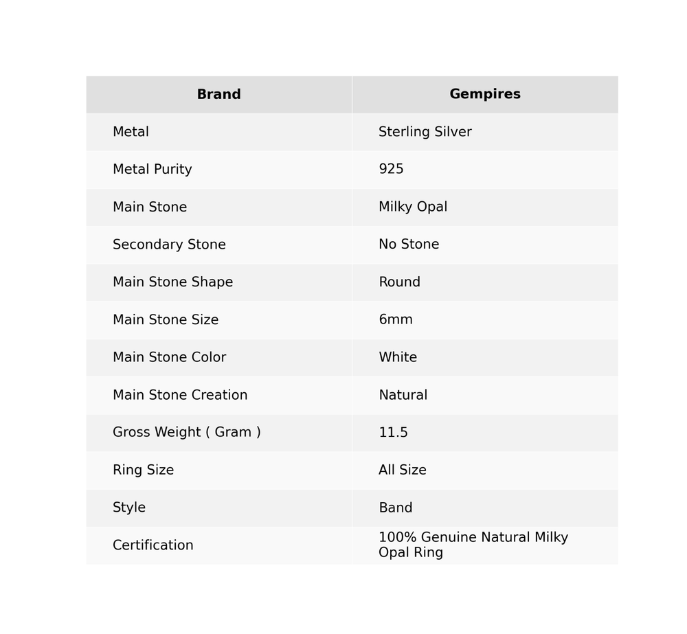 Welcome To Our Shop Gempires ------------------------------------------- With a very minimalist design yet attractive approach, this Ring would be the best choice to gift someone you love. It features luscious 925 Sterling Silver with adornment of glitzy Milky Opal. Don't wait to get this superb jewelry piece. Round Natural Milky Opal 925 Sterling Silver New Band Ring Jewelry Size All Size Check My Other Ring Listings : Click Here SKU:- RR-54-17 Metal:- Sterling Silver Metal Purity:- 925 Gemstone:- Milky Opal Gemstone Color:- White Gemstone Shape :- Round Gemstone Creation :- Natural Stone Setting :- Bezel Ring Size:- All Size US ___________________________________________________________________ Shipping Handling - Free Standard Shipping all over the world Handling Time - 2 to 5 BUSINESS Days Delivery Time - 7 to 20 Days ( Various on destination ) _________________________________________________________________ Returns - 1.We provide a 100% Money Back Guarantee, excluding shipping costs, within 30 days from the date of item receipt. 2.The item must not be altered or damaged in any way shape or form. 3.Upon receipt of the aforementioned items, your payment will be promptly refunded. 4.Please be so kind as to contact us via email in order to acquire comprehensive return instructions before proceeding with the return of the merchandise. 5.Kindly be advised to allocate a maximum period of 1 business day for the processing of all returns, in order for the appropriate credit to be applied. 6.Sizing does not affect the return policy. _________________________________________________________________ FAQ's - Q.1 ARE THE ITEMS YOU ARE SELLING BRAND NEW? We exclusively offer brand-new products, refraining from the sale of pre-owned jewelry. Our entire jewelry collection is composed of 100% natural, conflict-free pieces. We do not engage in the trade of imitation or lab-grown gemstones and diamonds. Q.2 WHAT ARE YOUR BUSINESS HOURS? we operate 24x7 as we have a dedicated team who works in different shifts to deliver the services to our valuable customers. ________________________________________________________________ Gempires is committed to delivering customers an unparalleled experience through the provision of exquisite handmade jewelry, meticulously crafted to uphold the most exacting standards of quality. Our operations encompass dual roles as both discerning connoisseurs and skilled artisans within the realm of jewelry making. We proudly hold an extensive proficiency in the fine art of enhancing gemstones, allowing us to harmonize them seamlessly with diverse aesthetic inclinations. We are delighted to extend to you the privilege of curating your very own jewelry collection. This collection will be graced by the presence of genuine and splendid natural gemstones, each possessing an innate authenticity and beauty that is truly unparalleled. **** STAY BLESSED ALWAYS*****