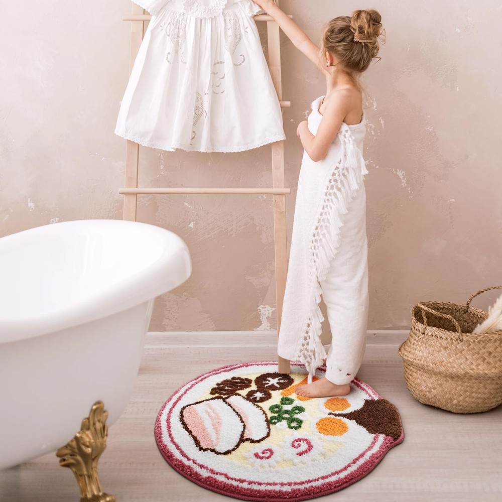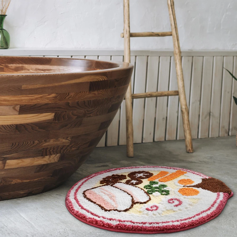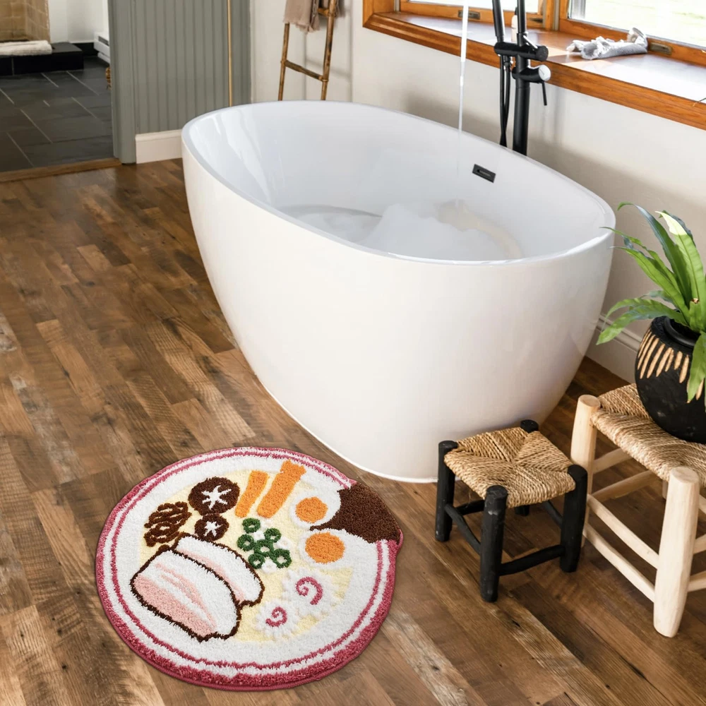 Unique Design: This bath mat with ramen designed is very cute for room decor. The size of the round bath mat is 23.6 * 24 inches. The soft plush material makes you feel like stepping on the cloud, and you and your family will have a comfortable, fluffy, warm and soft experience Excellent Absorbent: The ramen rugs feature thousands of individual microfiber medium-pile can absorb a lot of water at a high speed to help save your floors from dripping water while you're stepping out of the Shower, Bath, or getting ready for the sink Non-Slip: The backing of the anti-slip bath mat is made of durable TPR anti-slip rubber, which can greatly prevent slipping. For safety, please keep the bottom of mat dry. Before using a mat, test with your foot to ensure it doesn't move Easy Care: The circle bath mat is easy to clean, hand washed, or fully machine washed is fine. No worry that it could get fibers. The pattern on the bathroom rugs will not fade after multiple machine washes Various Places of Use: The soft tufted bath mat can be used for bathroom, bathtubs, living room, and kitchen or even used as a room decor. Our fluffy bathroom rugs are a good choice as a birthday present or a special holiday present to your friends and family