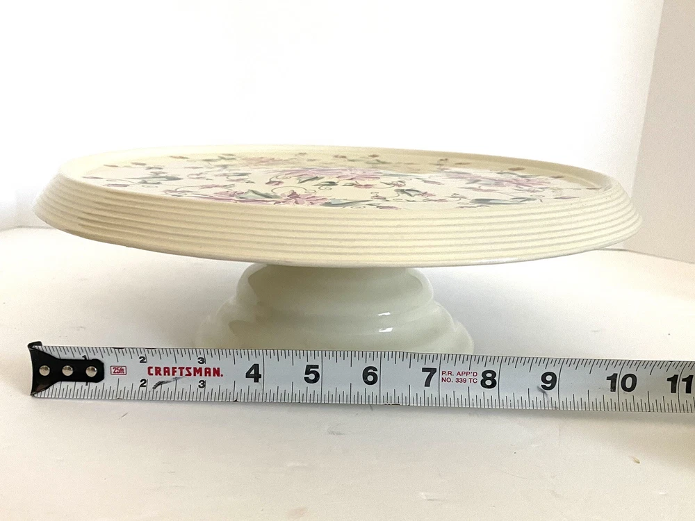 Chic Classic 11” Pink Floral & Ivory Decorative Ceramic Pedestal Cake Stand Weddings, Baby Showers, Anniversaries. Perfect for cupcakes, cake, cookies, or any other dessert pastries. Pretty floral pink, green, and gold, on Ivory Ceramic. Excellent condition. No chips or breaks.