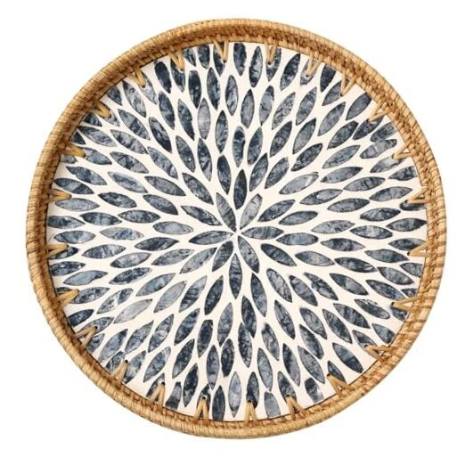 Return Policy Fast Delivery Trusted seller Round Rattan Tray with Mother of Pearl Inlay, Rattan Serving Tray for Coffee, Bread, Fruits, Decorative Wicker Tray for Table Decor, Home Decor, Kitchen Island Decor (Dark Blue Leaf, 11.8") Product Description ★Size and Style: 11.8" Diameter, Dark blue leaves pattern. ★Handwoven Natural Rattan Tray: This rattan tray is hand-woven from rattan, with strong wood core. The mother of pearl inlay on the surface with a glossy lacquer, only need wipe this tray with a damp cloth to clean it ★Easy to Pick and Non-slip: Rubber on the bottom of the tray is designed to prevent slipping, it a durable practical decorative tray for cup, dishes, coffee, tea ★Wide Application: This wicker serving tray be used for storaging fruit, bread, food, coffee, tea, vanity, perfume, jewelry, coins, keys ★Good Decor: A good decorative tray for coffee table, ottoman, bathroom, bed, home, living room, hotel, restaurant, office Shipping Returns Payment Shipping Shipping is FREE to all addresses other than APO/PO boxes in the lower 48 states. All our stock ships from US-based warehouses. Shipped via USPS or UPS (depending on location and package weight) Unless stated otherwise, all orders will ship within 24-72 hours of your payment being processed. Check our feedback to see the great reviews of FAST shipping we offer. Returns Seller does not accept returns Payment We currently accept payment via eBay managed payments only. Once payment is cleared, we will dispatch your shipment within 1-3 business days. Please refer to the "Shipping" tab for more information regarding shipping speed to your destination.