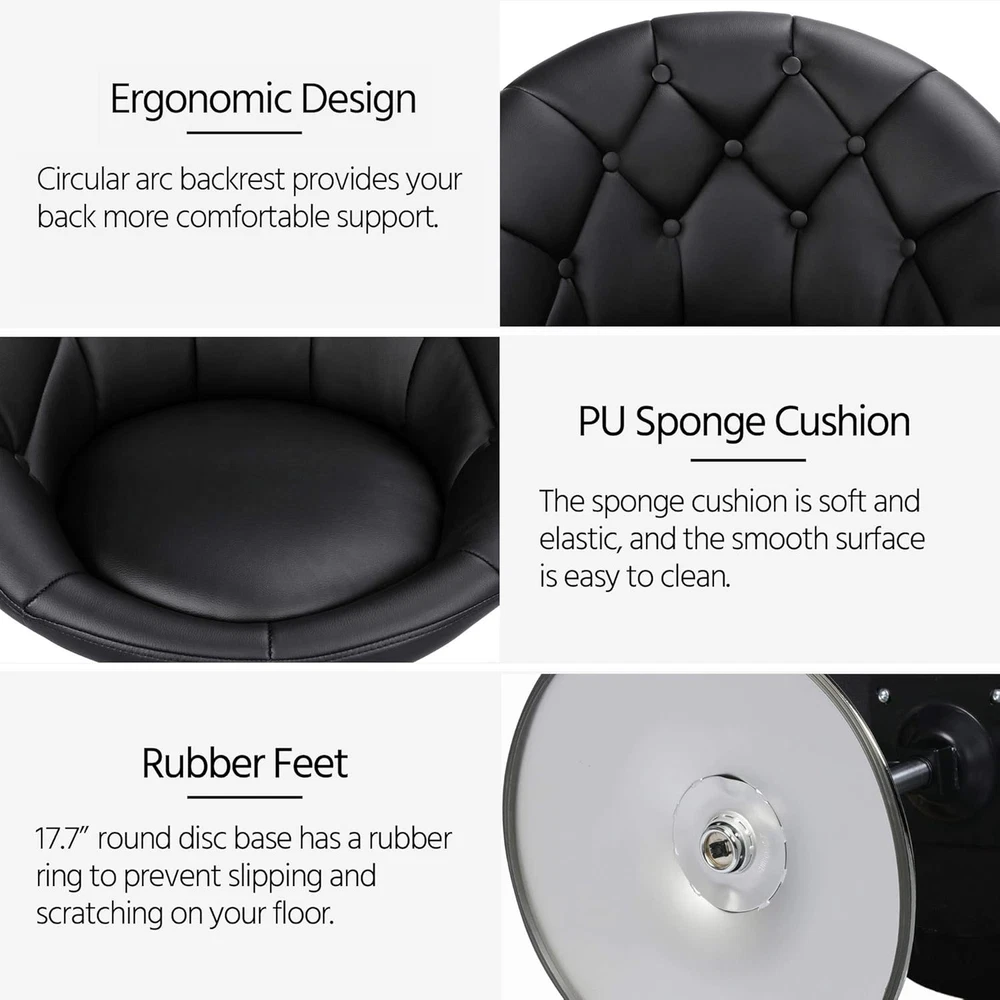 Store New Arrivals Add to Favorite View Feedback Contact round Tufted Back Chair Contemporary Height Adjustable, 360° Swivel, Accent Vanity Chair for Living Room, Modern Look, Black Description Item model number YTua310005001 Style Modern Cushion Style Tufted Pattern Solid Country of Origin China Seat Height 18 Inches Theme Modern Seat Back Interior Height 14.2 Inches Unit Count 1 Count Room Type Kitchen, Living Room, Dining Room Is Customizable No Frame Material Engineered Wood Seat Material Type Faux Leather Maximum Weight Recommendation 276 Pounds Material Faux Leather Item Weight 16.09 Pounds Age Range (Description) Adult Arm Style Arm Rest Leg Style Tapered Leg Finish Type Polished Included Components User Manual Indoor/Outdoor Usage Indoor Number of Height Positions 4 Recommended Uses For Product Office, Dining Back Style Solid Back Item Weight 16.09 pounds Fill Material Foam Surface Recommendation Hard Floor Is Foldable No Special Feature Portable, Adjustable Height, Arm Rest Furniture base movement Swivel Weight 16.09 Pounds Color Black Form Factor 360-degree,Contemporary,Modern,Upholstered Material Type Faux Leather Shape Round Furniture Finish Leather Model Name Accent Chair Product Dimensions 23.5"D x 28"W x 36"H Seat Depth 17.7 inches Size 23.5"D x 28"W x 36"H Quality Tufted Chair: Our round-back swivel chair is arranged atop a polished electroplated metal pedestal base, and its seat is wrapped in luxurious-looking PU leather upholstery with great texture. The premium plywood inside makes this chair more solid and stable, holding up to 276 lb. Breathable & Soft Cushion: The seat of this upholstered swivel barrel chair is filled with selected sponges and covered by high-quality faux leather with fine texture, bringing you a super breathable, resilient, and soft user experience. Elegant Addition to Any Room: Defined by its classic button-tufted design, this accent barrel chair is a fine fit for any high-class aesthetic. The adjustable seat height of this makeup chair ranges from 12.6″ to 18″, allowing you to easily store it under your vanity table or study desk. An ideal addition to the home office, bedroom, study, vanity, and other small spaces. 360-degree Swivel Chair: The faux-leather wrapped round seat is founded atop a posh 360-degree swivel pedestal base, which allows effortlessly sitting, leaving the seat, and changing sitting position without moving the base, especially practical for the workspace and makeup room. 4 Parts, 3 Steps, 1 Person: This barrel chair is easy to assemble with included parts and instructions, taking only a few minutes of your time. A rubber ring under the pedestal base is adopted for floor protection and to reduce noise and slipping. Product Description ABOUT US We offer the best prices around on high quality products. Our E-store includes media such as books, movies, music and games while offering electronics, toys, sporting apparel, clothing, tools, general home, garden items and more. SHIPPING We are always working hard to ensure your package arrives as soon as possible. Please understand that some factors like weather, high postal traffic, and the performance of shipping companies are outside of our control. We offer free shipping to the lower 48 states and ship within 2 business days of payment, usually sooner. We do not accept P.O. Boxes. Please provide a physical address. For shipping outside of the continental USA, we only use eBay's Global Shipping Program.The item is shipped to KY and then sent to the rest of the world. International customers are responsible for all duties and taxes. Continue to check out in order to calculate costs for shipping the item to your country. Messages regarding eBay's Global Shipping Program MUST be directed at eBay EXCLUSIVELY. RETURNS We offer a 30-Day Return Policy on items which you are not completely satisfied with. You have the option for a full-refund or an exchange of the item. No returns are available on items shipped outside of the USA. PAYMENT We accept PayPal. CONTACT US This page content is yet to come Please ad us to your favorite seller and visit again later Thank You CUSTOMER SATISFACTION We try our very best to make sure every customer is completely satisfied. If there's a problem, message us! We're happy to help. WE ACCEPT Copyright © 2021 AutoDS. | All Rights Reserved