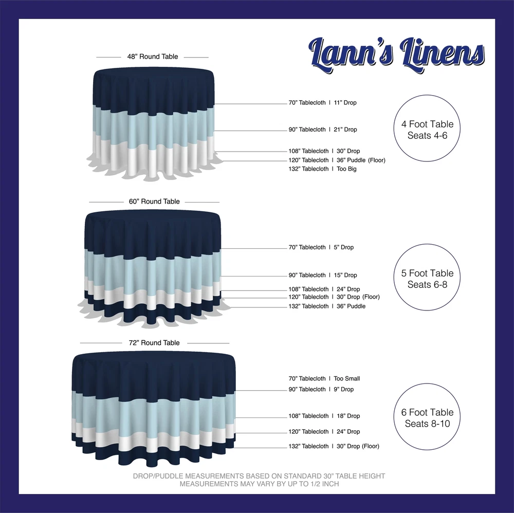 Stain resistant: Specially-treated fabric resists discoloration and is stain-resistant. Ideal for entertaining and kid-friendly, any spilled liquid beads up for easy cleaning. Wrinkle-resistant: Looks just like luxurious cotton but made of soft, 100% polyester fabric that resists wrinkling for an always crisp, polished look. Color-fast dyes: Our color-fast dyes stay vibrant and true, and will not fade, bleed, run, or transfer during washing or use. Durable: Our premium-weight fabric is designed to withstand repeated use and frequent laundering. These tablecloths are machine-washable with no need for expensive rental or dry cleaning fees. Perfect for any occasion: Lann's Linens tablecloths are elegant enough to compliment any wedding or banquet decor, yet stain-resistant and sturdy enough to endure the repeat usage of a gourmet restaurant or hotel. For exceptional presentation and drape that creates a lasting first impression, Lann's Linens sets the standard for the finest upscale, professional-grade wedding tablecloths. Constructed on a hydraulic loom from 180 GSM (grams per square meter) spun polyester, the result is a tightly woven, luxurious yet durable smooth-textured finish designed to resist staining and stretching for exceptional long-term wear and repeated use. This restaurant-grade tablecloth holds its shape and won't stretch or tear like inferior-grade fabrics. Instantly create timeless elegance for weddings, banquets, fine dining settings, buffets, and more, or use for themed or ornate party table settings. Cut entirely from a single piece of fabric, this one-piece seamless design makes set-up and removal a snap. Popular serged edge design provides a neat, clean hemline that won't fray. Item is 100% brand new, first-run production. Due to the many variations in monitors and browsers, color samples may appear slightly different than actual product. Well-known within the national hospitality and restaurant industries, private wedding and banquet venues, and the party planning community, Lann's Linens is your trusted source for premium-quality, durable tablecloths that provide 5-star style at an affordable price. Fast shipping! Most orders ship out the same business day by FedEx, USPS or DHL Global Mail Expedited. Our eBay Store | Terms of Sale