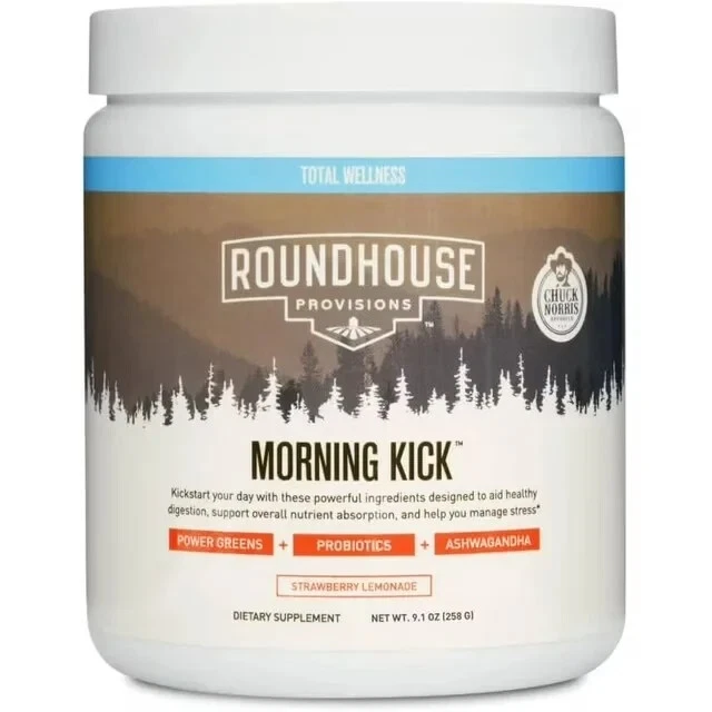 Roundhouse Provisions MORNING KICK digestion Strawberry Lemonade 9.1oz Brand Kick start your pallet and greet the dawn with a vivid, nutrient-rich breakfast—a feast of flavors that feeds both body and spirit, inspiring your day to unfold wonderfully. Morning Kick, a tasty nutritious greens powder drink that tastes like strawberry lemonade. Enjoy perks such as better digestion, less bloating, balanced gut bacteria, improved bowel movements, stress relief, GI strength, vitality, and joint care. Ingredients: morning kick is composed of all natural ingredients that are as follows: Green blends: Nutritious foods like spirulina, chlorella, and kale are used in the Morning kick that aids in achieving healthy weight and metabolism as well as provides a lot of energy. Prebiotics and probiotics: Prebiotics and probiotics is also another most essential component of Morning Kick that helps in easy digestion, less bloating, prevents from gas, and as well as infrequent constipation. Collagen peptides: Collagen peptides used in morning kick are beneficial for joints and muscles and aids in achieving a healthy body. Ashwaganda: Another super ingredient used in Morning Kick is the Ashwaganda scientifically known as Withania Somnifera works as an Anti-aging component, reduces stress, boost energy, improves overall immune system, elevates mood. Usage: Morning Kick is easy to prepare all you have to do is mix a scoop of Morning kick in 8 fluid ounces of water. Its lovely strawberry lemonade taste offers a great pick-me-up at any time of day or night, emergency or not.