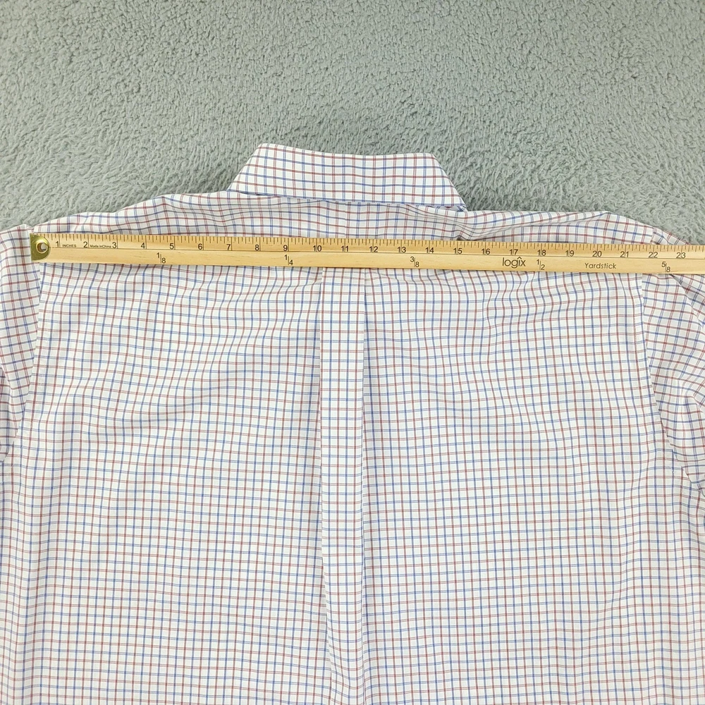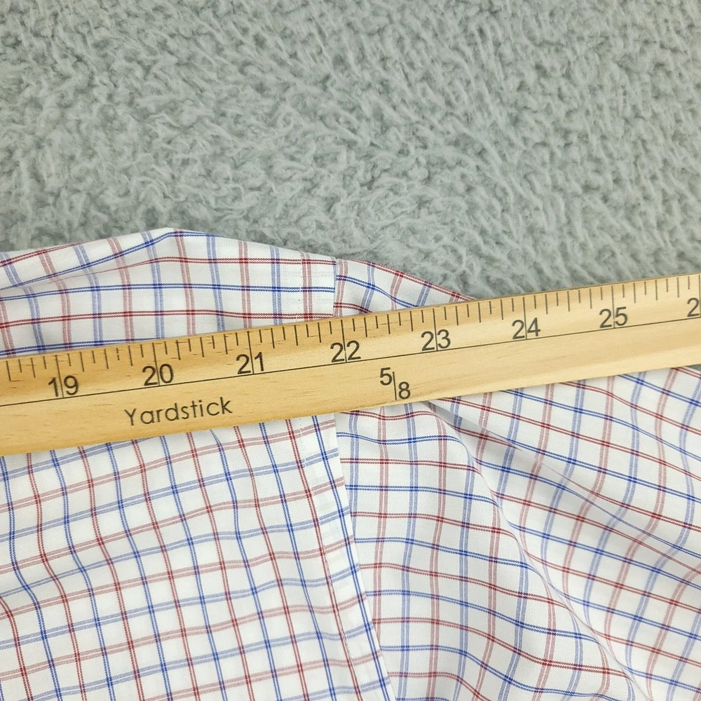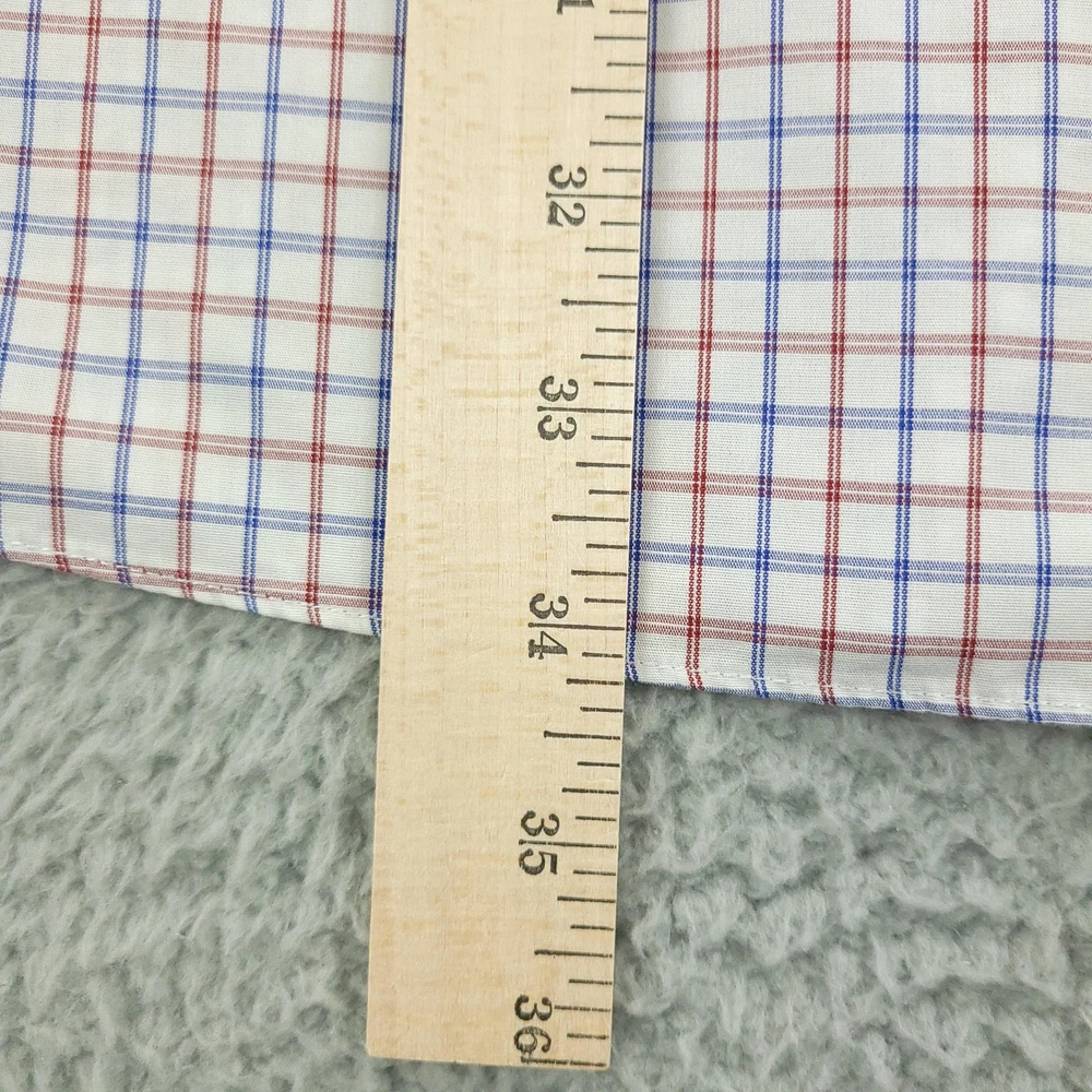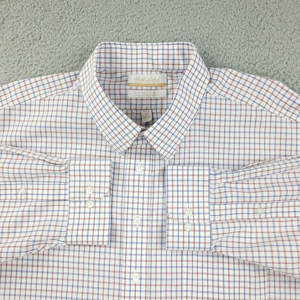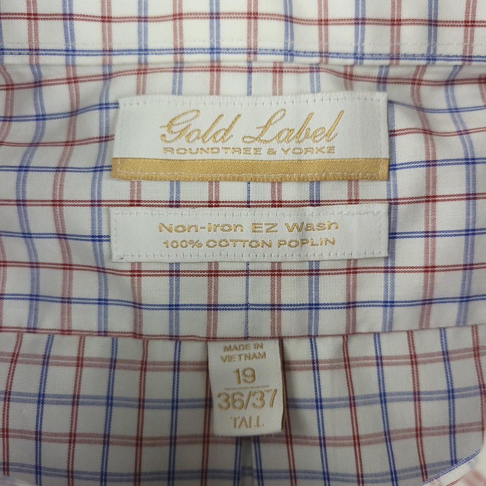 Roundtree & Yorke Gold Label Dress Shirt Mens 19 36/37 Tall White Check Non Iron Brand: Roundtree & Yorke Gold Label Style: Mens long sleeve button-front dress shirt with button-down collar and single chest pocket; tall Big & Tall fit. Color: White base with red and blue grid check pattern. Tag size: 19 inch neck, 36/37 sleeve, Tall (Big & Tall). Material: 100% cotton poplin. Features: Non-iron EZ Wash easy-care fabric, barrel cuffs with two buttons, back box pleat, curved shirttail hem, collared neckline; made in Vietnam. Labels: Gold Label Roundtree & Yorke; Non-iron EZ Wash 100% Cotton Poplin. Measurements are included in the photos, compare measurements with your item to ensure proper fit. Items are added daily click here to Visit My Store Combined shipping for US customers is 1.99 for each additional item Items are cleaned per eBay standards & policies