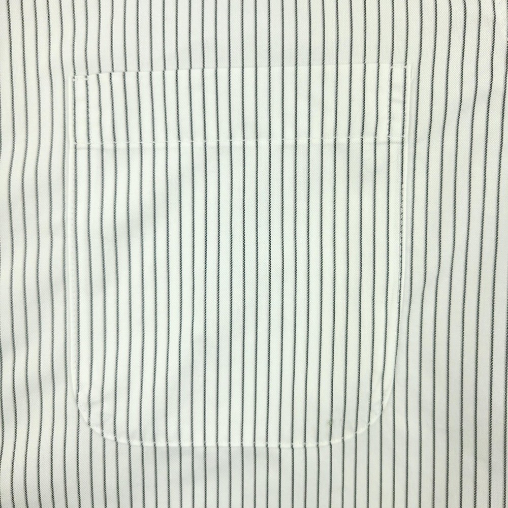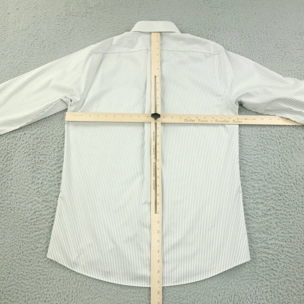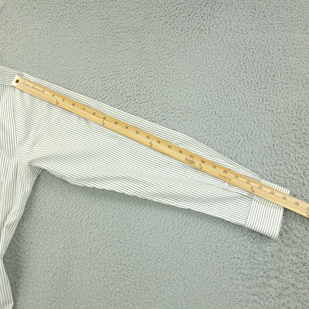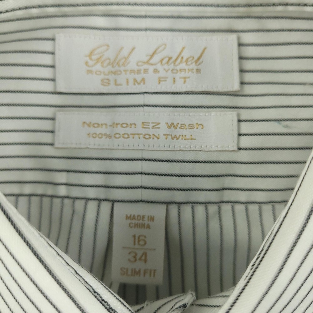 Brand: Roundtree & Yorke Gold Label Style: Mens long sleeve slim fit dress shirt with vertical stripe pattern. Color: White base with thin dark stripes. Size on tag: 16 neck, 34 sleeve, Slim Fit. Material: 100% cotton twill; Non-iron EZ Wash, per inner label. Details: Point collar, full button front, single chest pocket, barrel cuffs with button closure, back yoke with center pleat, curved shirttail hem. Made in China. Washed and dried with Fragrance Free Detergent & Dryer Sheets. Measurements are included in the photos, compare measurements with your item to ensure proper fit. (Measurements are done with the item lying flat). I ship next business day and all items include tracking. Items are added daily to my store Visit My Store Buy More & Save! Combined shipping for US customers - $1.99 for each additional item (Add items to shopping cart and discounts will automatically calculate during checkout)