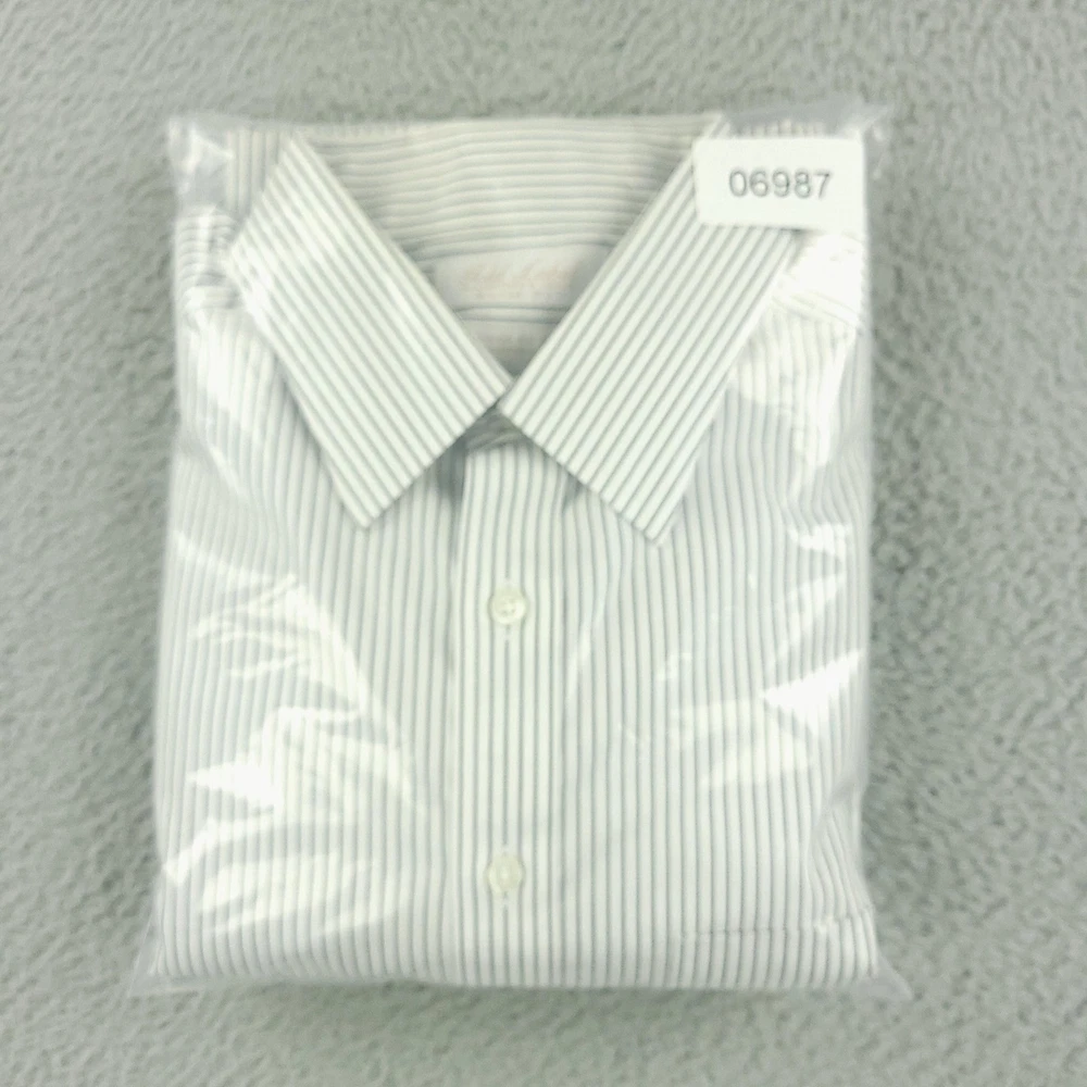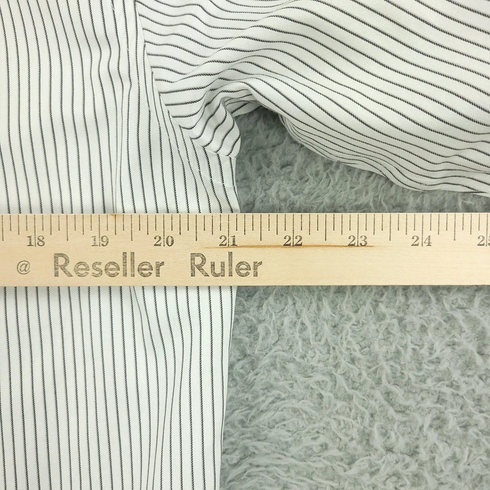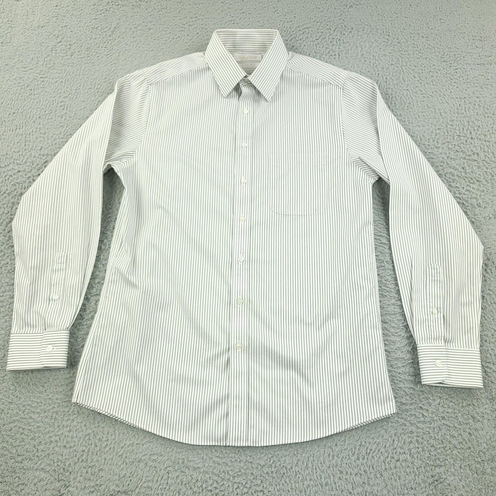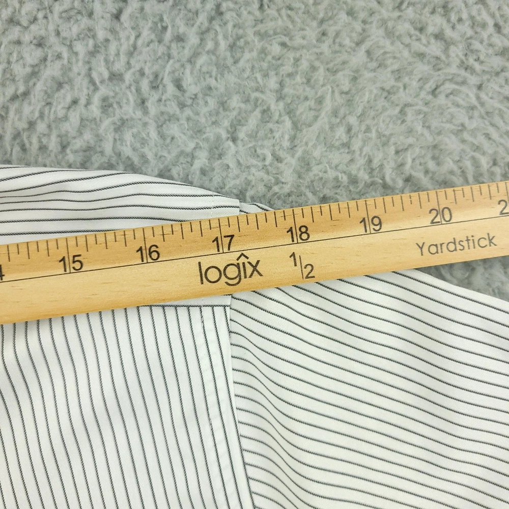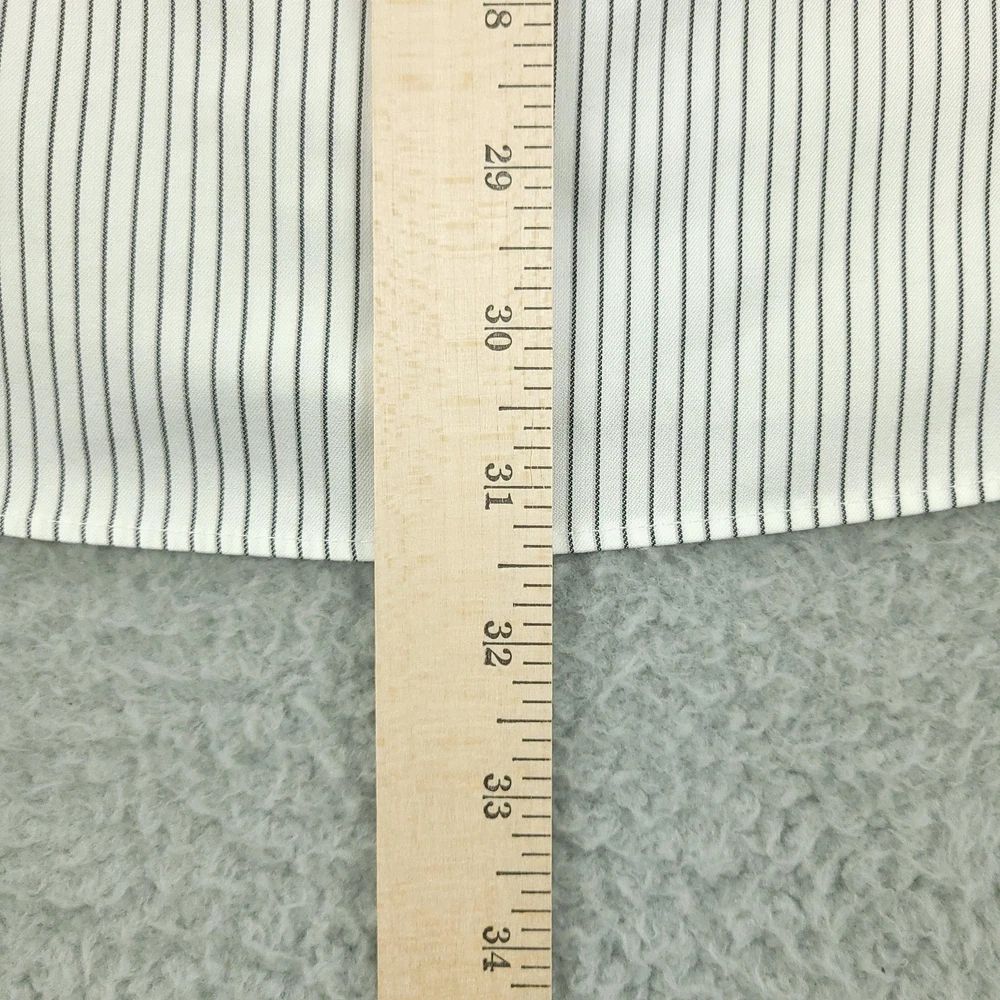 Brand: Roundtree & Yorke Gold Label Style: Mens long sleeve slim fit dress shirt with vertical stripe pattern. Color: White base with thin dark stripes. Size on tag: 16 neck, 34 sleeve, Slim Fit. Material: 100% cotton twill; Non-iron EZ Wash, per inner label. Details: Point collar, full button front, single chest pocket, barrel cuffs with button closure, back yoke with center pleat, curved shirttail hem. Made in China. Washed and dried with Fragrance Free Detergent & Dryer Sheets. Measurements are included in the photos, compare measurements with your item to ensure proper fit. (Measurements are done with the item lying flat). I ship next business day and all items include tracking. Items are added daily to my store Visit My Store Buy More & Save! Combined shipping for US customers - $1.99 for each additional item (Add items to shopping cart and discounts will automatically calculate during checkout)