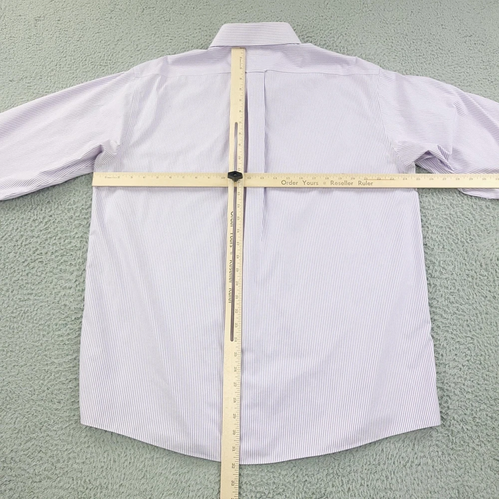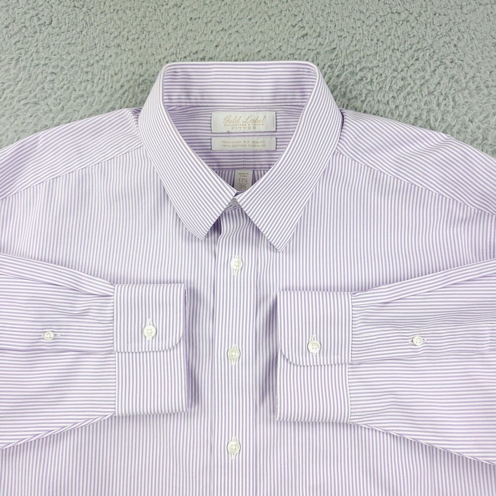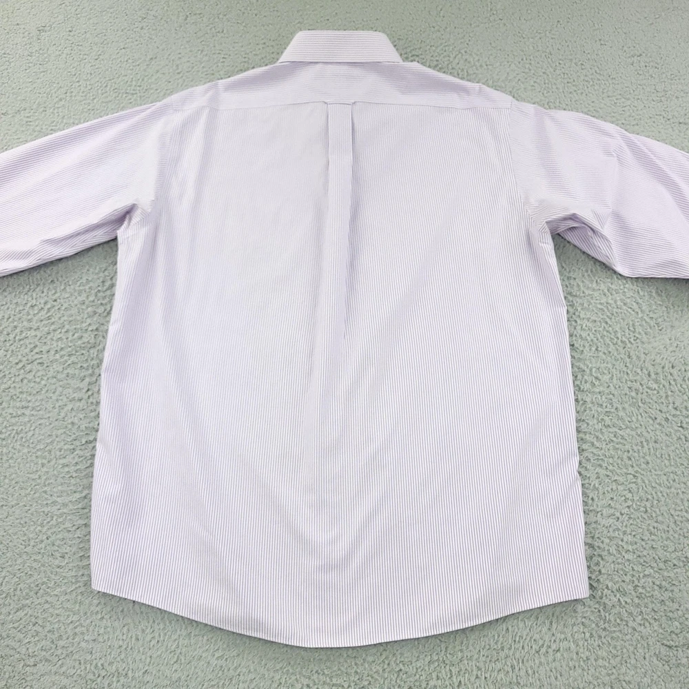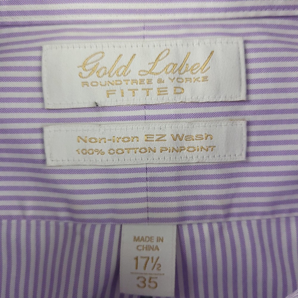 Roundtree & Yorke Gold Label Shirt Mens 17.5 35 Purple Stripe Fitted Non Iron Brand: Roundtree & Yorke Gold Label Style: Mens long sleeve fitted dress shirt with purple and white vertical stripe pattern. Color: Light purple and white stripe. Tag size: 17.5 inch neck, 35 sleeve (mens fitted). Material: 100% cotton pinpoint; non-iron EZ Wash fabric. Details: Point collar, front button closure, single chest pocket, barrel cuffs with two buttons, back box pleat, curved shirttail hem; made in China. Labels: Gold Label Roundtree & Yorke Fitted; Non-iron EZ Wash 100% Cotton Pinpoint. Measurements are included in the photos, compare measurements with your item to ensure proper fit. Items are added daily click here to Visit My Store Combined shipping for US customers is 1.99 for each additional item Items are cleaned per eBay standards & policies