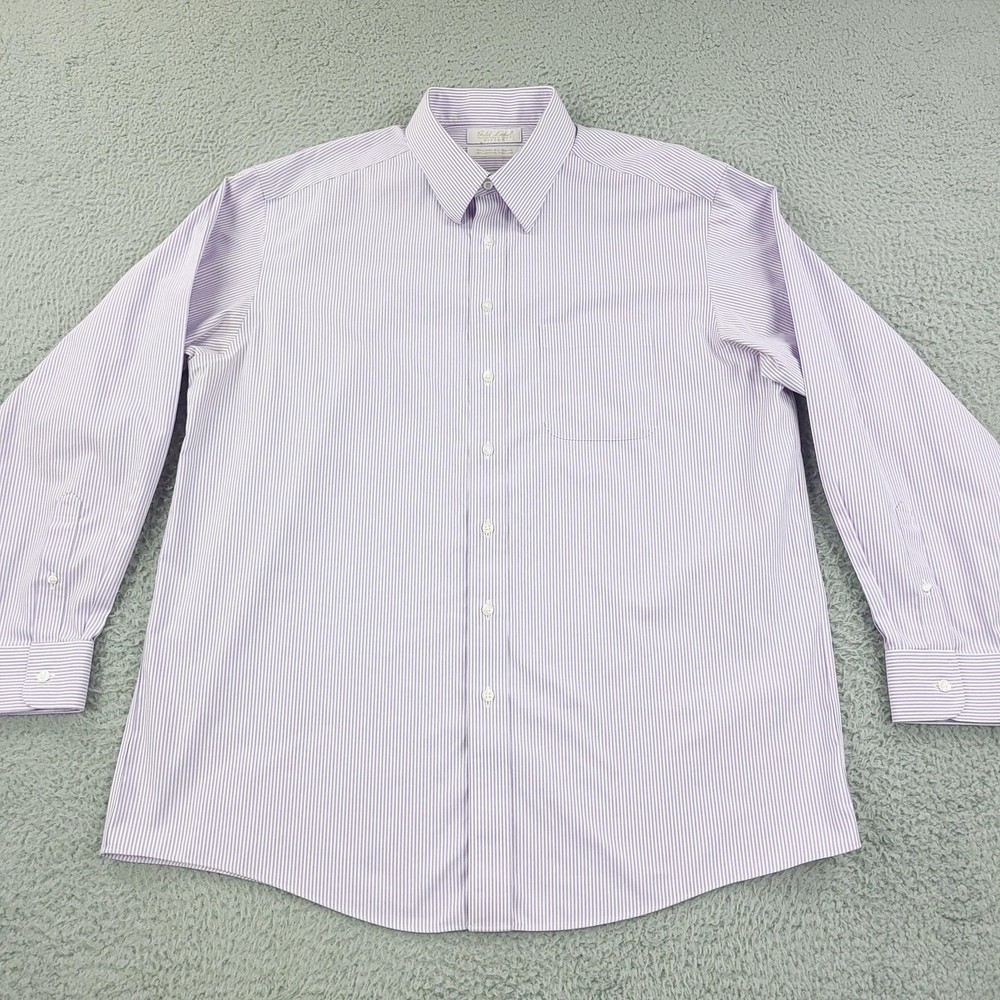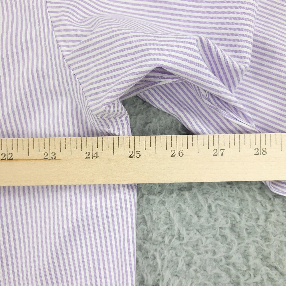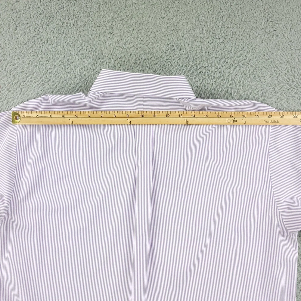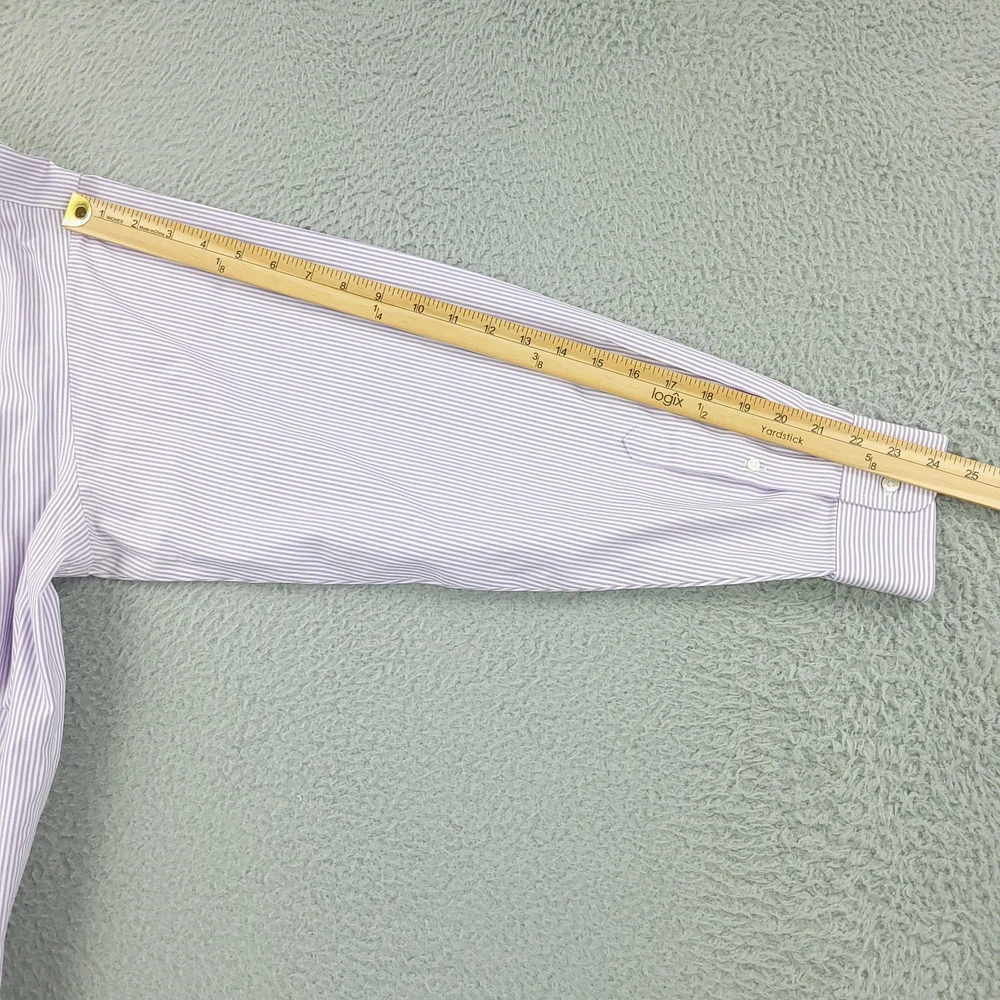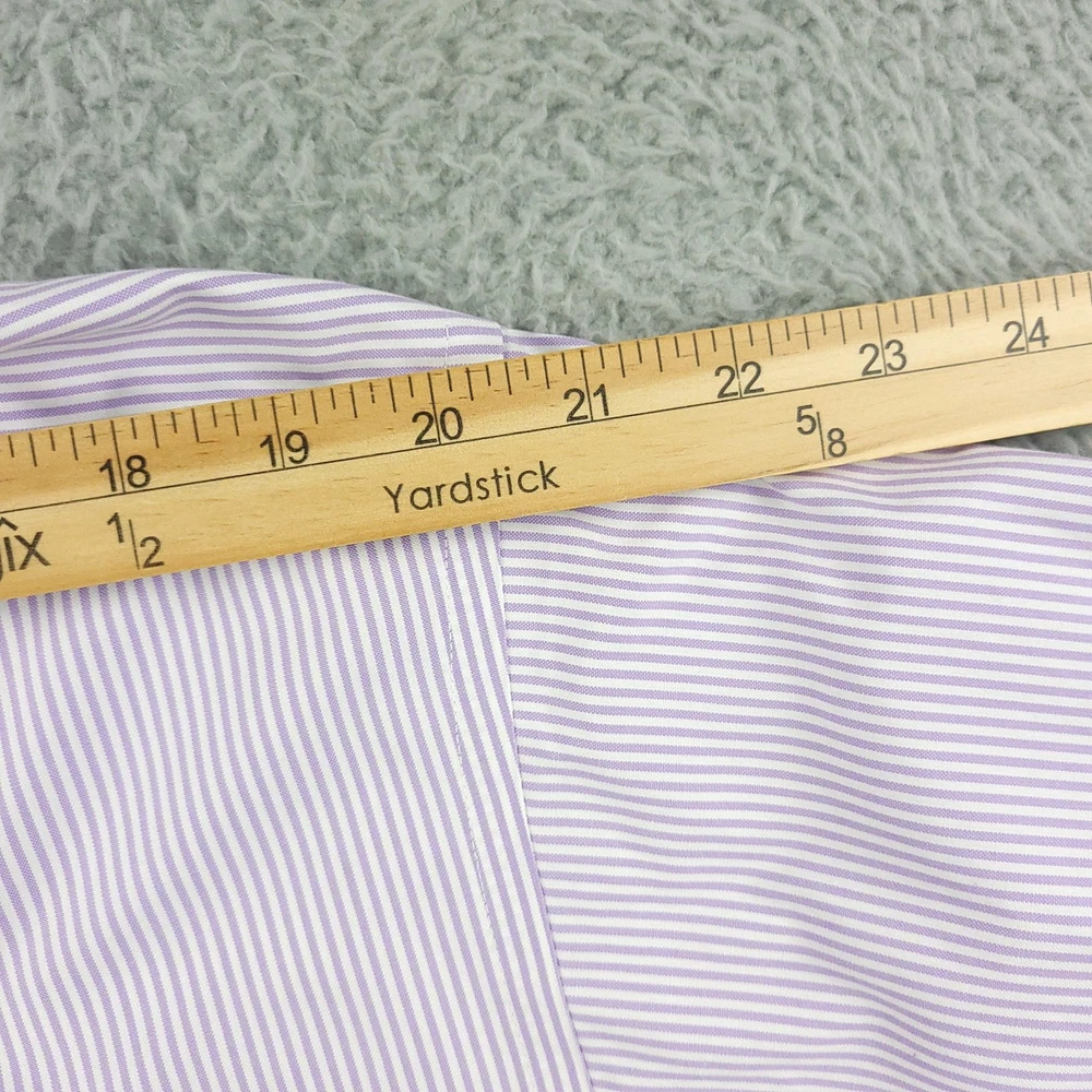 Roundtree & Yorke Gold Label Shirt Mens 17.5 35 Purple Stripe Fitted Non Iron Brand: Roundtree & Yorke Gold Label Style: Mens long sleeve fitted dress shirt with purple and white vertical stripe pattern. Color: Light purple and white stripe. Tag size: 17.5 inch neck, 35 sleeve (mens fitted). Material: 100% cotton pinpoint; non-iron EZ Wash fabric. Details: Point collar, front button closure, single chest pocket, barrel cuffs with two buttons, back box pleat, curved shirttail hem; made in China. Labels: Gold Label Roundtree & Yorke Fitted; Non-iron EZ Wash 100% Cotton Pinpoint. Measurements are included in the photos, compare measurements with your item to ensure proper fit. Items are added daily click here to Visit My Store Combined shipping for US customers is 1.99 for each additional item Items are cleaned per eBay standards & policies