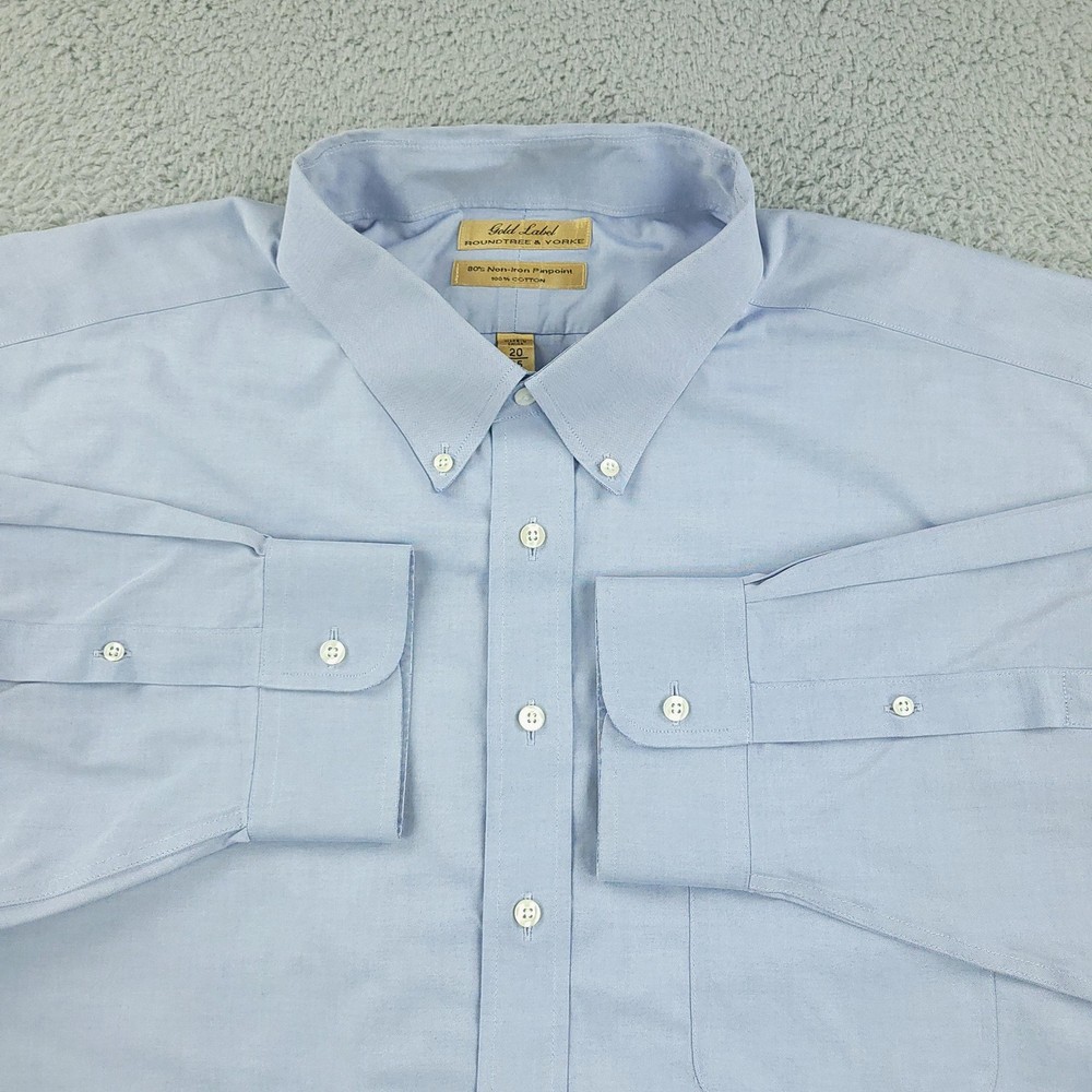 Roundtree & Yorke Gold Label Shirt Mens 2XL Blue Button Down Non-Iron Cotton Big Condition: Gently worn 80s Non-Iron Pinpoint 100% Cotton Color: Light blue Button-down collar, single chest pocket, and button cuffs Features Gold Label and 80s Non-Iron Pinpoint 100% Cotton stitched brand and style tags Tag size: 20 35 Big (fits like Mens 2XL) Made in China Classic dress shirt style, ideal for business or formal occasions Washed and dried with Fragrance Free Detergent & Dryer Sheets. Measurements are included in the photos, compare measurements with your item to ensure proper fit. (Measurements are done with the item lying flat). I ship next business day and all items include tracking. Items are added daily to my store Visit My Store Buy More & Save! Combined shipping for US customers - $1.99 for each additional item (Add items to shopping cart and discounts will automatically calculate during checkout)