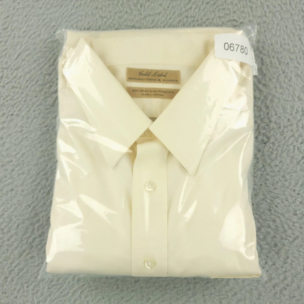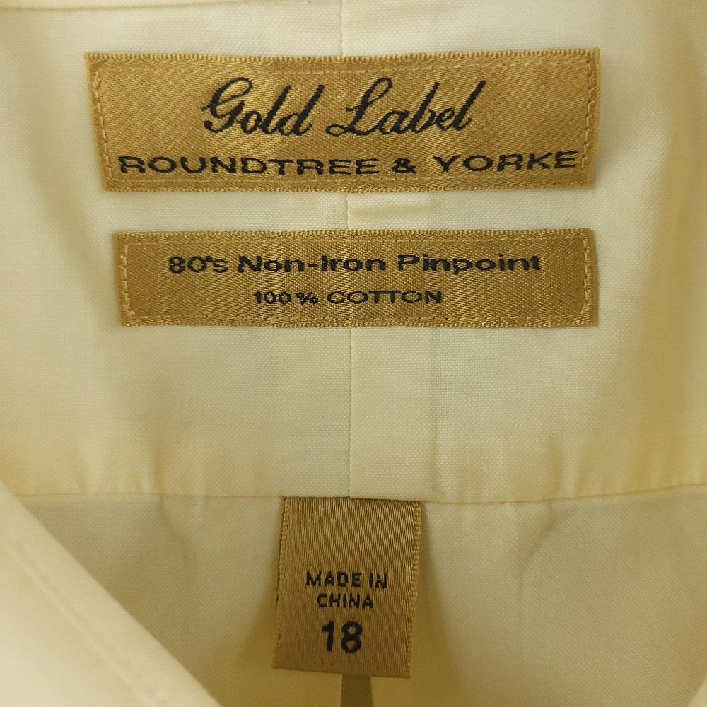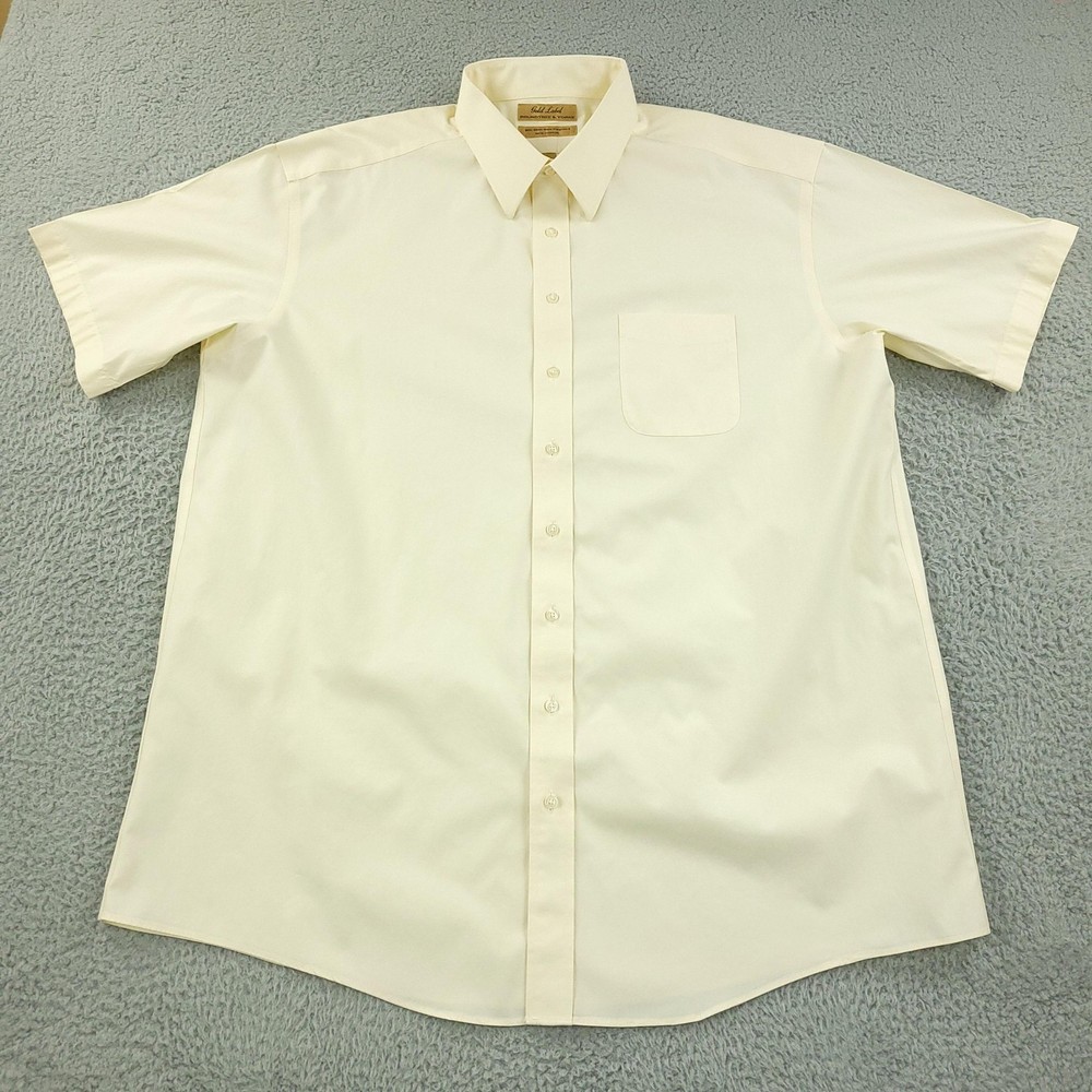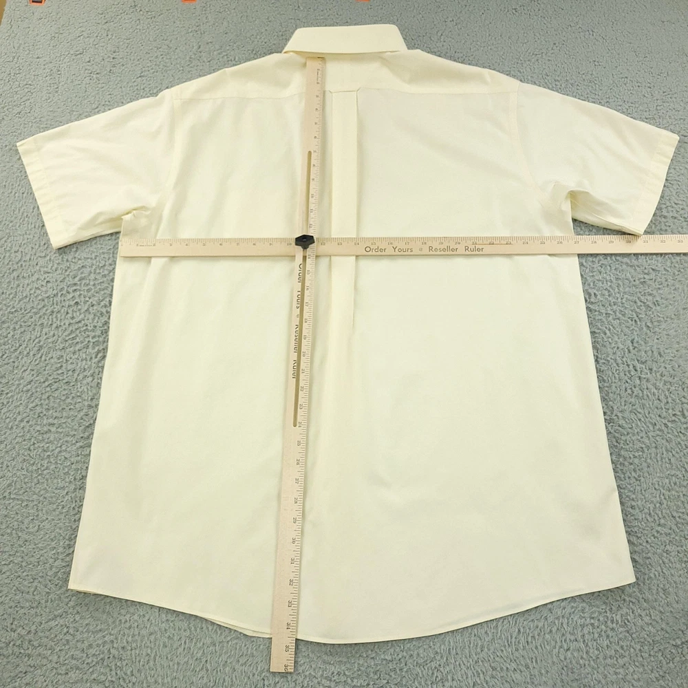 Brand: Gold Label Roundtree & Yorke. Style: Mens short sleeve button front dress shirt with point collar and single chest pocket. Color: White / off white. Material: 100% cotton 80's Non-Iron Pinpoint fabric. Size on tag: 18. Made in China. Details: Gold Label branding at inner neck, non-iron easy care cotton, curved shirttail hem, back yoke with box pleat for ease, classic business or casual wear. Washed and dried with Fragrance Free Detergent & Dryer Sheets. Measurements are included in the photos, compare measurements with your item to ensure proper fit. (Measurements are done with the item lying flat). I ship next business day and all items include tracking. Items are added daily to my store