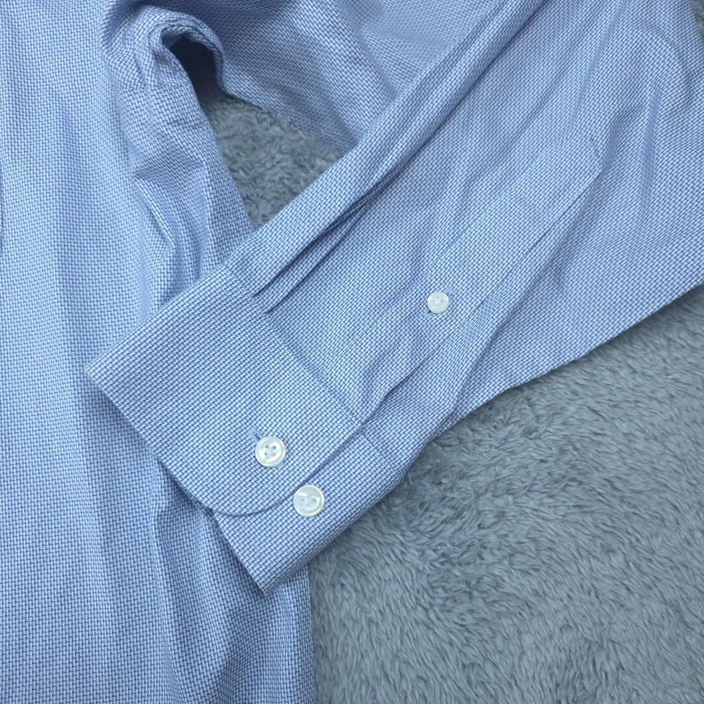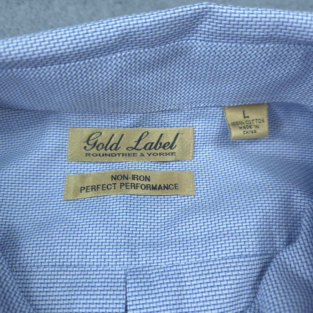 Brand: Roundtree & Yorke Style: Men's long sleeve non-iron button-down dress shirt from the Gold Label collection. Color: Light blue micro check pattern. Tag size: L (men's Large classic fit). Material: 100% cotton per inner neck size tag. Features: Button-down collar, full front button closure, single chest pocket, long sleeves with two-button adjustable barrel cuffs, back box pleat for ease of movement, and a curved shirttail hem designed to stay tucked. Branding: Gold Label Roundtree & Yorke woven neck label plus additional inner collar tag reading "Non-Iron Perfect Performance." Country of origin: Made in China. Use: Versatile business or casual shirt suitable for office wear, business casual outfits, or everyday smart styling.