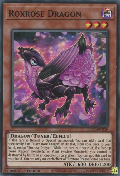 Features:1st Editionbrand:KonamiLevel:3Rarity:Super RareAttribute/MTG:Color:DarkCreature/Monster Type:DragonManufacturer:KonamiLanguage:EnglishSet:Lightning OverdriveCard Text:If this card is Normal or Special Summoned: You can add 1 card that specifically lists "Black Rose Dragon" in its text, from your Deck to your hand, except "Roxrose Dragon". While this card is in your GY, if a face-up "Rose Dragon" monster(s) or Plant Synchro Monster(s) you control is destroyed by battle or an opponent's card effect: You can add this card to your hand. You can only use each effect of "Roxrose Dragon" once per turn.Defense/Toughness:1200Card Type:Effect, TunerAttack/Power:1600Card Number:LIOV-EN009Game:Yu-Gi-Oh! TCGCard Name:Roxrose DragonAdditional Description:Roxrose Dragon
