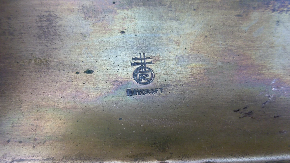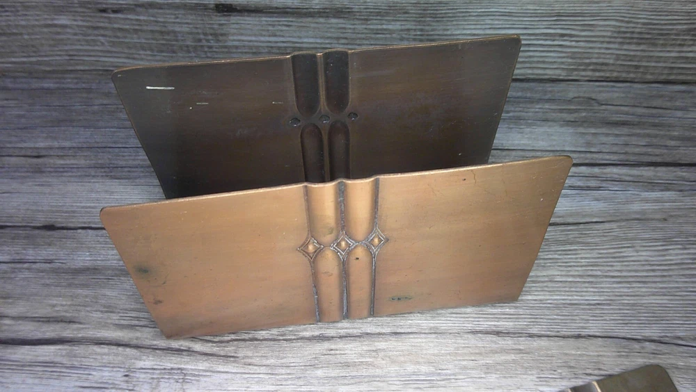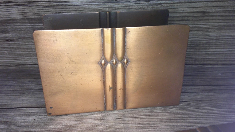 This beautifully designed letter holder and letter opener set by Roy Croft showcases stunning art deco features. Crafted from high-quality cooper metal, this vintage piece is not only elegant but also durable. Made in the United States, this handmade set is perfect for collectors of desktop items and pens & writing instruments. Ideal for use at home or in the office, this letter holder and letter opener set is a unique addition to any collection. Whether you are a fan of vintage items or appreciate the art deco style, this piece is sure to impress. Don't miss out on the chance to own a piece of history with this Roy Croft cooper metal set. See photos the letter holder is 3 1/4" high and 4 7/8" wide and the letter opener is 7 3/4" long and 1 1/4" wide at the handle