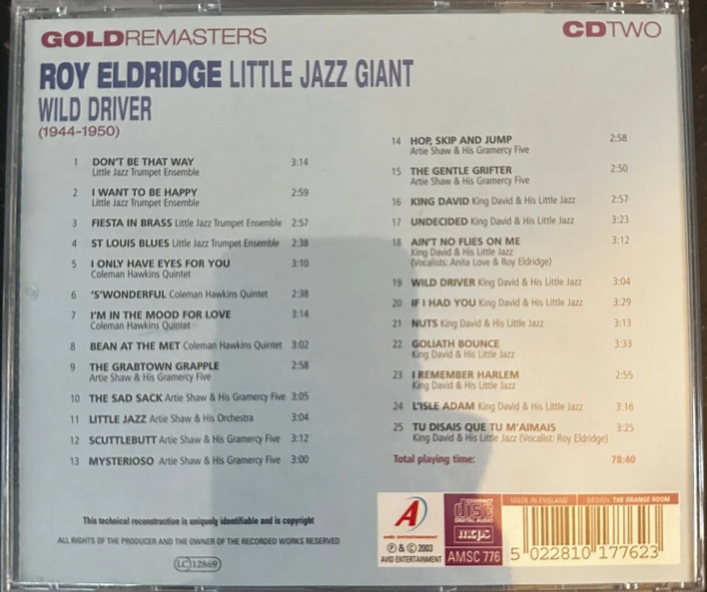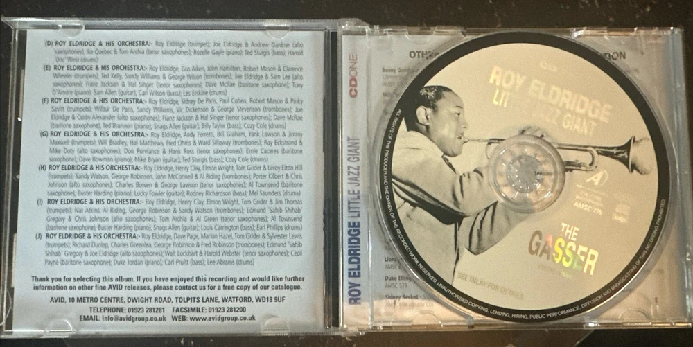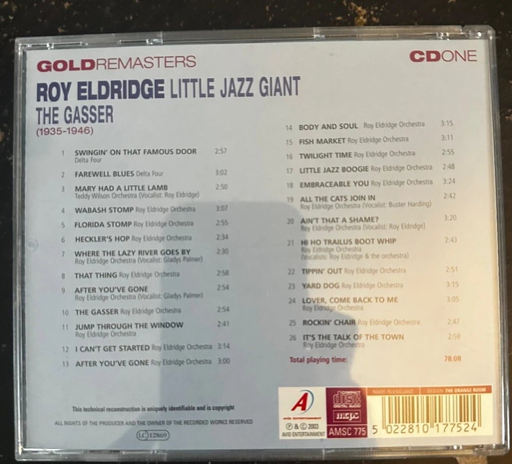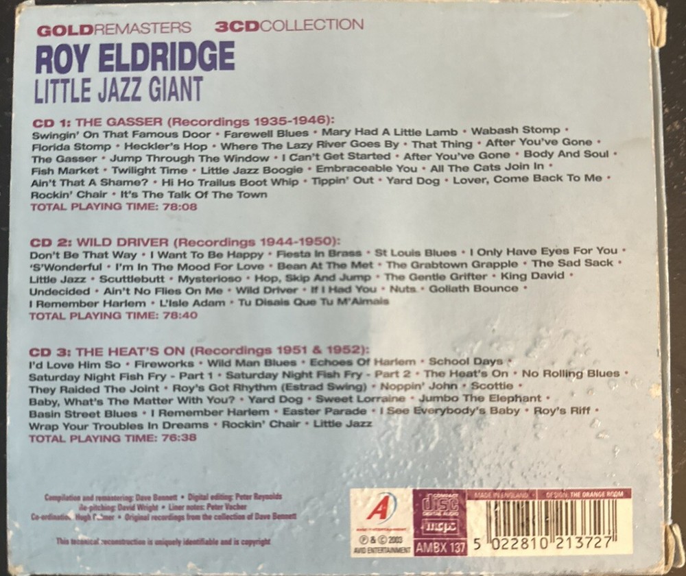 Format: CD Artist: Eldridge, Roy Release Title: Little Jazz Giant Type: Box Set Case Condition: Good (G) Catalog Number: AMBX 137 Run Time: 78:08/78:40/76:36 Style: Big Band & Swing, Bebop, Bop, 1930s, 1940s, 1950s Era: 1940s CD Grading: Excellent (EX) Record Label: Avid Records UK Release Year: 2004 Country/Region of Manufacture: United Kingdom UPC: 5022810213727 Features: Import, Original Cover, Original Inner Sleeve Inlay Condition: Excellent (EX) gtin13: 5022810213727 Case Type: Cardboard Sleeve Genre: Jazz