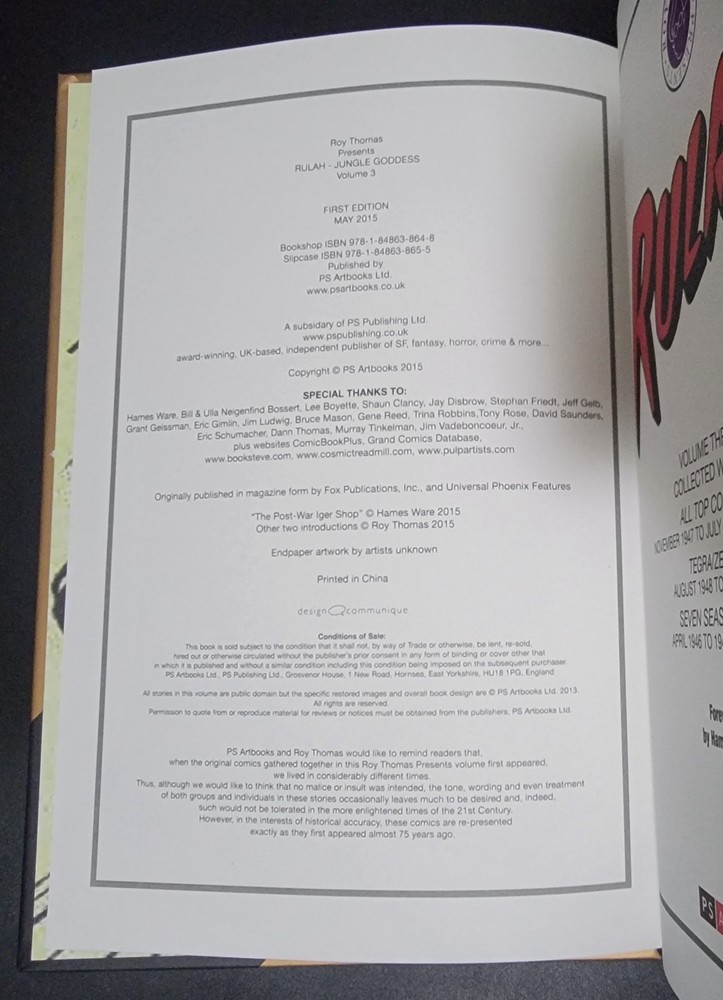 Link to our BEST items!! Link to our ENDING items!! Link to our FAQ page !! Link to our NEWEST items!! Item: Roy Thomas Presents Rulah Jungle Goddess Vol 3 HC 2015 PS Artbooks Matt Baker NM Special Notes: This hardcover is a first printing. We do not use stock photos! What you see in the pictures is what you will be getting. Publisher/Date: PS Artbooks 2015 Condition: Dust Jacket : None, never had any Book : Near Mint (9.4) The hardcover will be shipped bagged for protection. SHIPPING: All pricing is based on the weight of the package and your location. Package Weight: 3 lb[s] Package Size: 14x12x6 We charge exact shipping costs per USPS with NO handling charge. You can check our shipping quotes on the USPS website. For the convenience of the winner, we offer shipment via Priority Mail or Media Mail, when shipping to an address inside the USA. For International Winners, we offer Priority Mail International or First-Class International Mail. Please click on the "SHIPMENTS and PAYMENTS" tab above for more details. * FREE Insurance, for items totaling under $100.00, is only available when shipping with USPS Priority to an address within in the USA! All packages will have a tracking number sent to the winner! Shipping & Payment Terms: If you would like to have your item insured, please contact us and we will send you an invoice with the adjusted shipping charges. We will be happy to combine the shipping charge for multiple auction wins . If you win a single item, you do not have to wait for an invoice to make your payment. IF YOU WIN MULTIPLE AUCTIONS, PLEASE WAIT UNTIL WE SEND YOU A COMBINED INVOICE BEFORE PAYING FOR YOUR ITEMS. Please DO NOT pay for items separately. We will ship your items within 2 business days upon receiving your payment. Payment Options: PayPal is the preferred method of payment per eBay's policies. If you do not have a PayPal account, we do accept credit card payments over the phone. Payment MUST be received within 7 business days of the auction ending or your bid will be cancelled and eBay will be contacted. Questions: We will be happy to answer any questions you have about our items before the auction ends. Please ask your questions as early as possible so we have plenty of time to answer them. Return Policy: All returns MUST be approved by Duncanville Bookstore. If there is a problem with your order, please give us a chance to address the issue before you leave negative feedback and/or contact PayPal for a refund. Store Info: Please check our other auctions and our eBay store for more great deals!! Check out our info page for more great ways to get in touch with us. Also, feel free to contact us if you are looking for anything in particular or you are looking to sell your items. We are always buying!! Duncanville Bookstore is open 7 Days a Week 10am-7pm CST!!